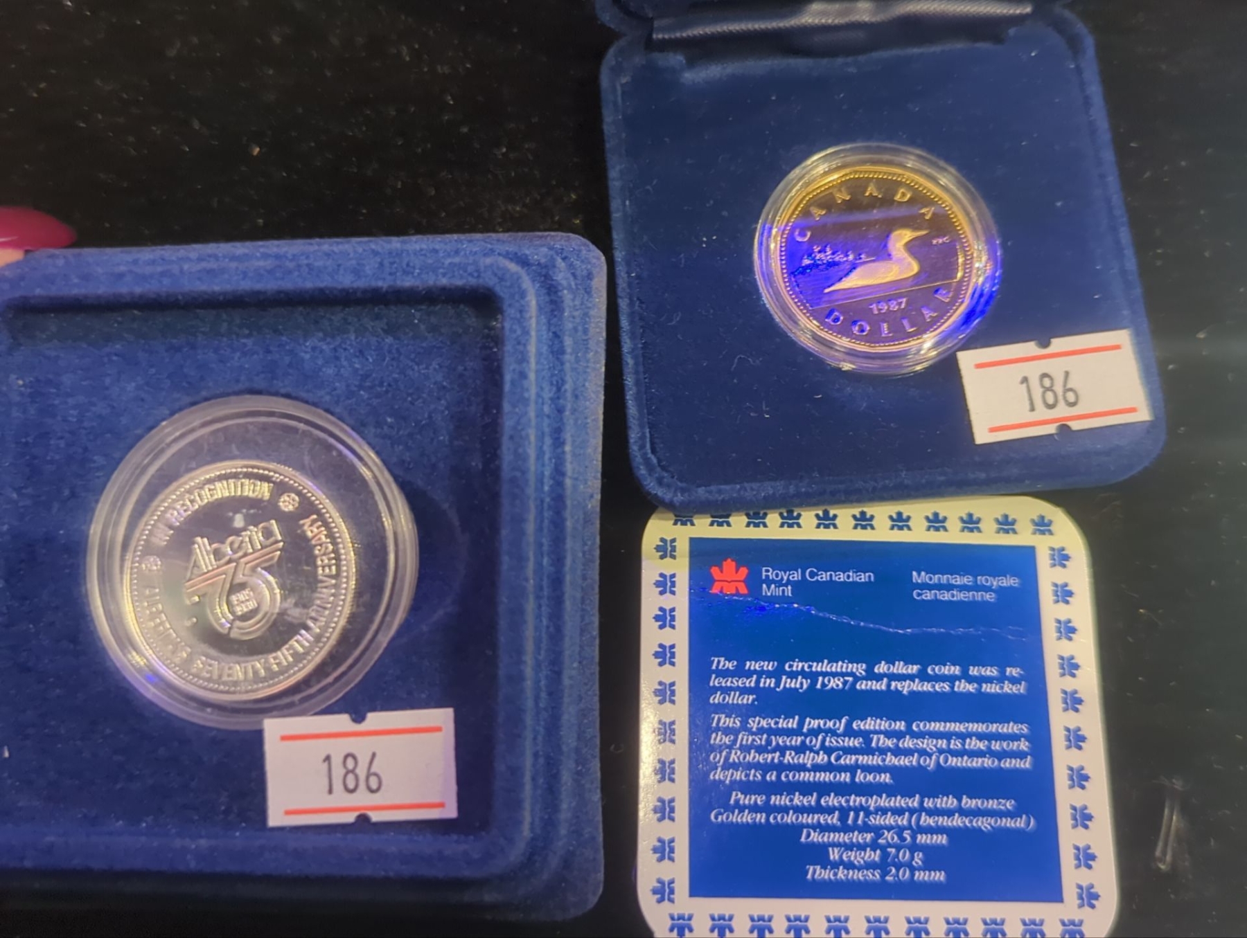 RCM 1987 The First Year of Issue Proof Nickel-Copper Loonie, 1980 Alberta's 75th Anniversary Silver 9.25 Medallion 10.47g