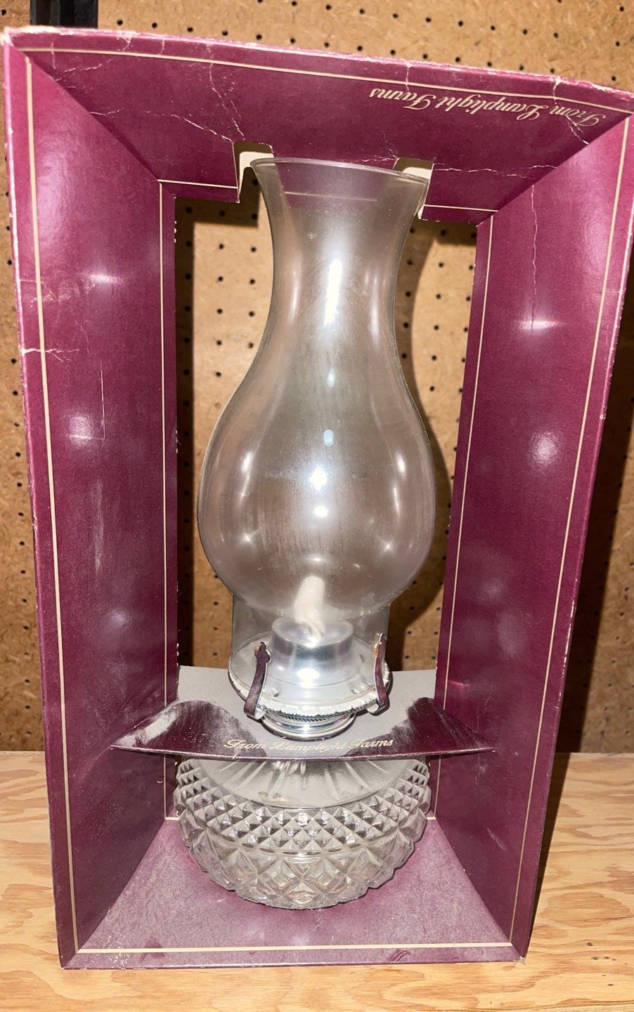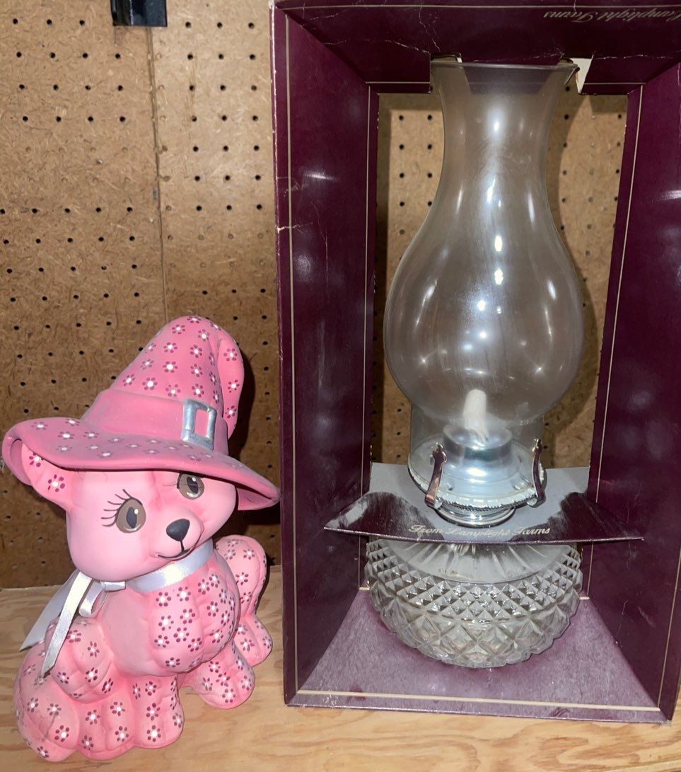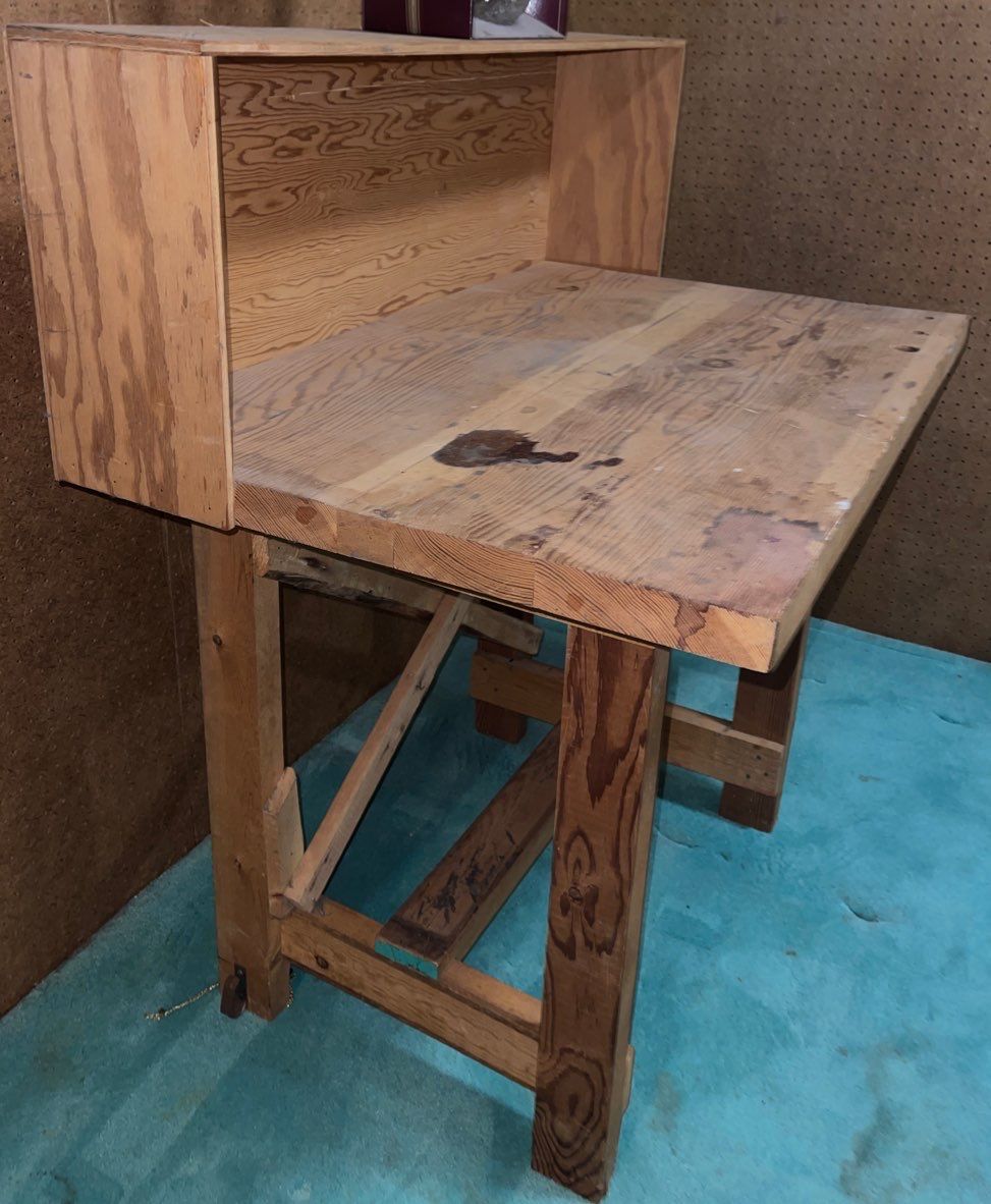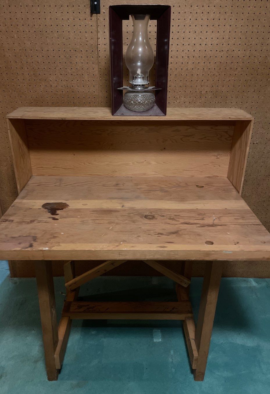 Raw Wood Desk 43x42 w/ Antique Hurricane Lamp