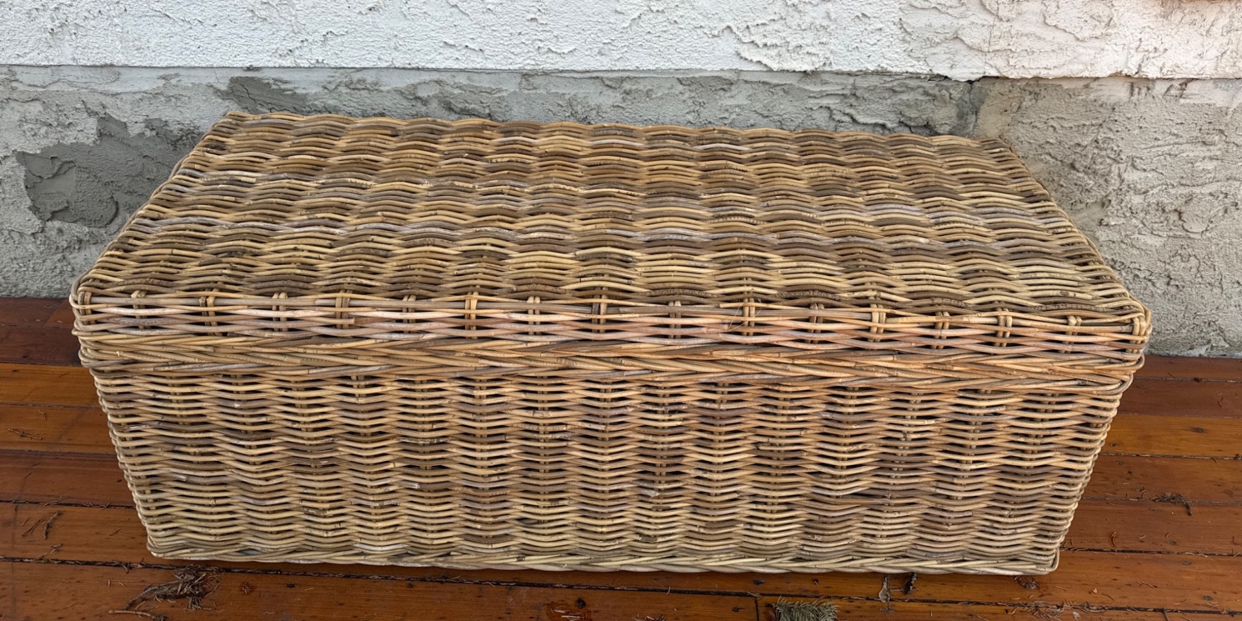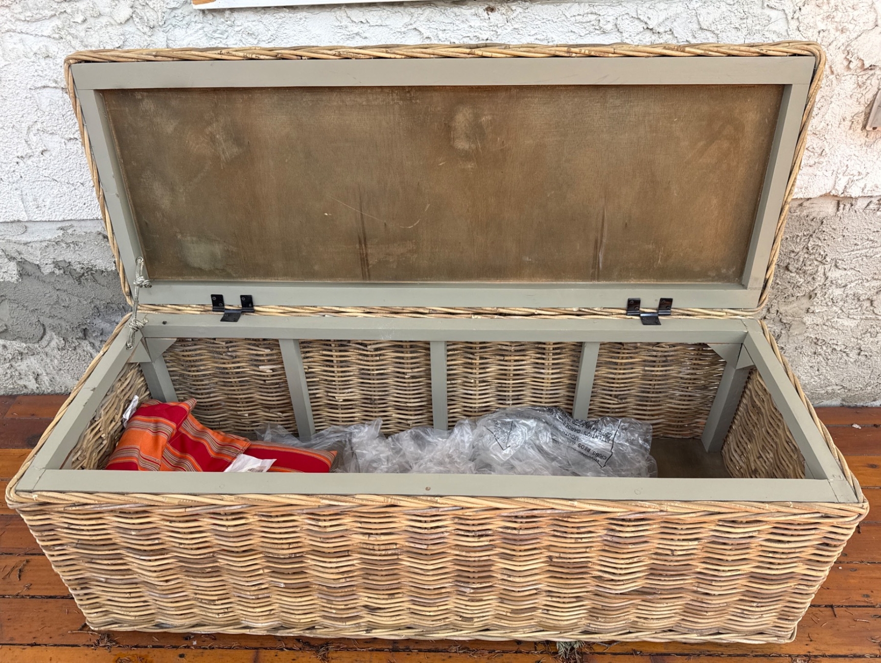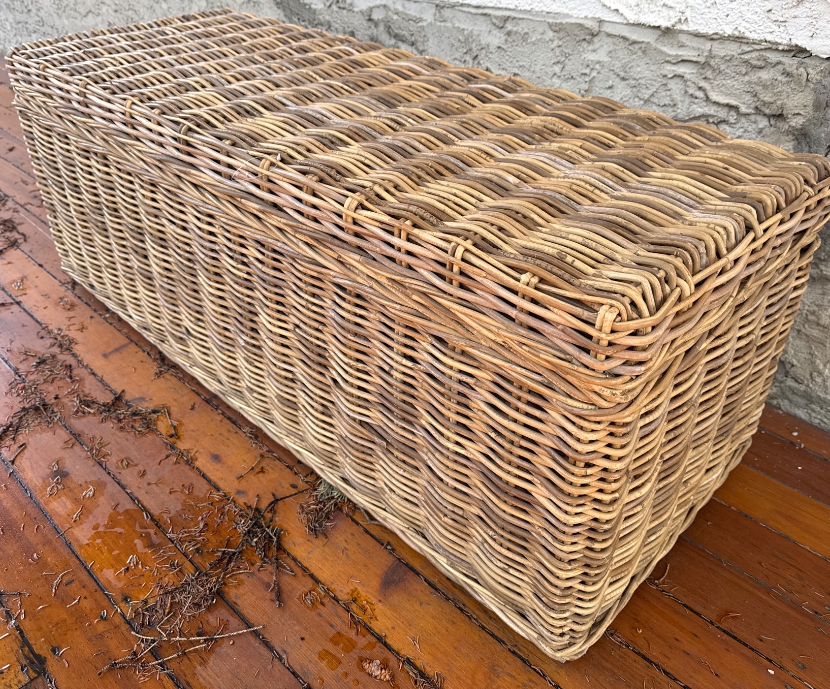 Rectangular wicker storage trunk featuring a sturdy woven design and a hinged lid. The internal frame appears to be reinforced with a wooden structure for added durability. Perfect for storing household items or as functional decor. The trunk is spacious and versatile, measuring approximately 48 inches in length, 20 inches in width, and 18 inches in height.