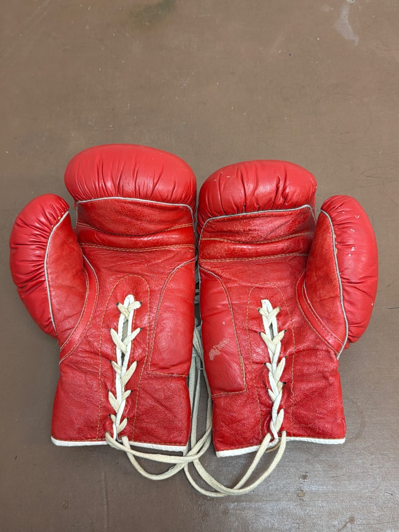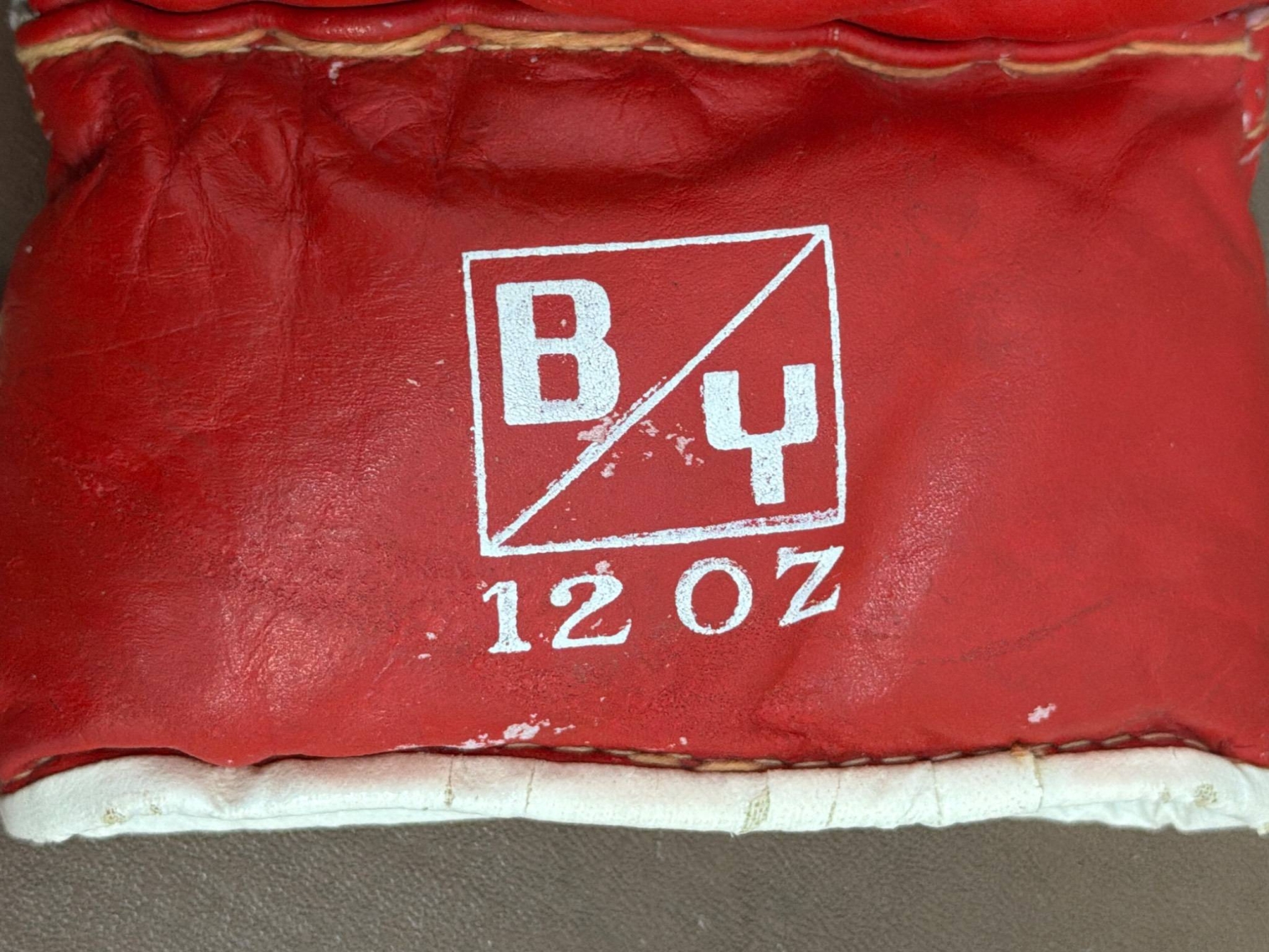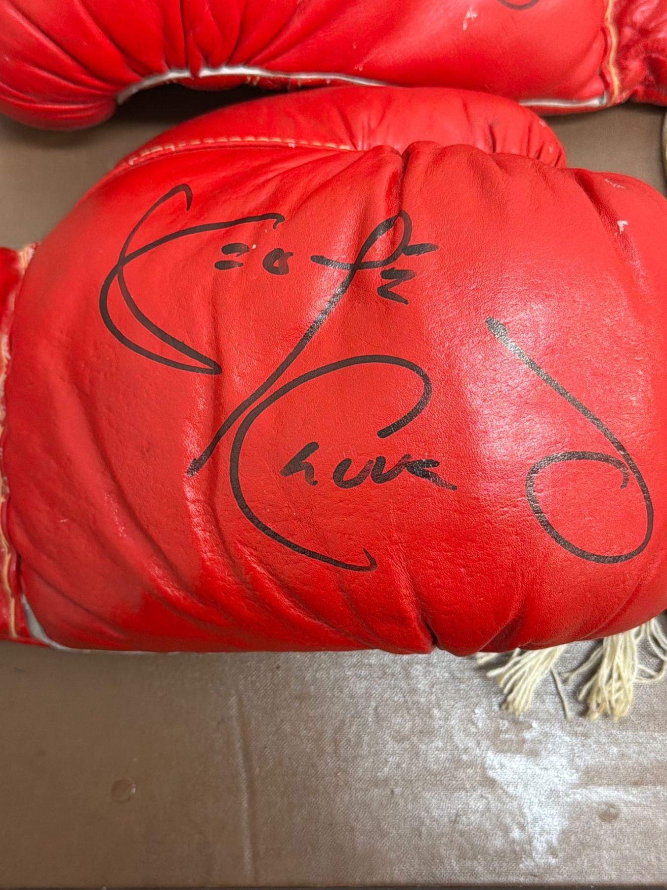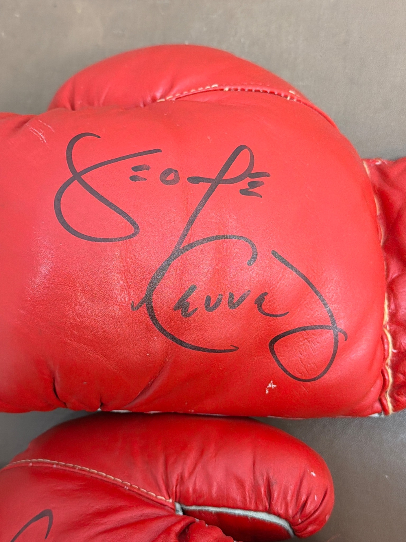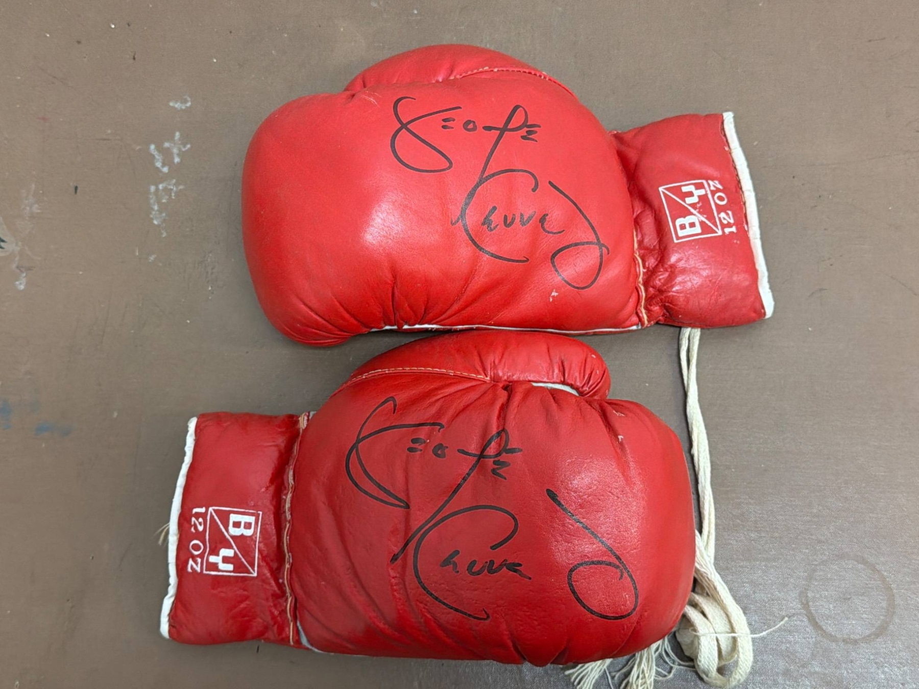 12oz red boxing gloves featuring a lace-up design and signed prominently in black marker. The gloves feature "B4" branding on the cuffs and are in used condition, showing some wear consistent with prior use. A great collectible for boxing enthusiasts or autograph seekers.