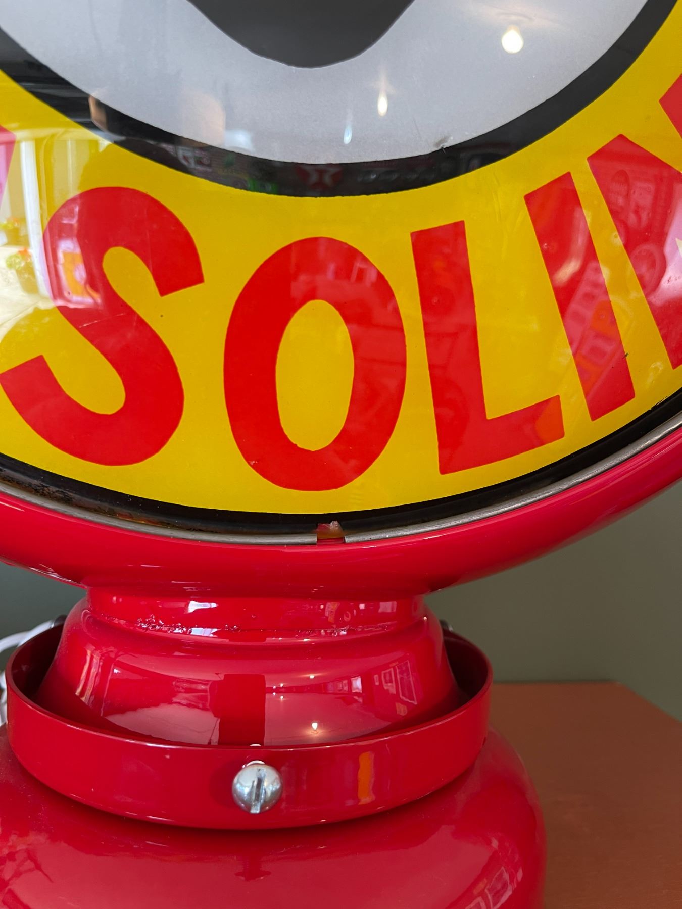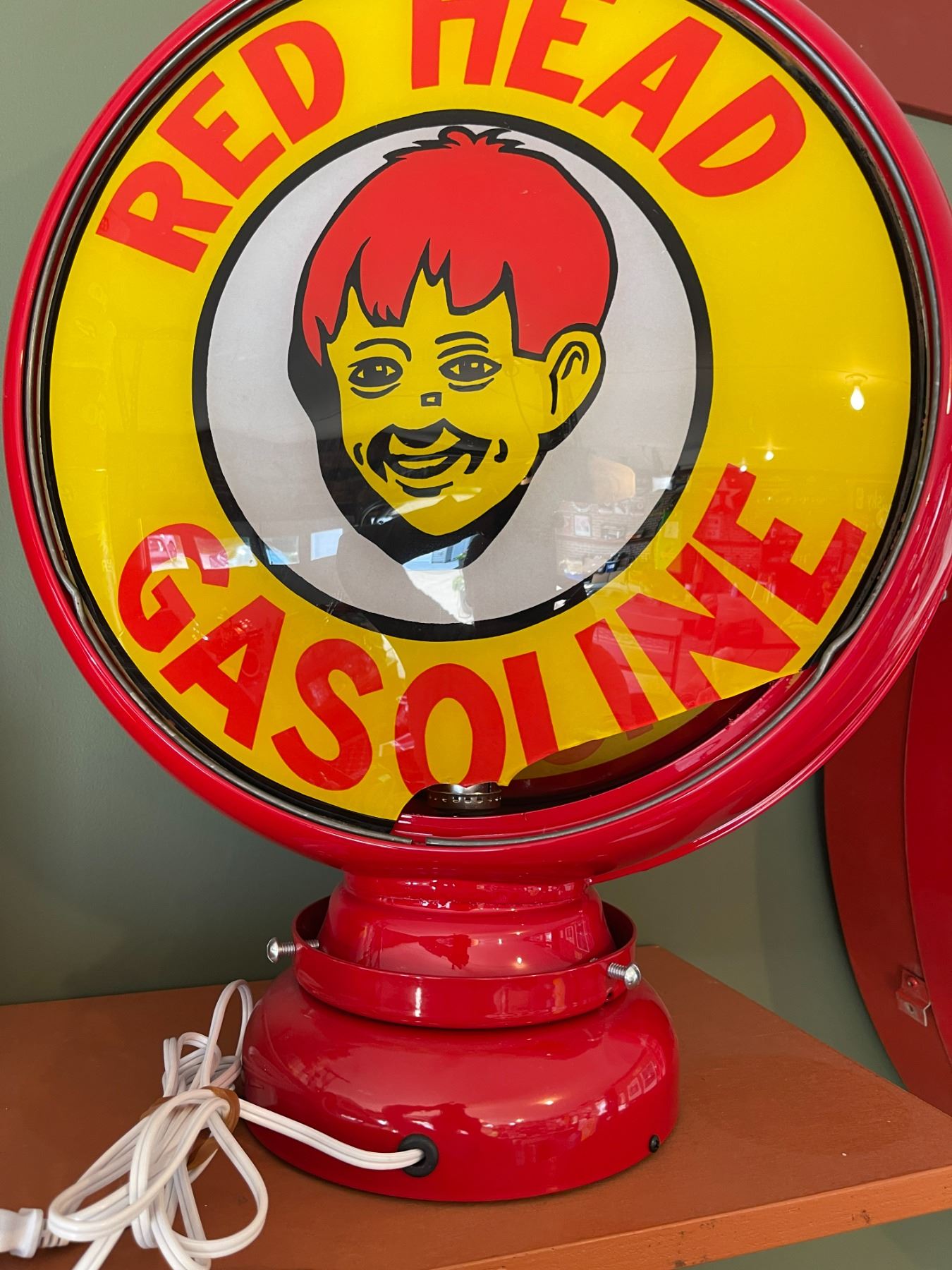 Red Head Gasoline Original Glass On Base - Holder is Repro - Small Chip on Rear Glass