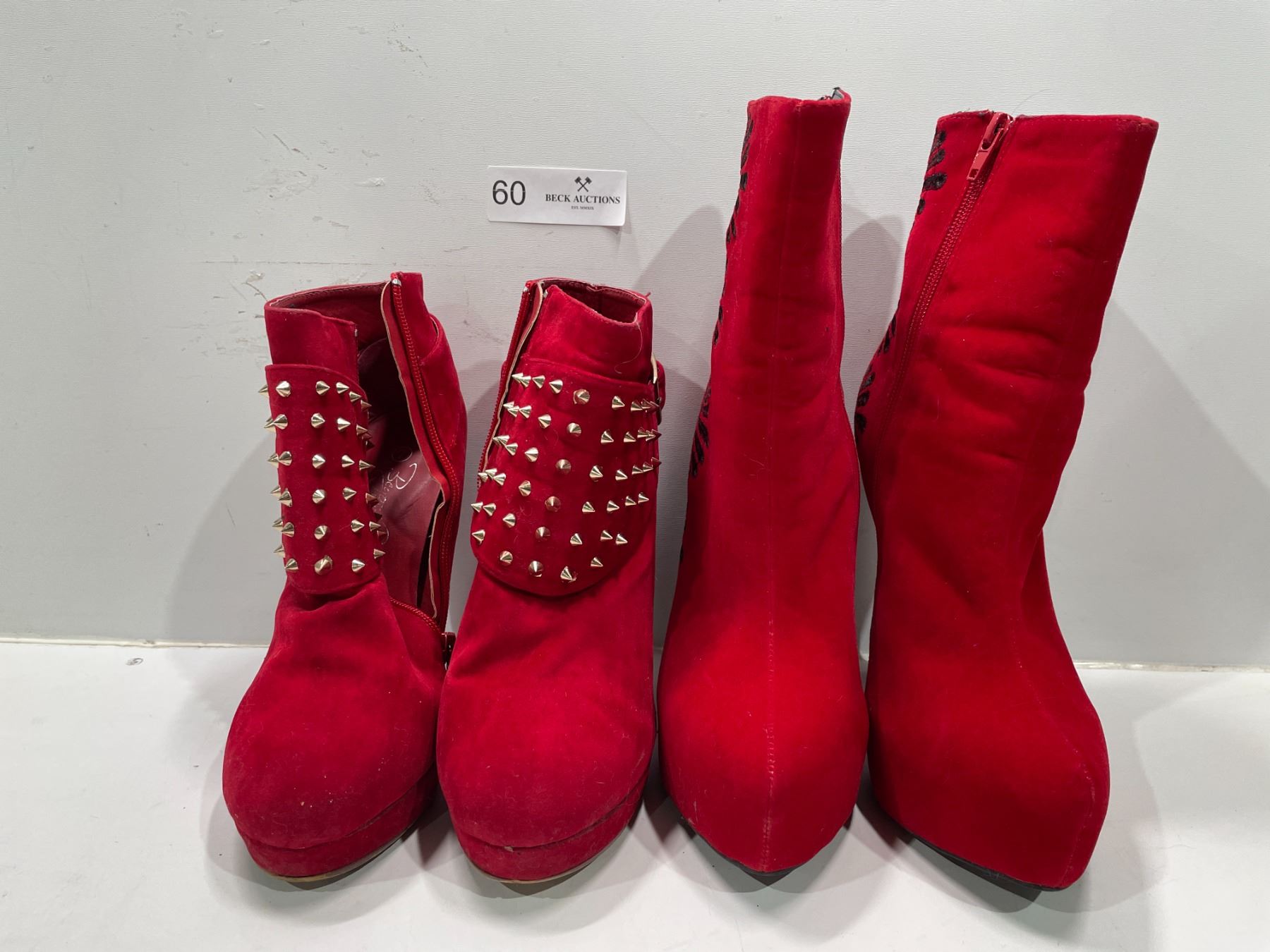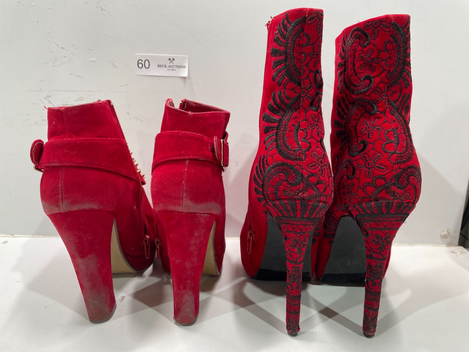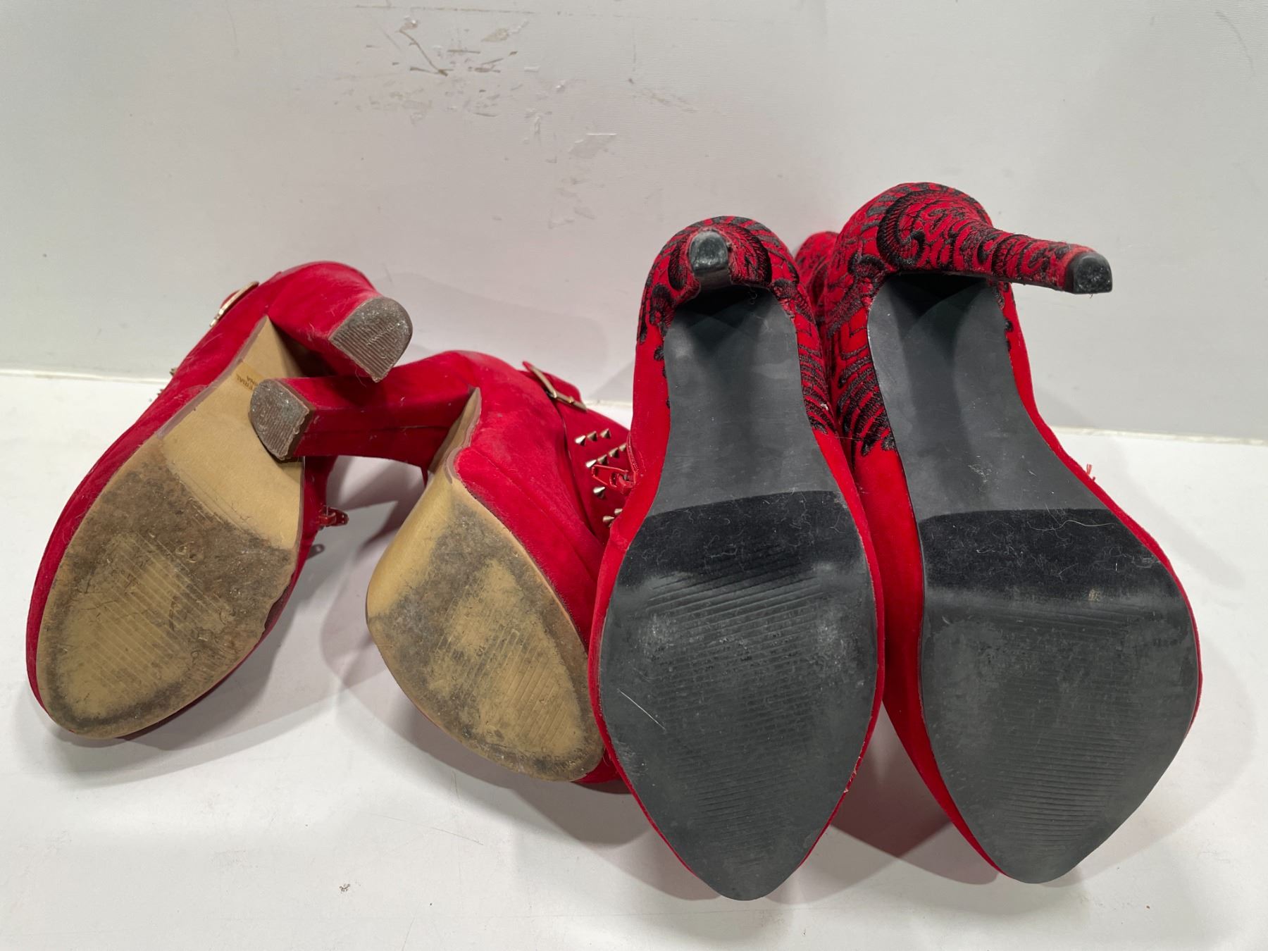 Red Suede Stilleto Boots With Floral Design On Heel And Beyond Red Suede Studded Pumps Both Womens 7