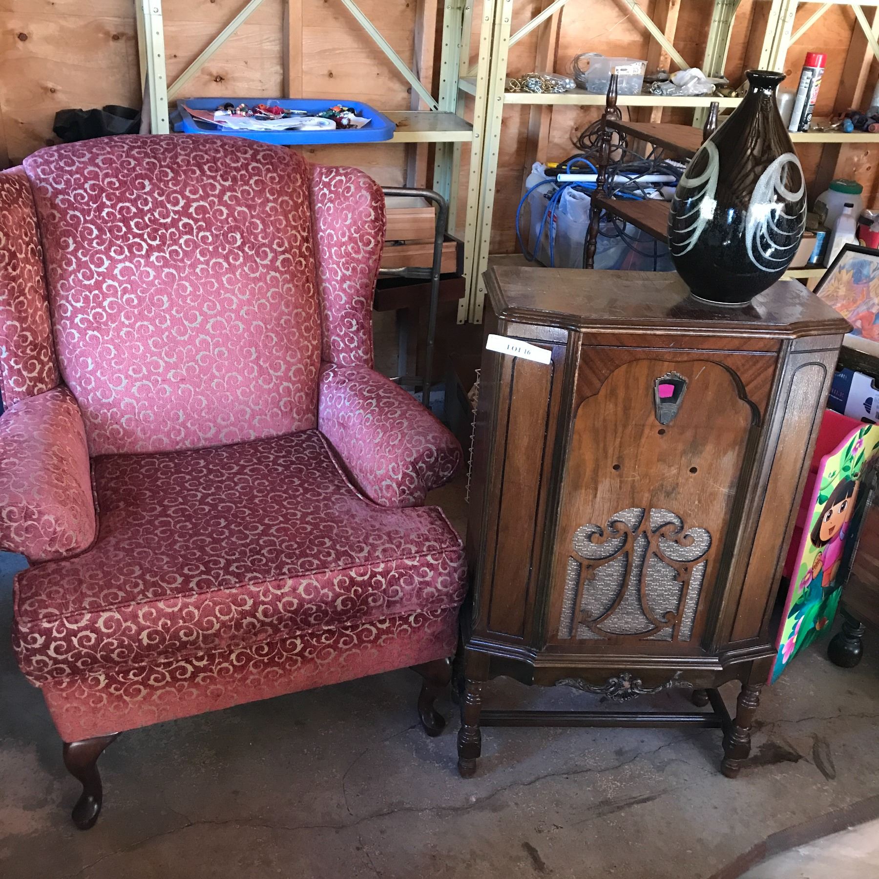 chair (34" W, 41" H, 38" D), Radio cabinet (22.5" W, 38" H, 11" D)