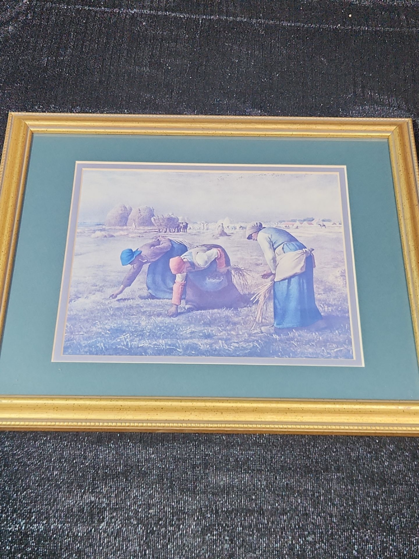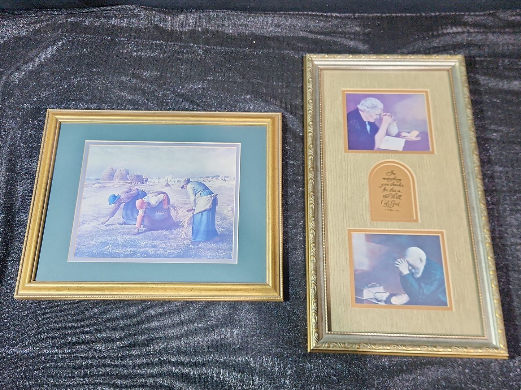 This is duo pair of a framed religious piece quoting bible verse, and a print of the art " The Gleaners" by artist Jean-Francois Millet.