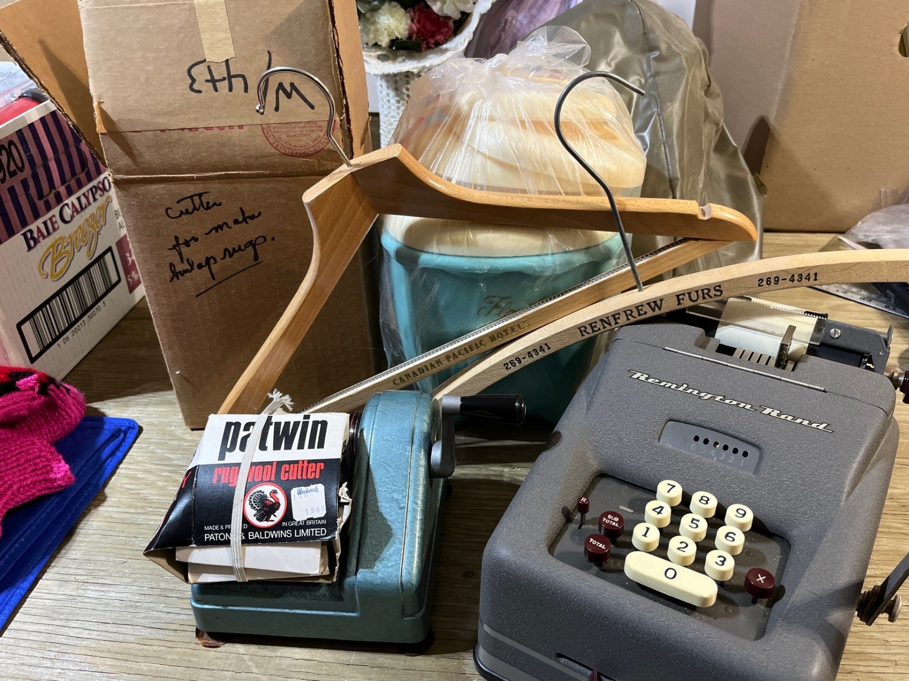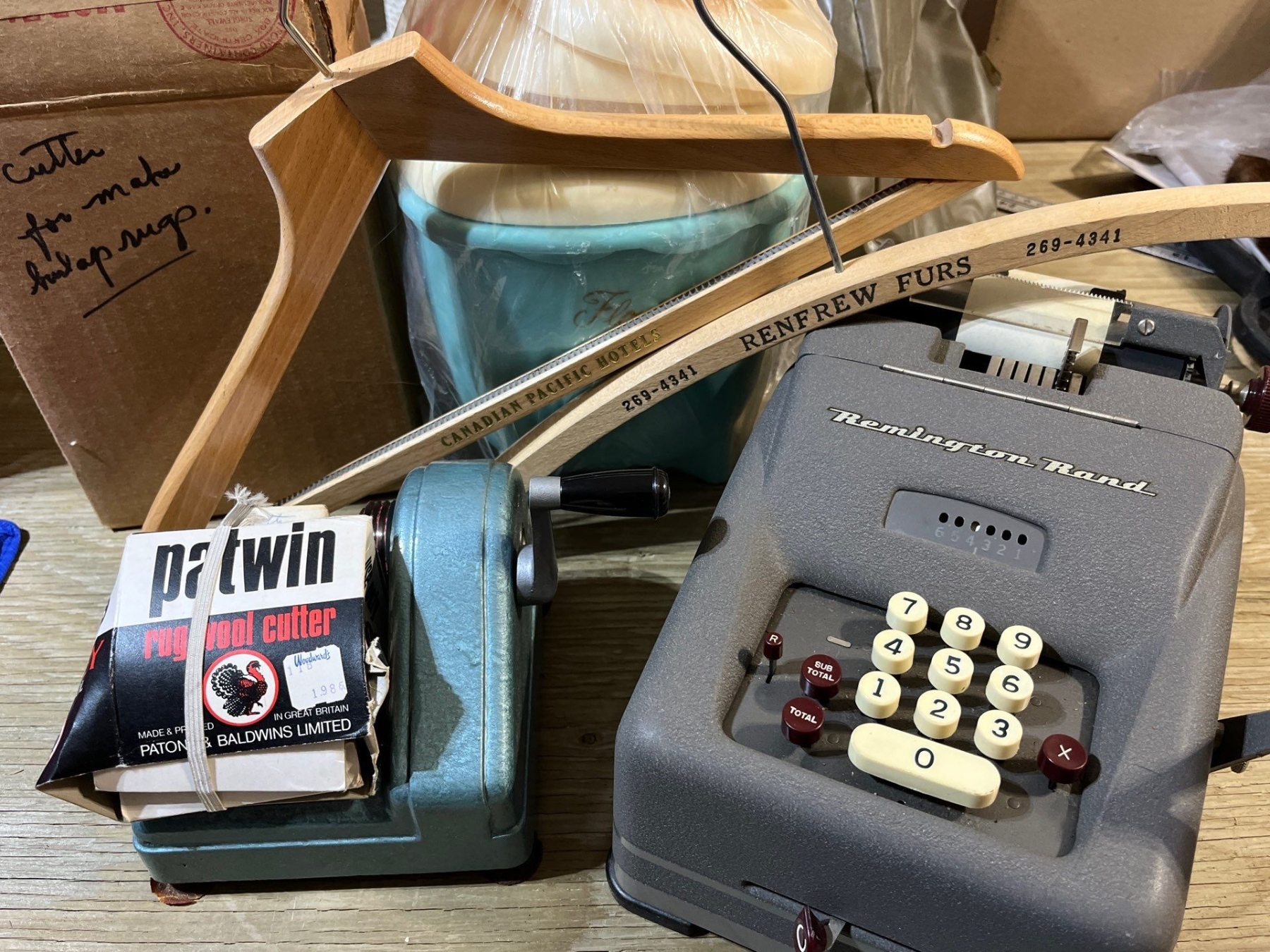 Remington ran adding machine, vintage carpet cutter, two wooden coat, hangers, and vintage baby blue
