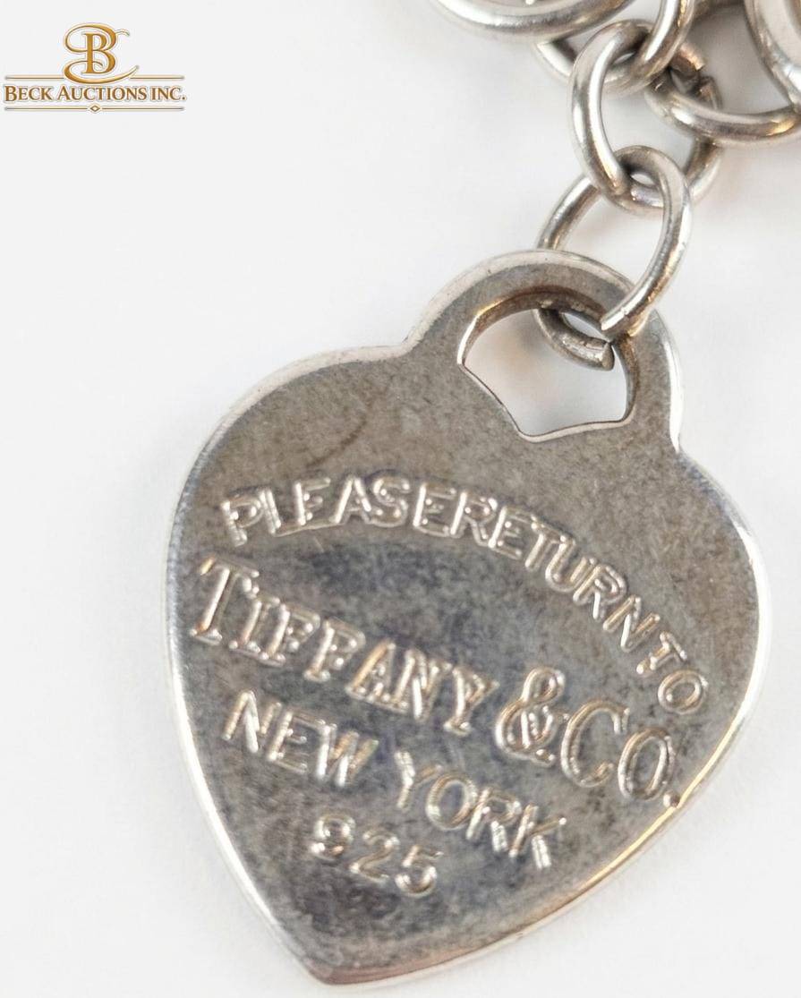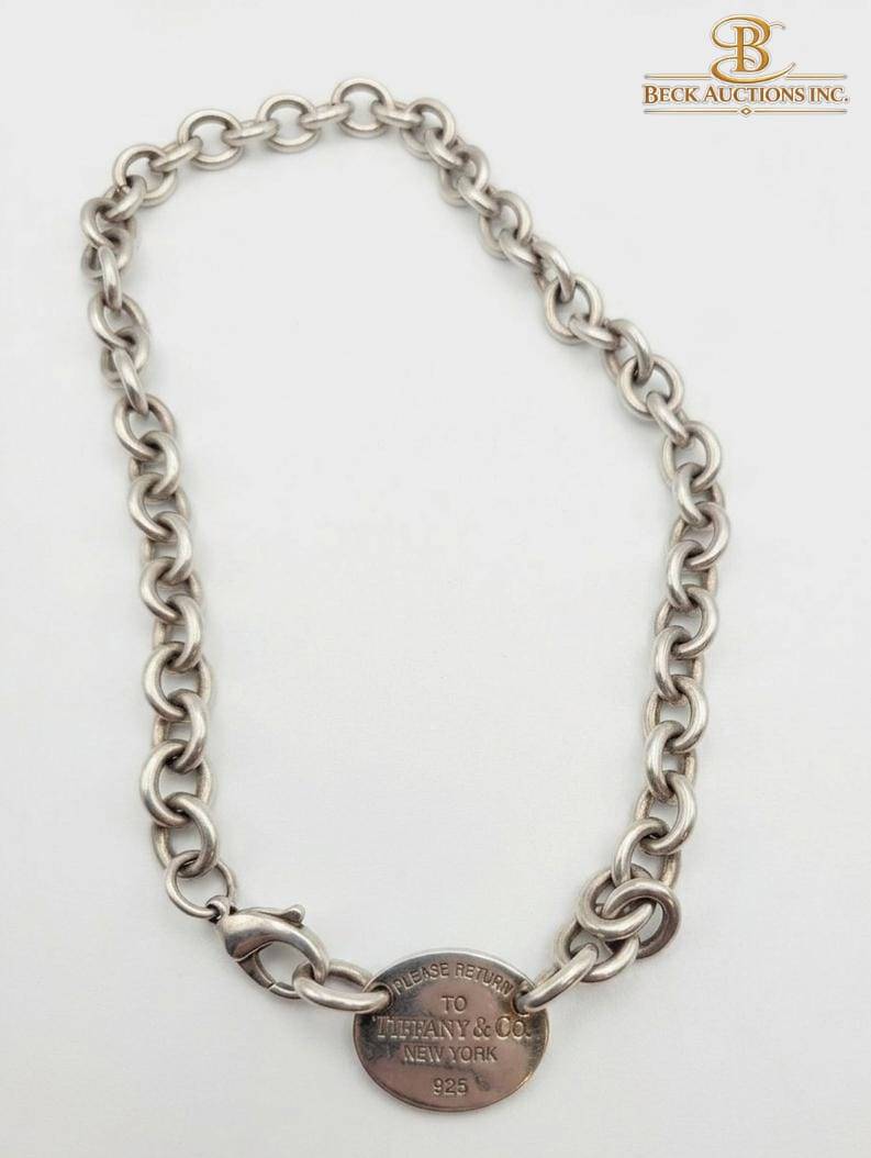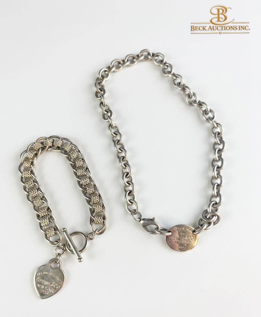 This set features a replika Tiffany & Co. necklace and bracelet, both adorned with signature tags. The necklace bears an oval tag engraved with ‘Please Return to Tiffany & Co. New York 925,’ and measures approximately 16 inches in length. The matching bracelet has a heart-shaped tag with a similar inscription and measures roughly 7.5 inches. Both pieces are crafted to resemble iconic designs, showcasing sturdy link chain construction.