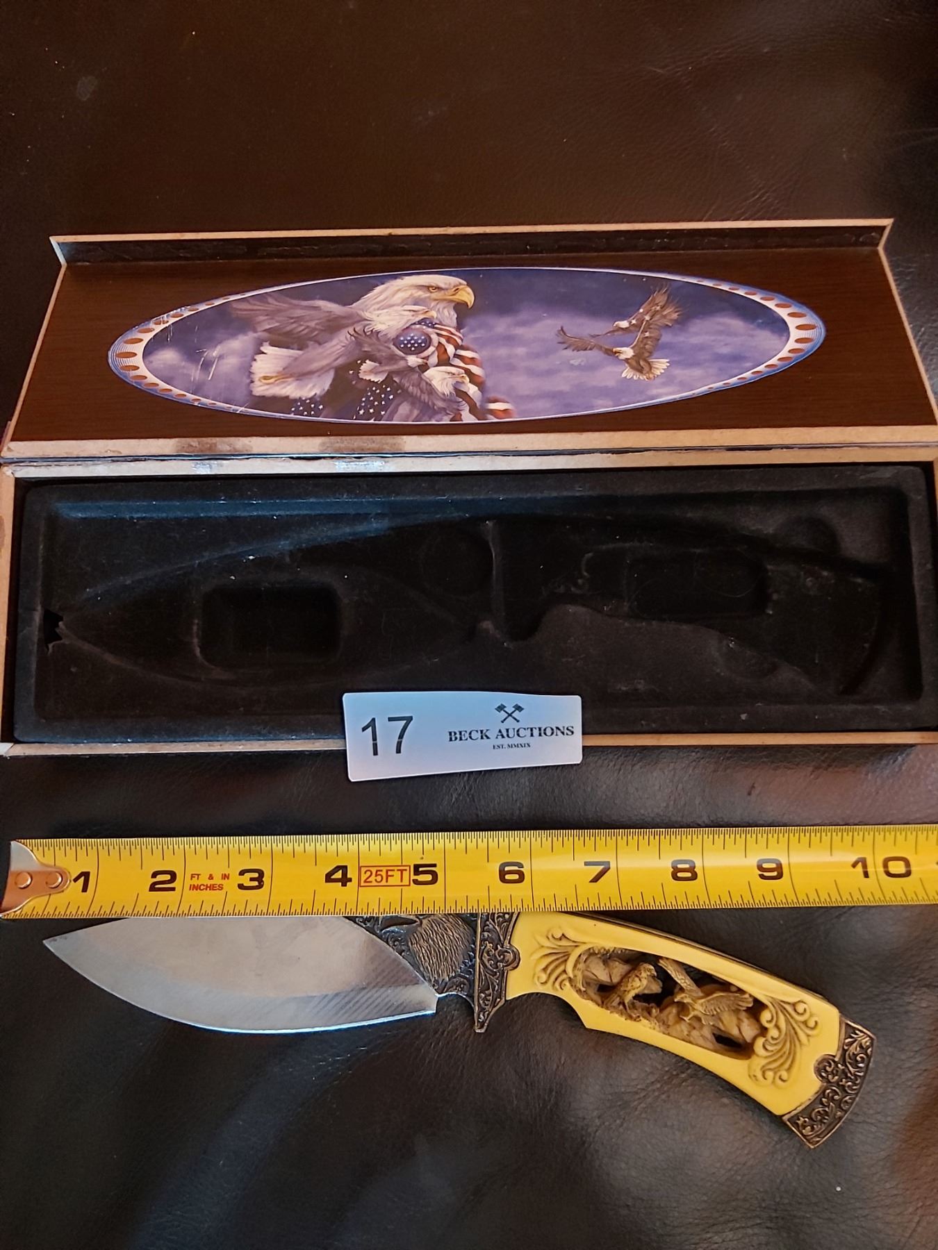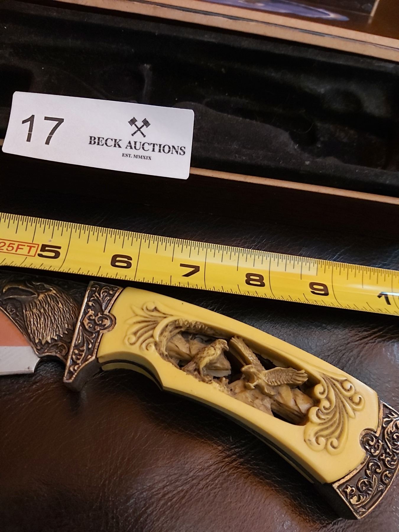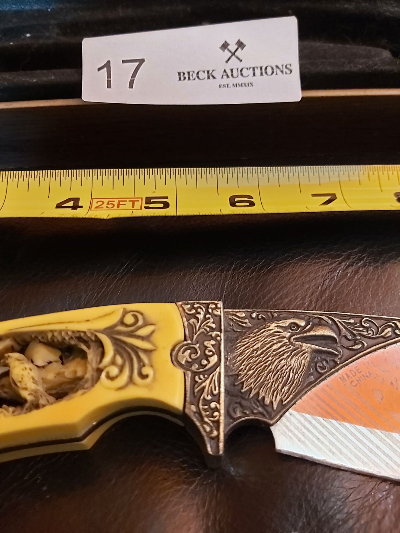 Resin Carved Handled Hunting Knife with Etched Blade in Wooden Box