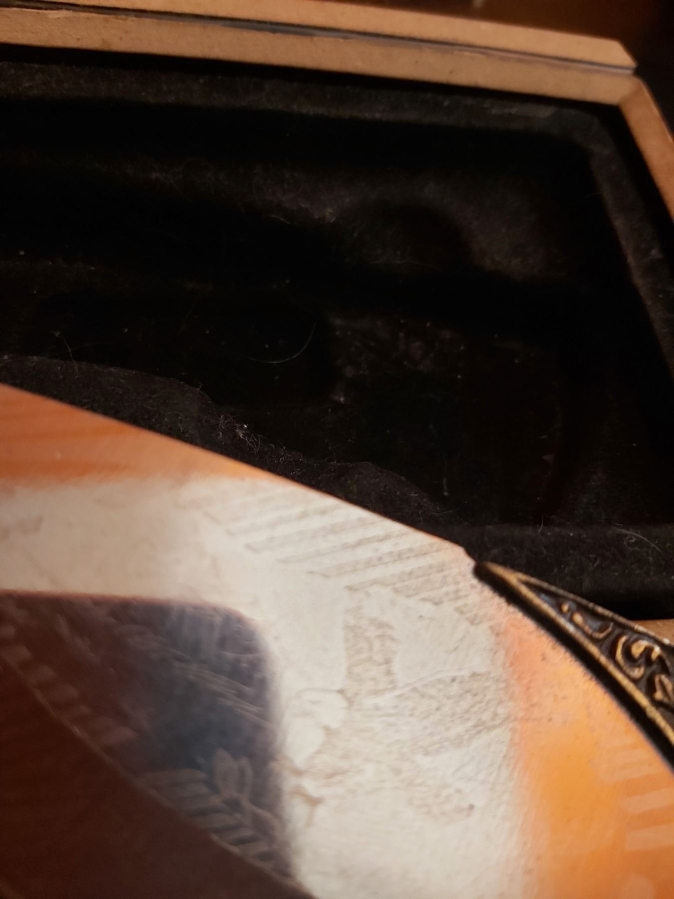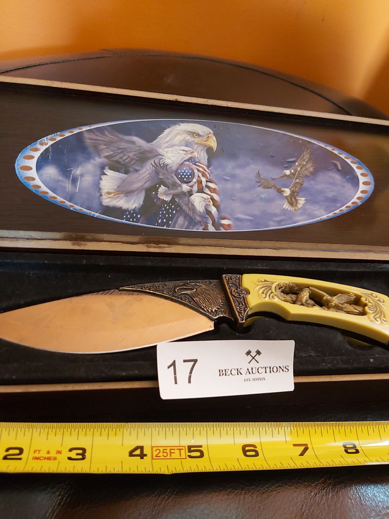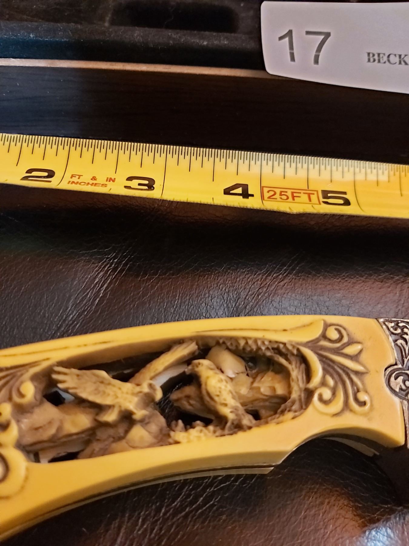 Resin Carved Handled Hunting Knife with Etched Blade in Wooden Box