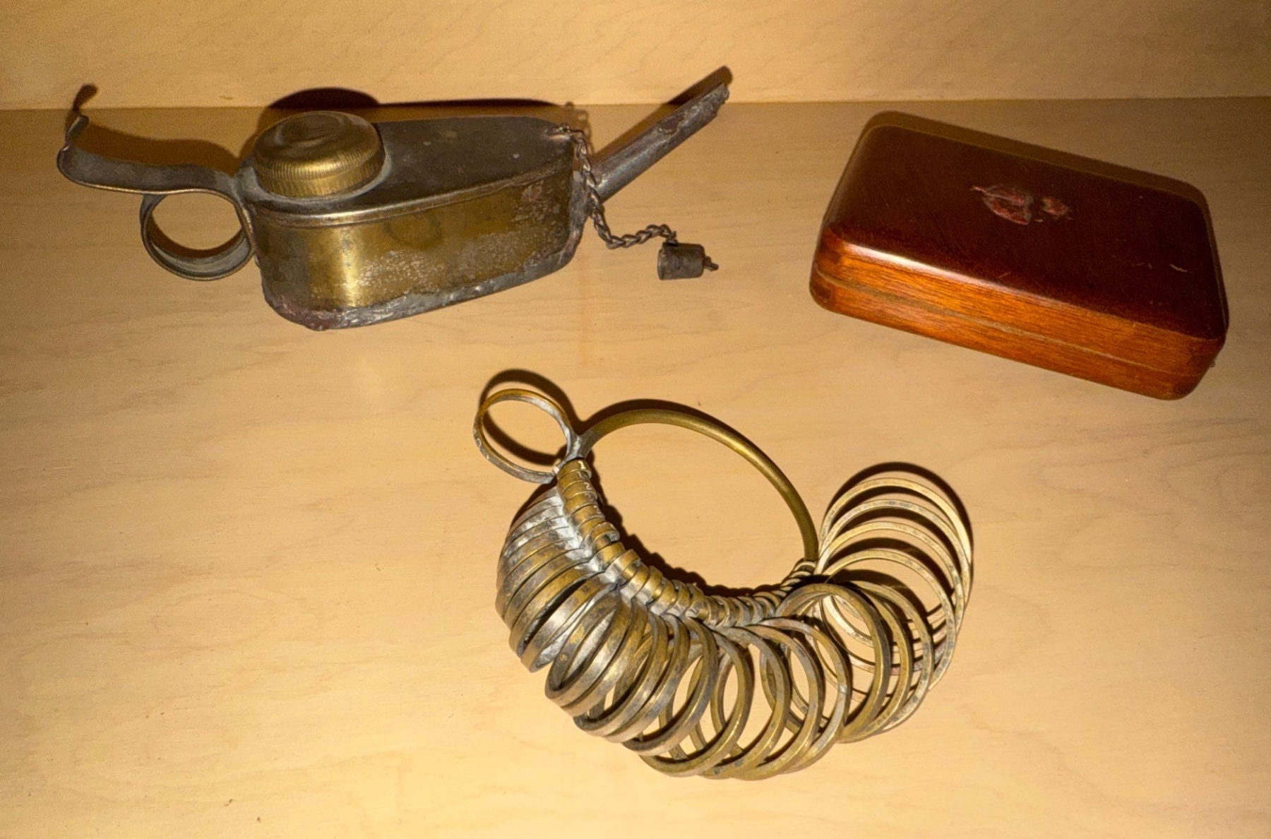 Ring Sizer Mandrel Antique Miners Lamp w/ Wooden Trinket Box 3L