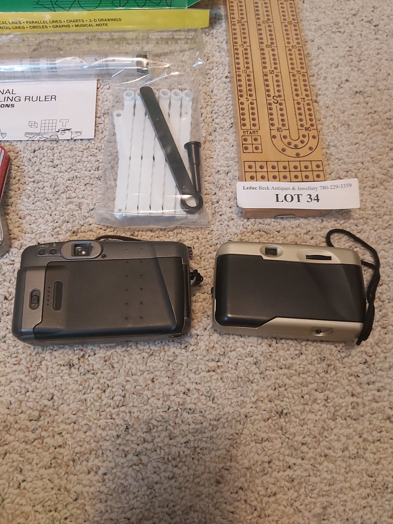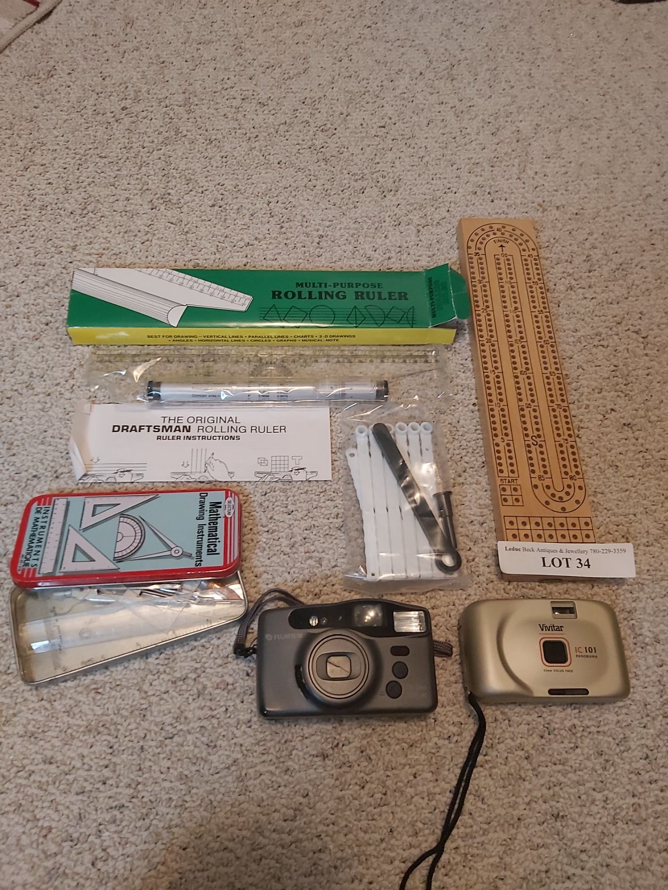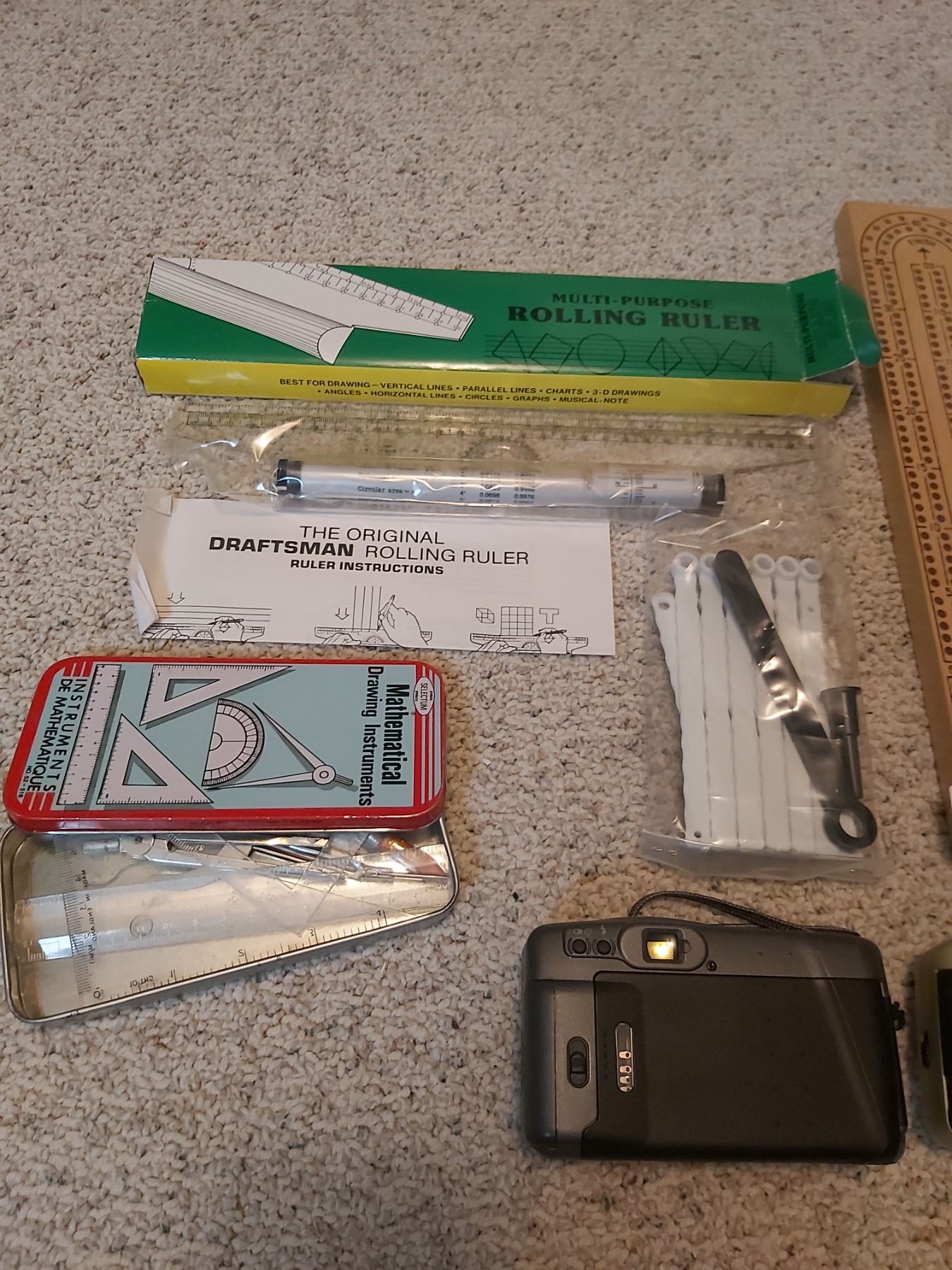 Rolling ruler, cribbage board, Fujifilm camera, Vivitar camera, mathematical drawing instrument set