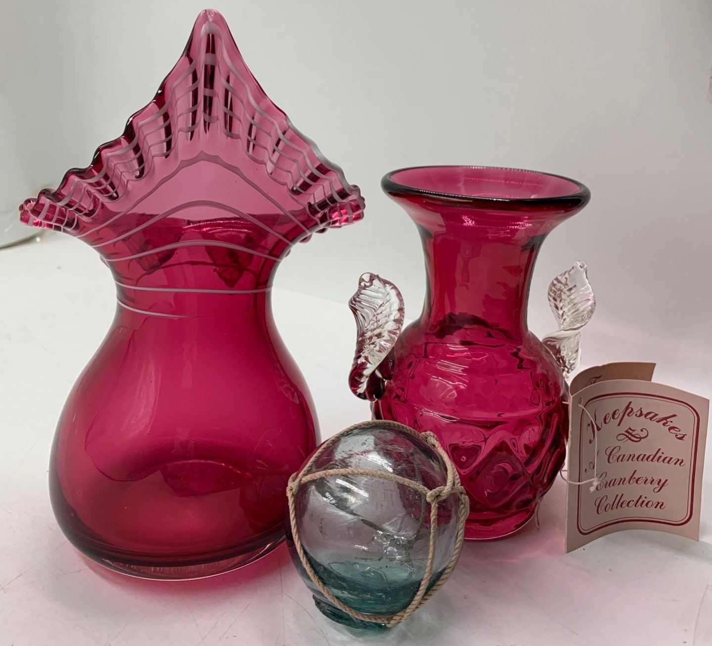 Rossi Niagra Cranberry Art Glass Vase 5T, Vintage Cranberry Crimped Glass Vase w/ White Ribbon 7T