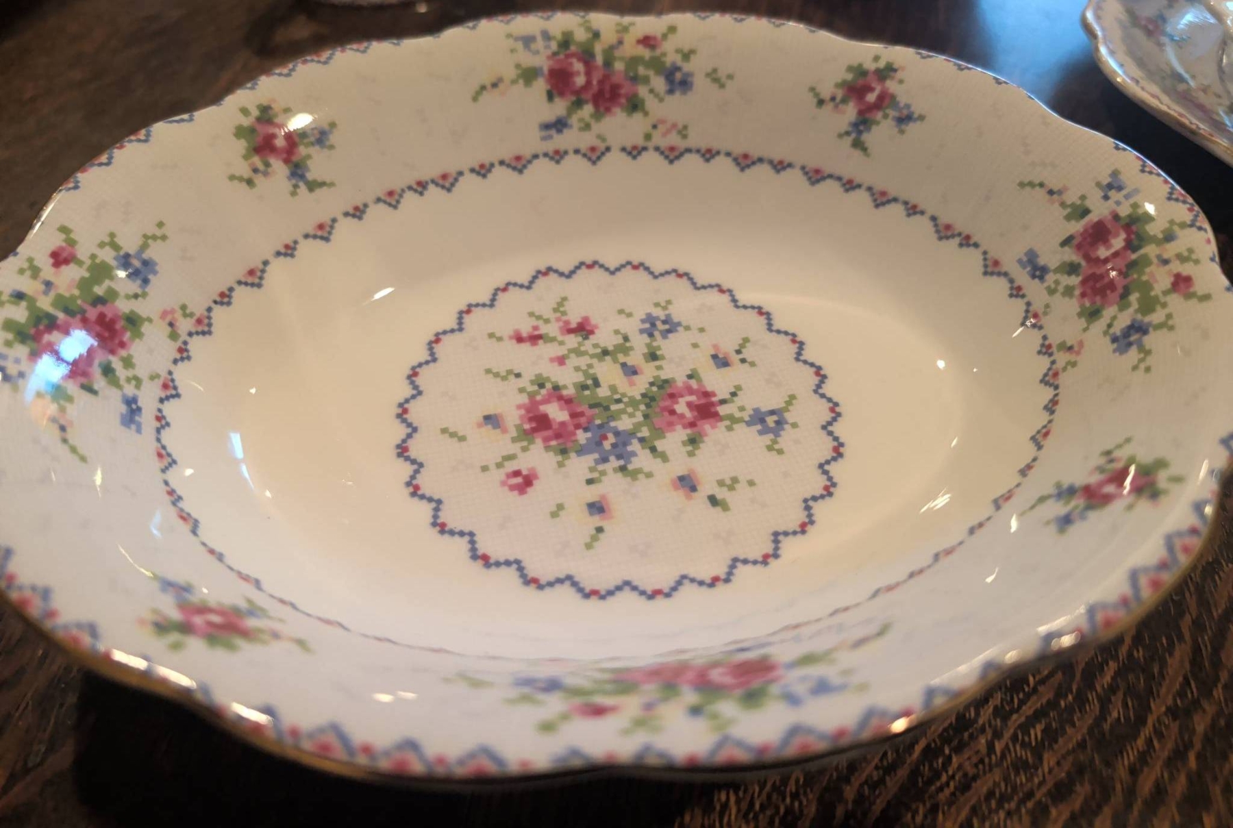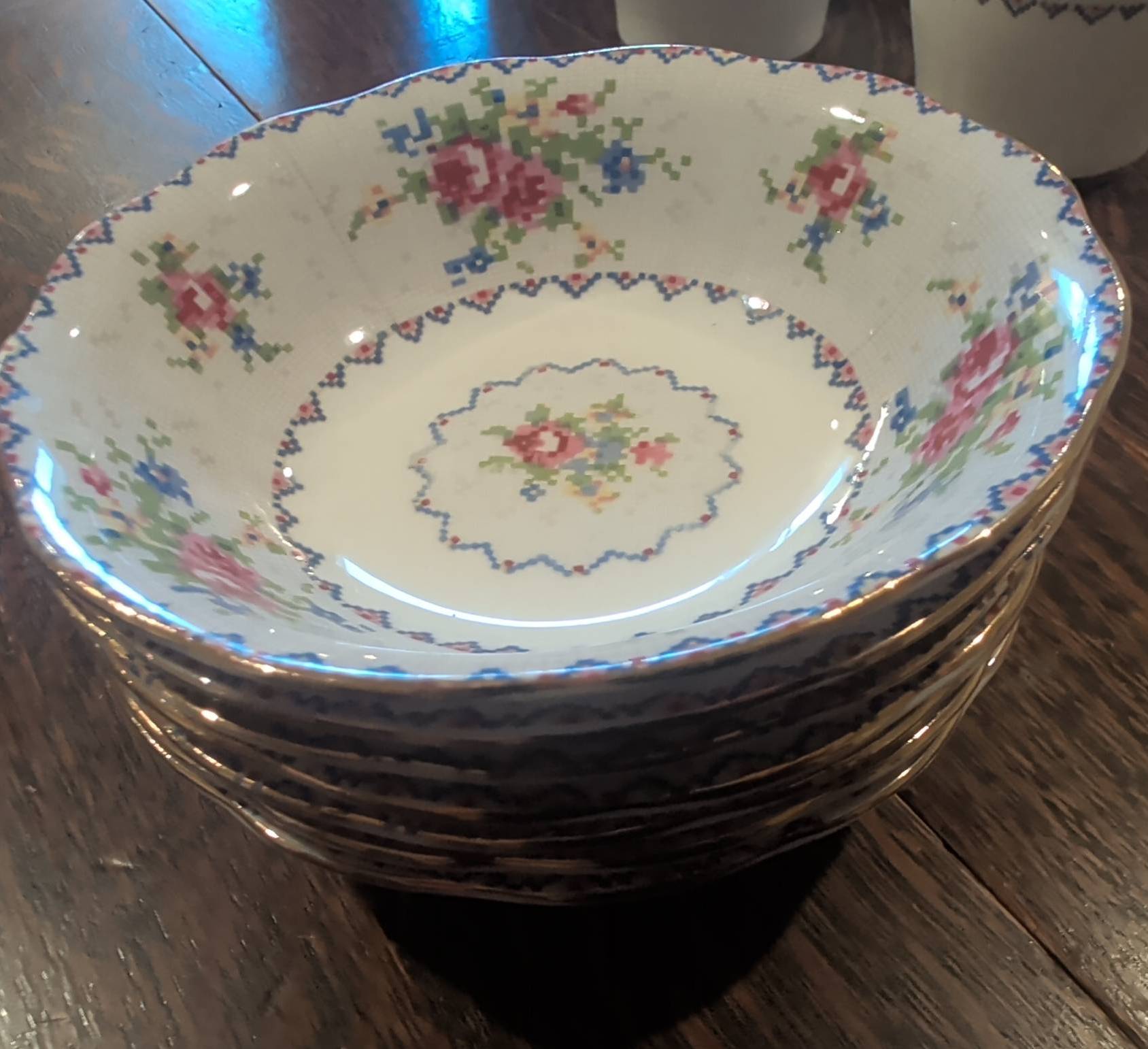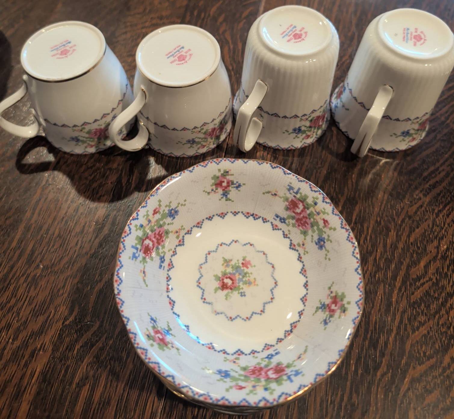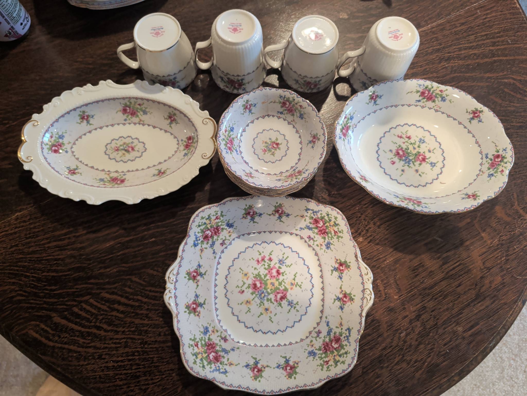 Royal Albert ‘Pixel Rose ‘ pattern bone china made in England. The set includes an oval serving dish, a square plate, a round dish, six bowls, and four mugs. Each piece features delicate floral designs and gold-tone accents. Marked ‘Royal Albert, Bone China, England.’ Condition appears impeccable, perfect for collectors or functional use.