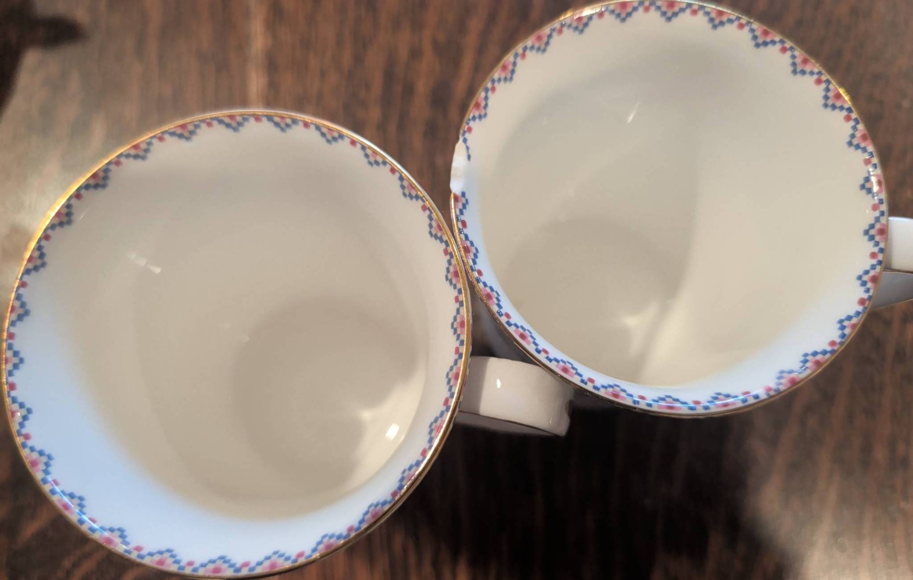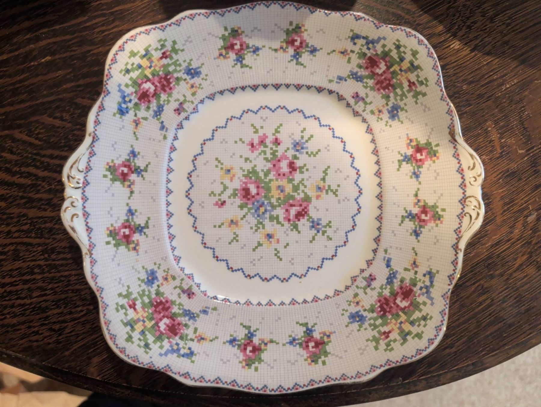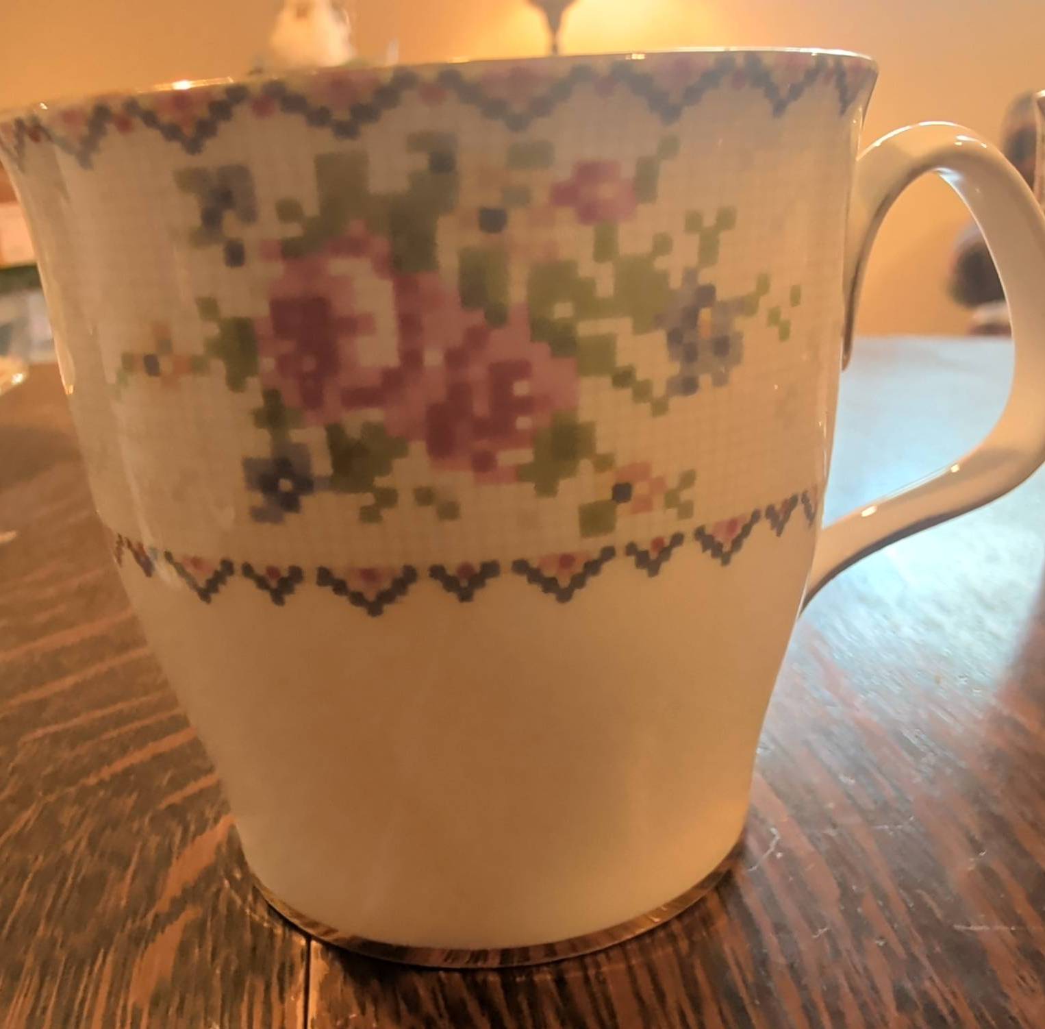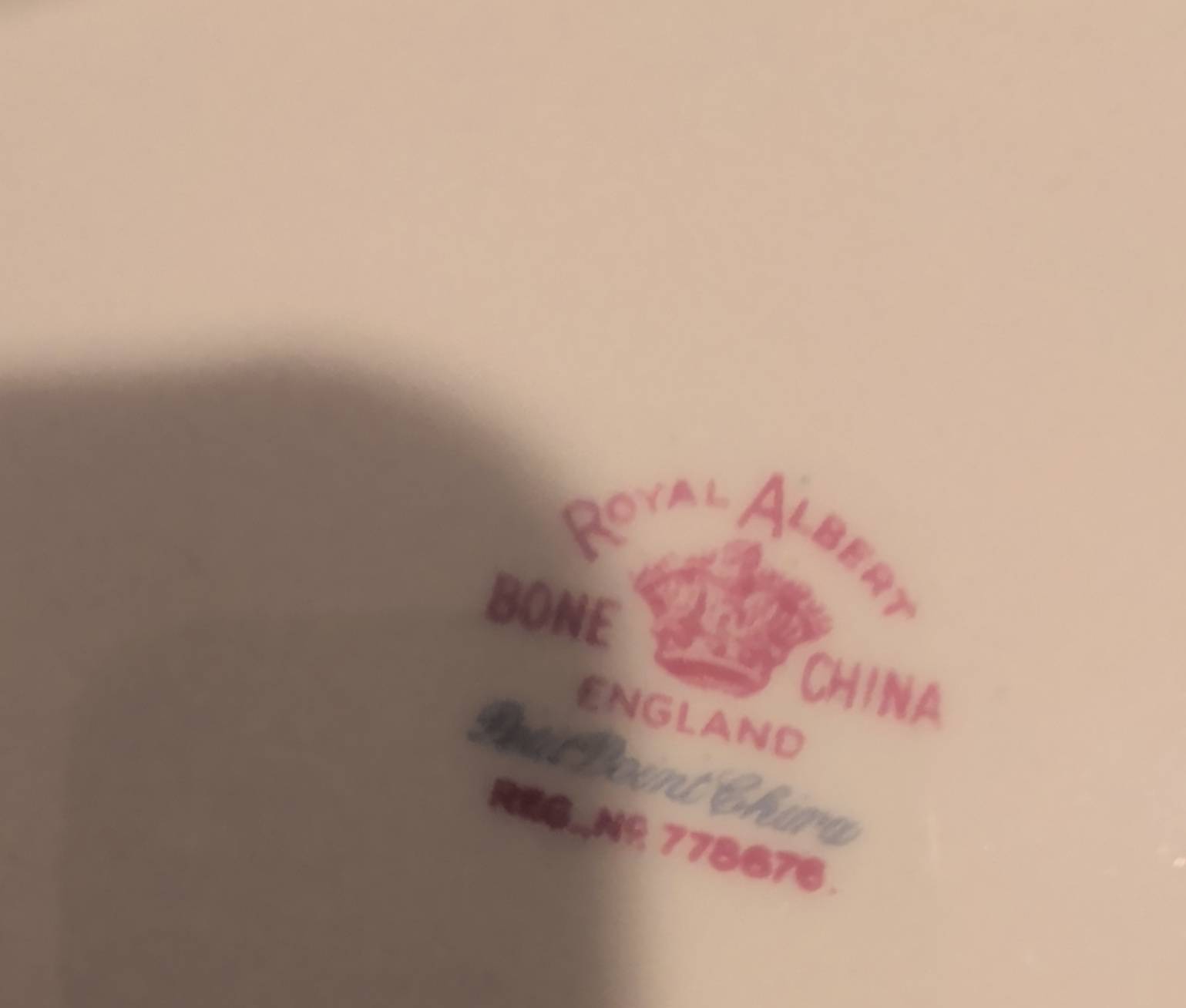 Royal Albert ‘Pixel Rose ‘ pattern bone china made in England. The set includes an oval serving dish, a square plate, a round dish, six bowls, and four mugs. Each piece features delicate floral designs and gold-tone accents. Marked ‘Royal Albert, Bone China, England.’ Condition appears impeccable, perfect for collectors or functional use.