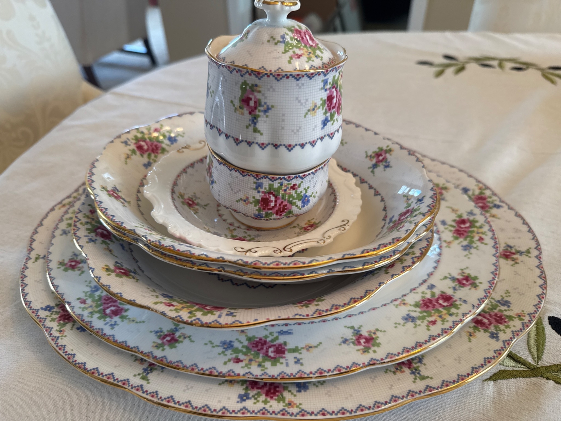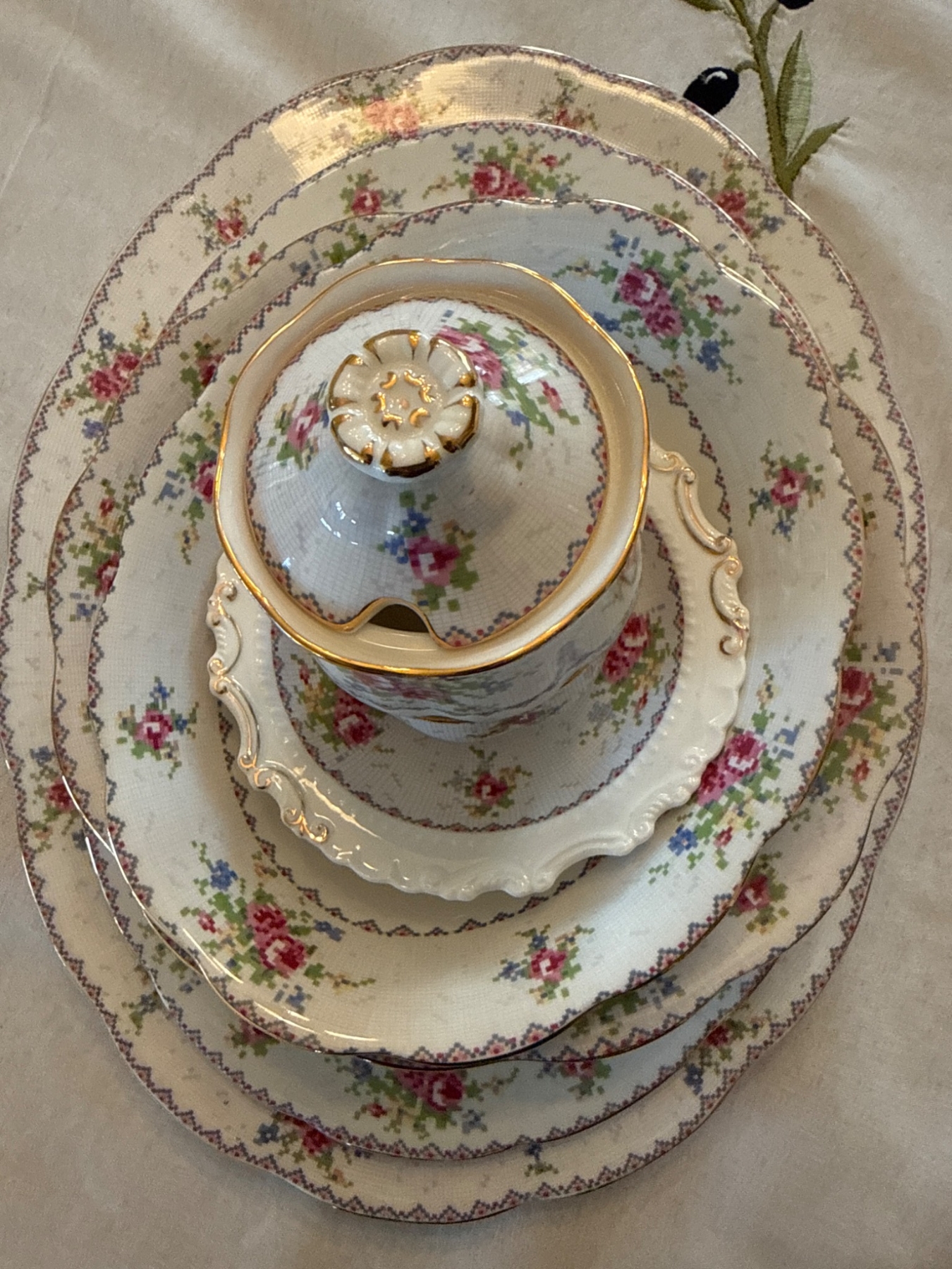 Royal Albert fine china serving platters and bowls featuring a delicate floral design with gold trim. Known for its timeless quality, this set includes an array of plates and a covered bowl. The intricate rose motif and soft colors make it a beautiful addition to any dining setting. Exact dimensions of individual pieces are not specified.