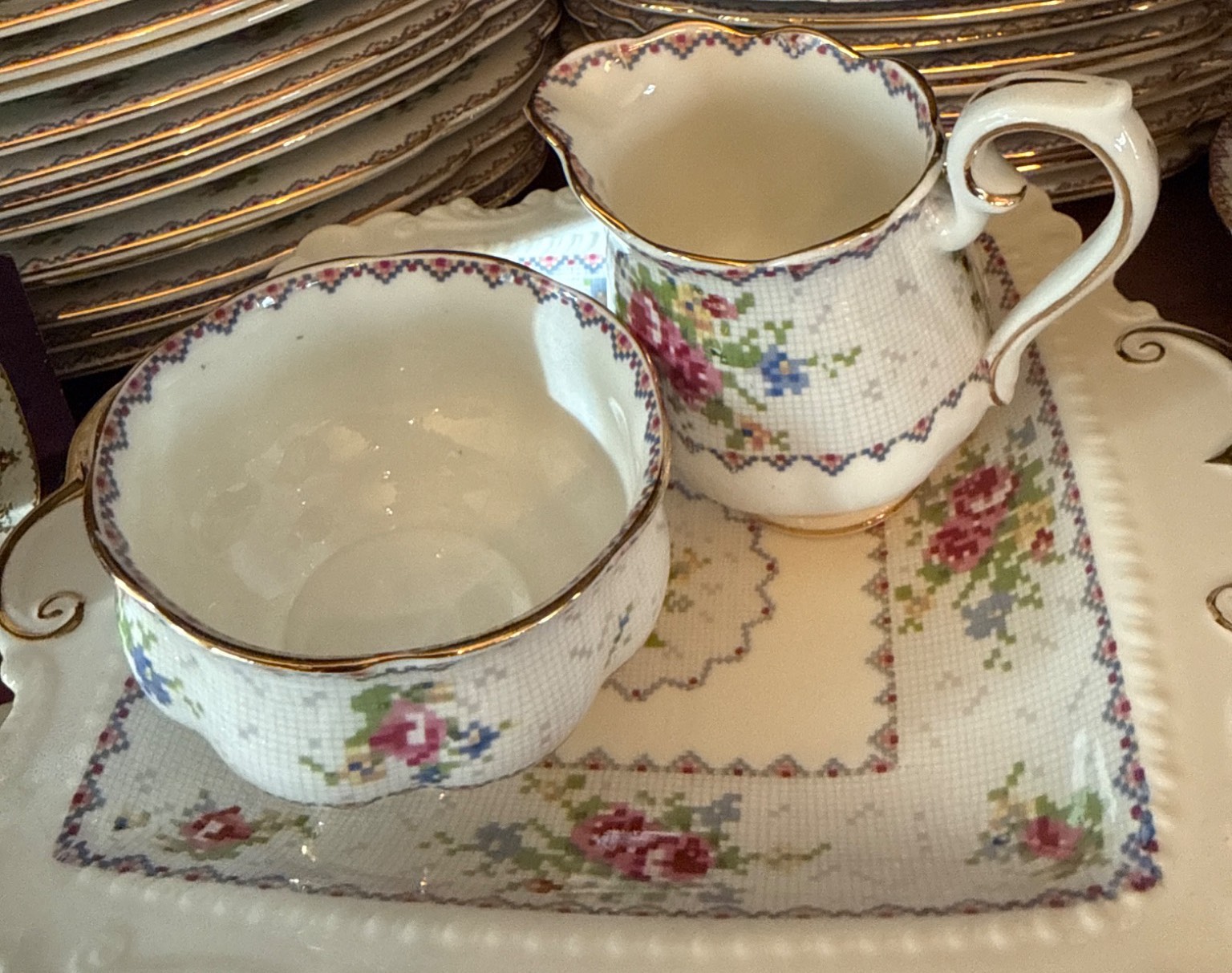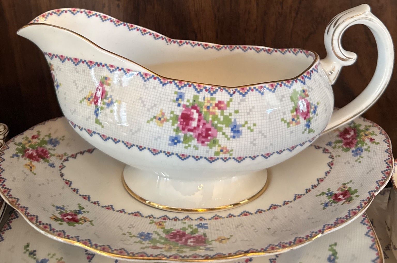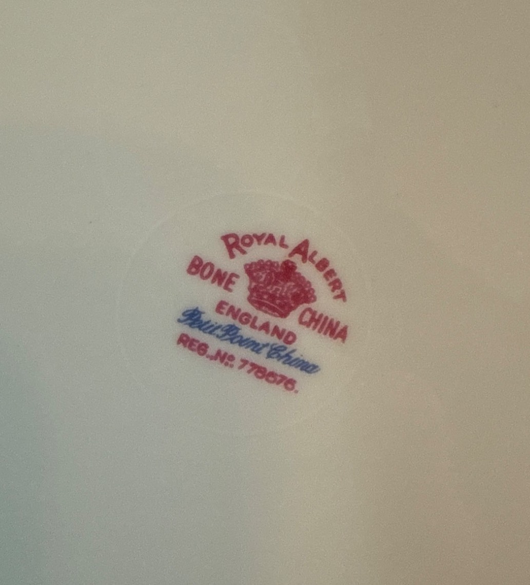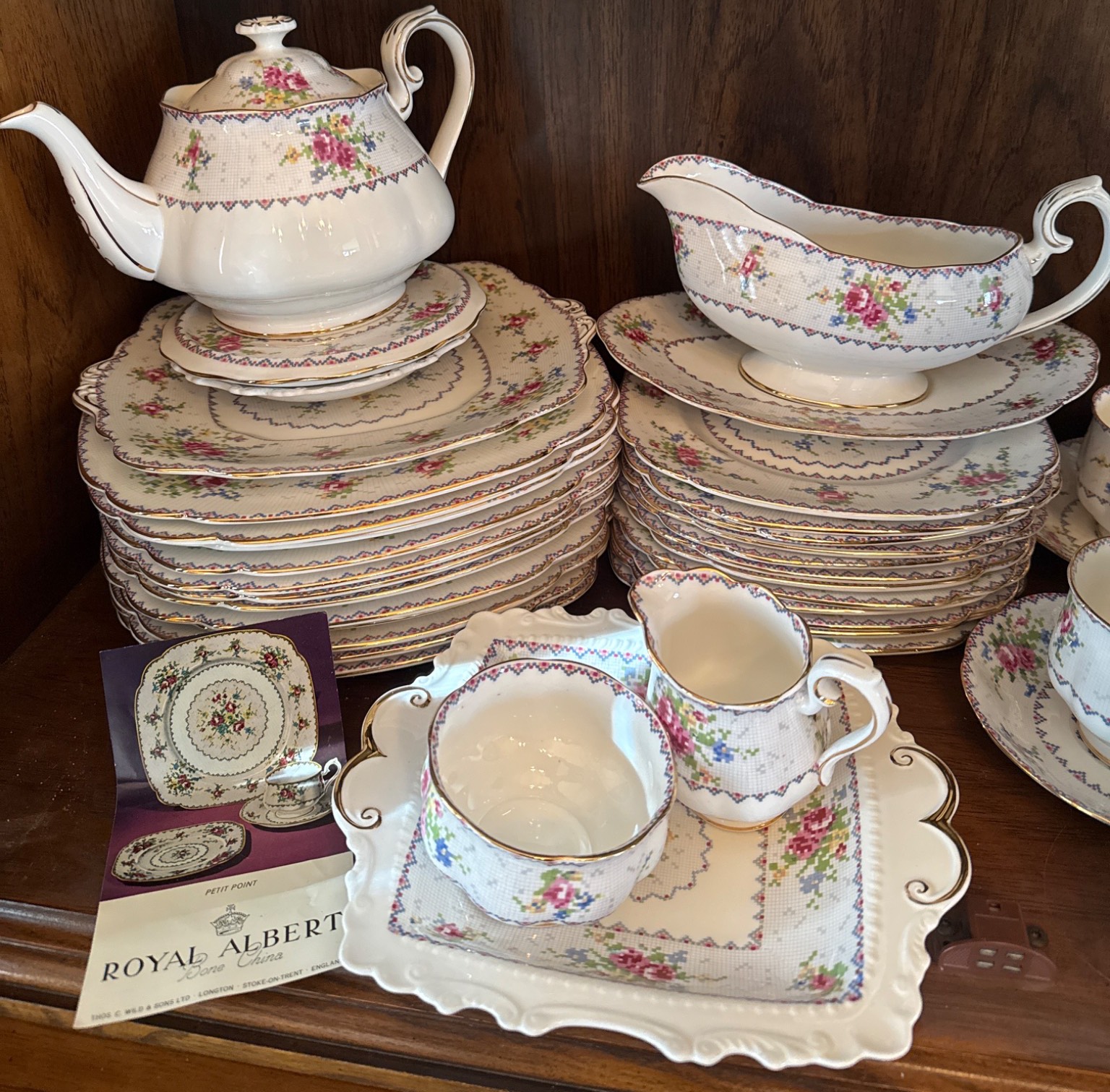 Royal Albert ‘Petit Point’ bone china set, crafted in England and featuring a charming cross-stitch floral pattern with gold trim. The set includes a variety of pieces, such as teapot, creamer, sugar bowl, gravy boat, cups, saucers, and dinnerware, all in good condition with elegant details. Measurements vary per item; for instance, plates are approximately 10 inches wide. Ideal for collectors or those seeking refined tableware.