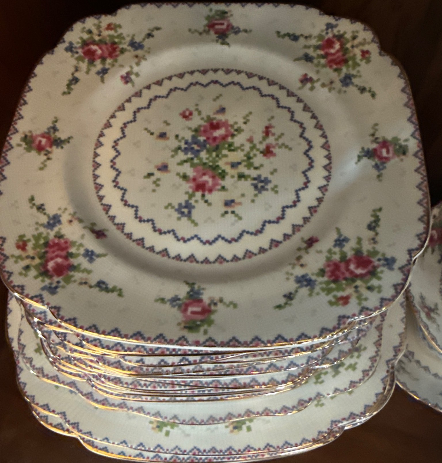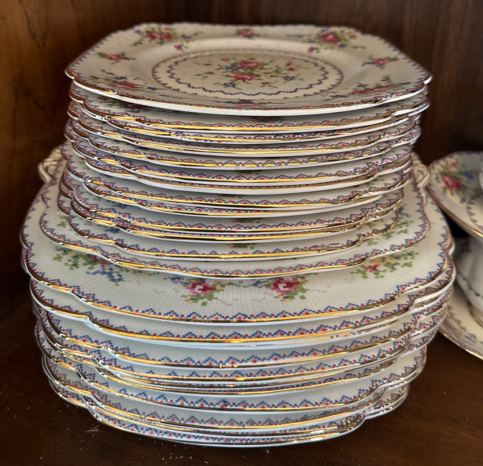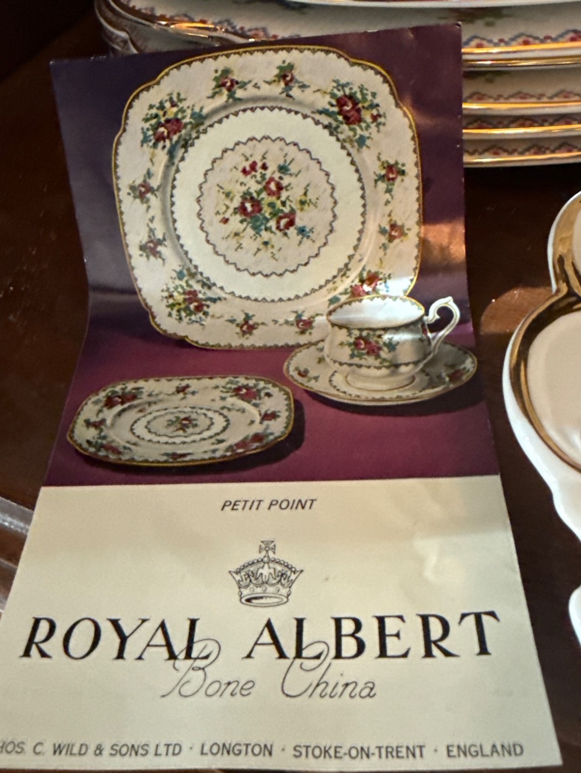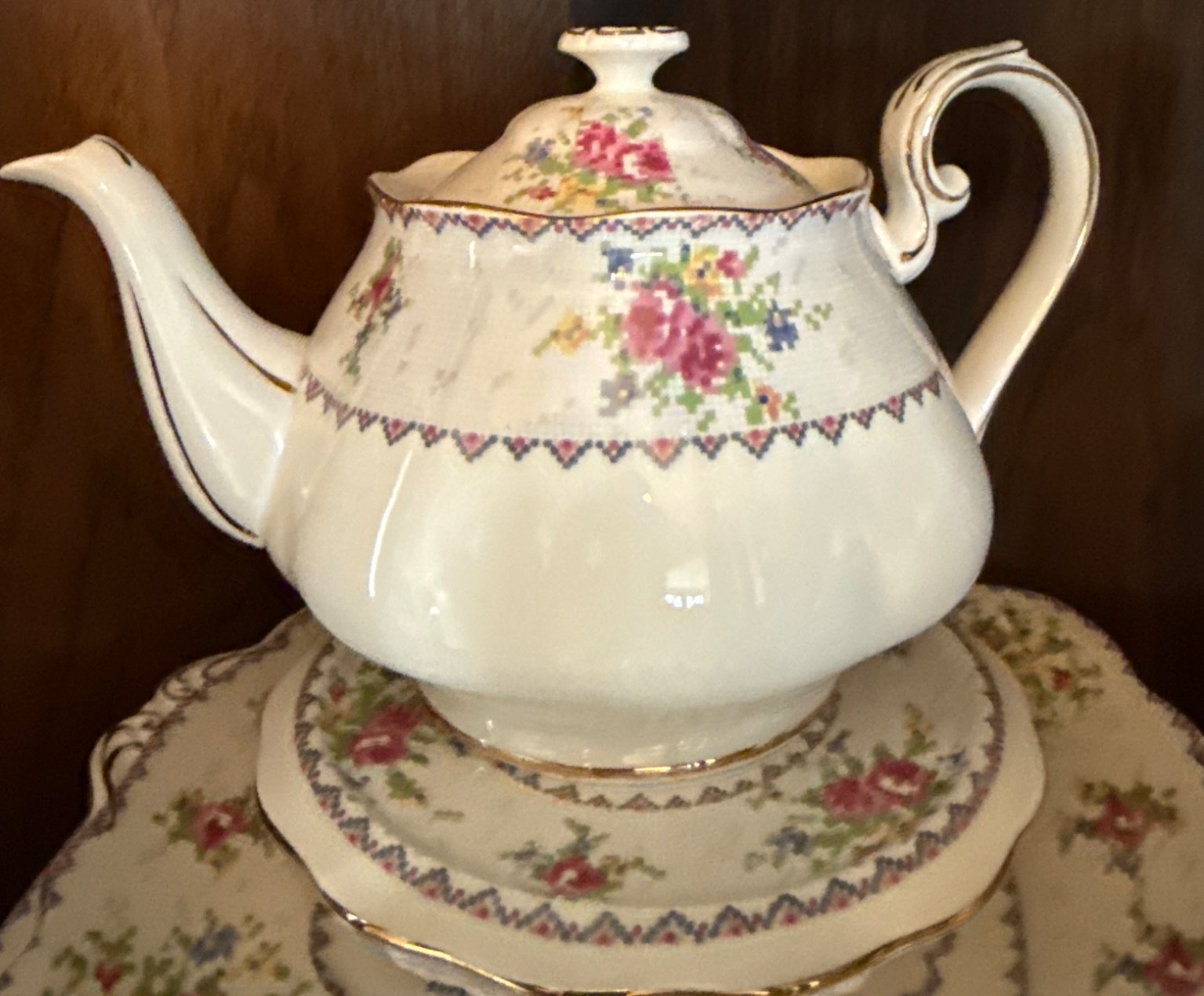 Royal Albert ‘Petit Point’ bone china set, crafted in England and featuring a charming cross-stitch floral pattern with gold trim. The set includes a variety of pieces, such as teapot, creamer, sugar bowl, gravy boat, cups, saucers, and dinnerware, all in good condition with elegant details. Measurements vary per item; for instance, plates are approximately 10 inches wide. Ideal for collectors or those seeking refined tableware.
