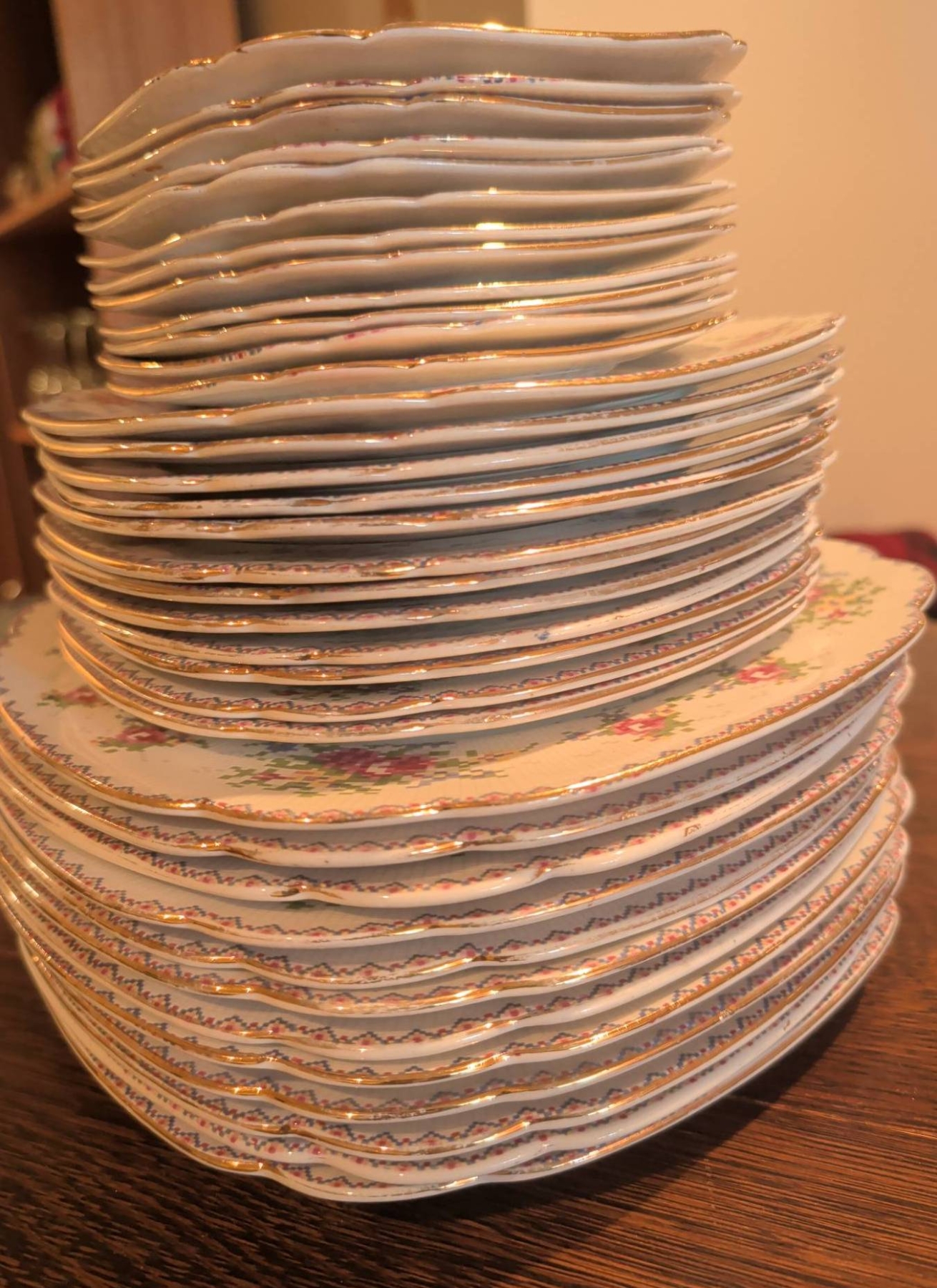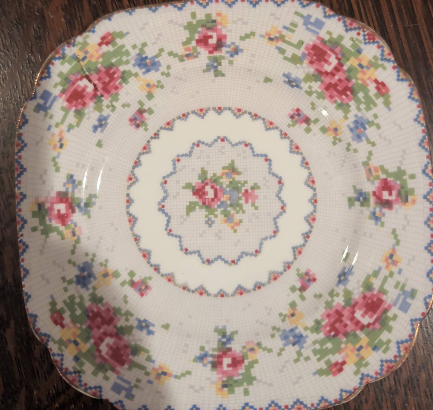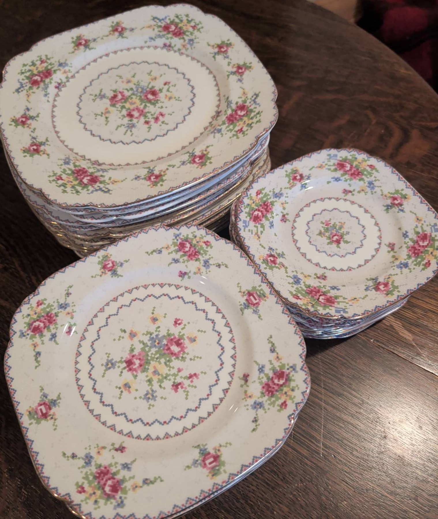 Royal Albert Bone China dinnerware set featuring a delicate floral design and gold trim accents. Made in England, this lot includes an assorted collection of plates in various sizes, adorned with complimenting elegant patterns. The dinnerware carries the ‘Pixel Rose’ pattern stamp. Ideal for collectors or elegant dining setups.