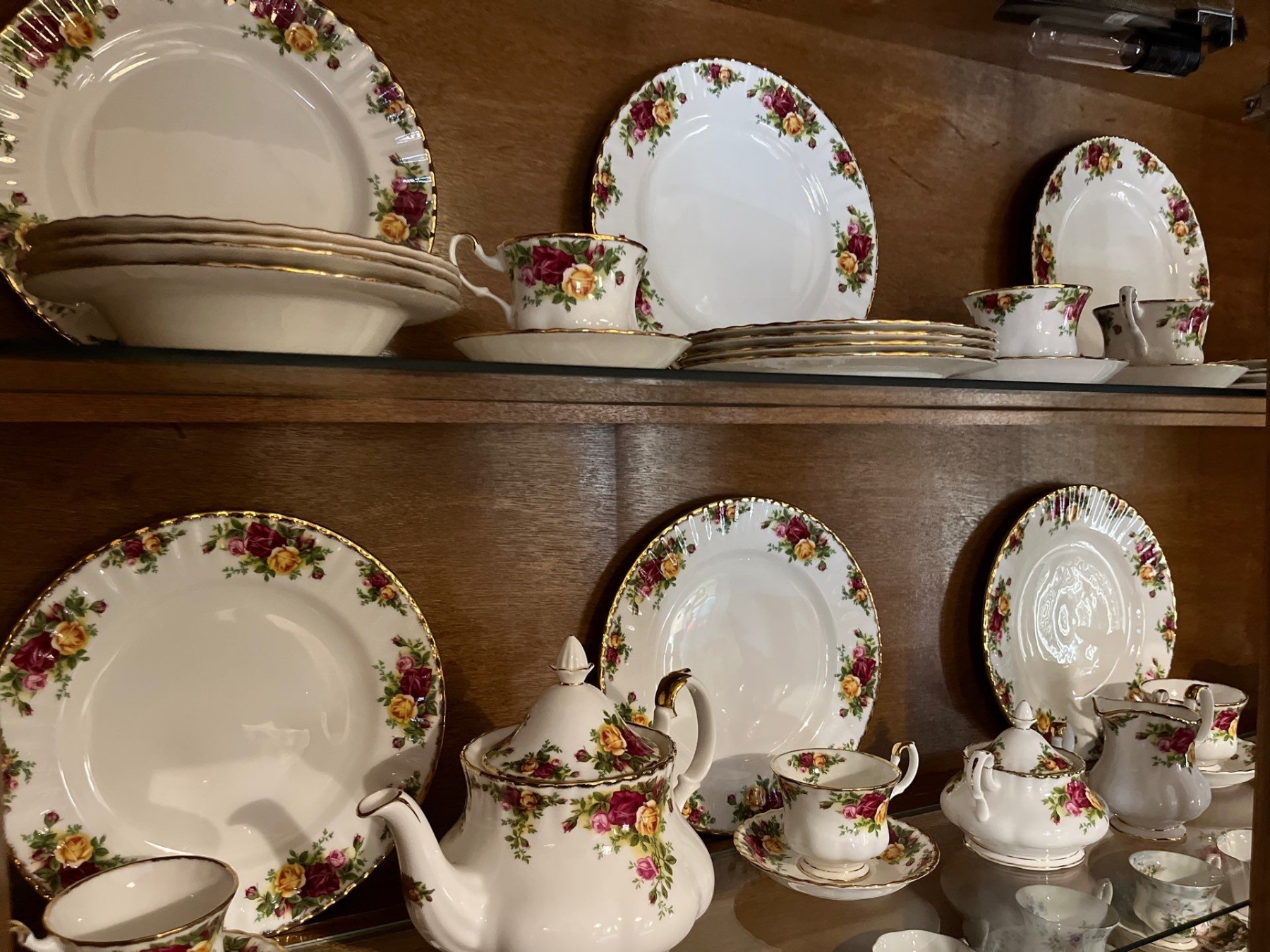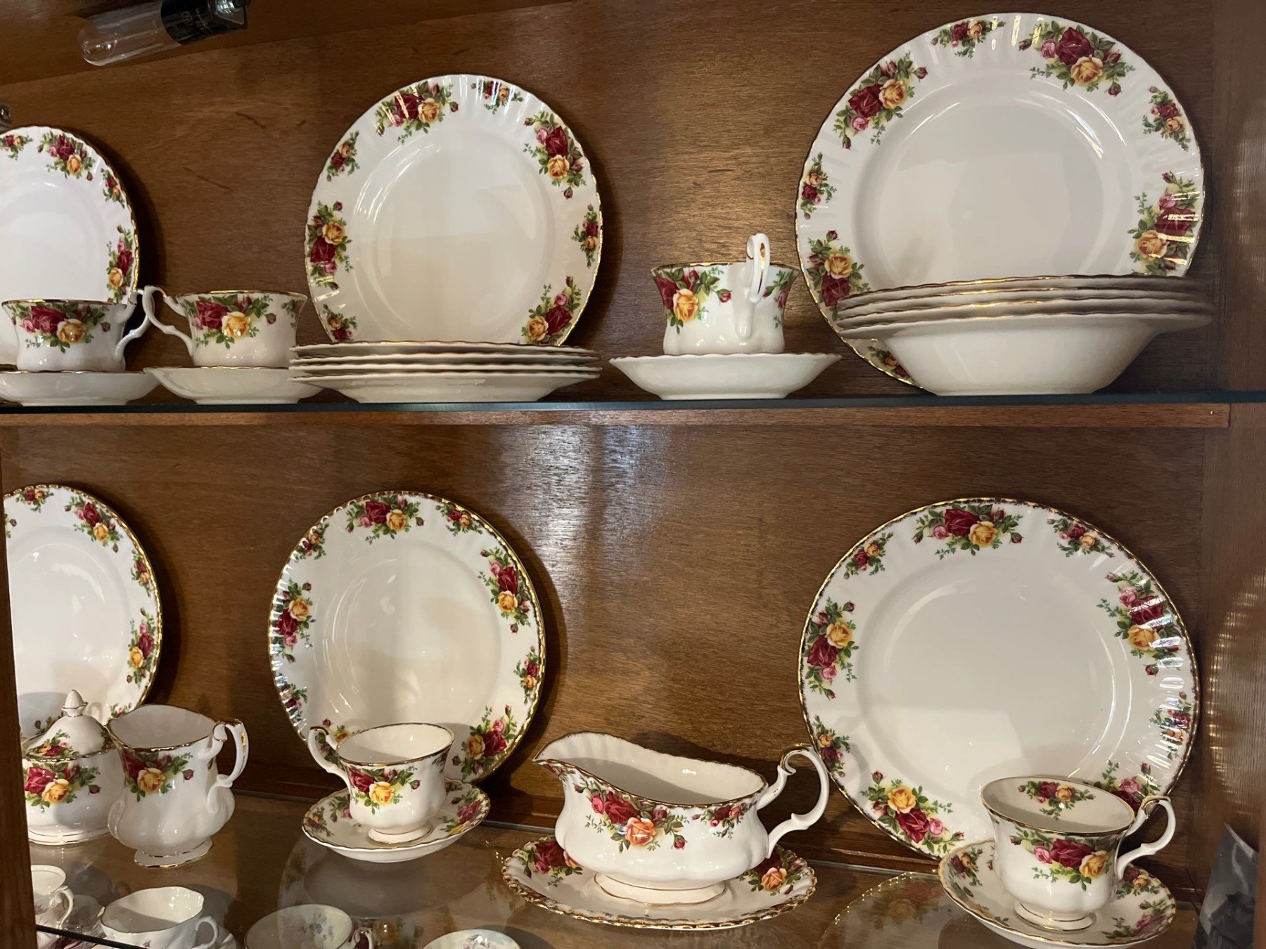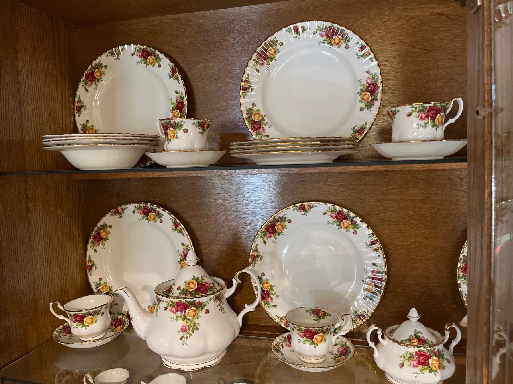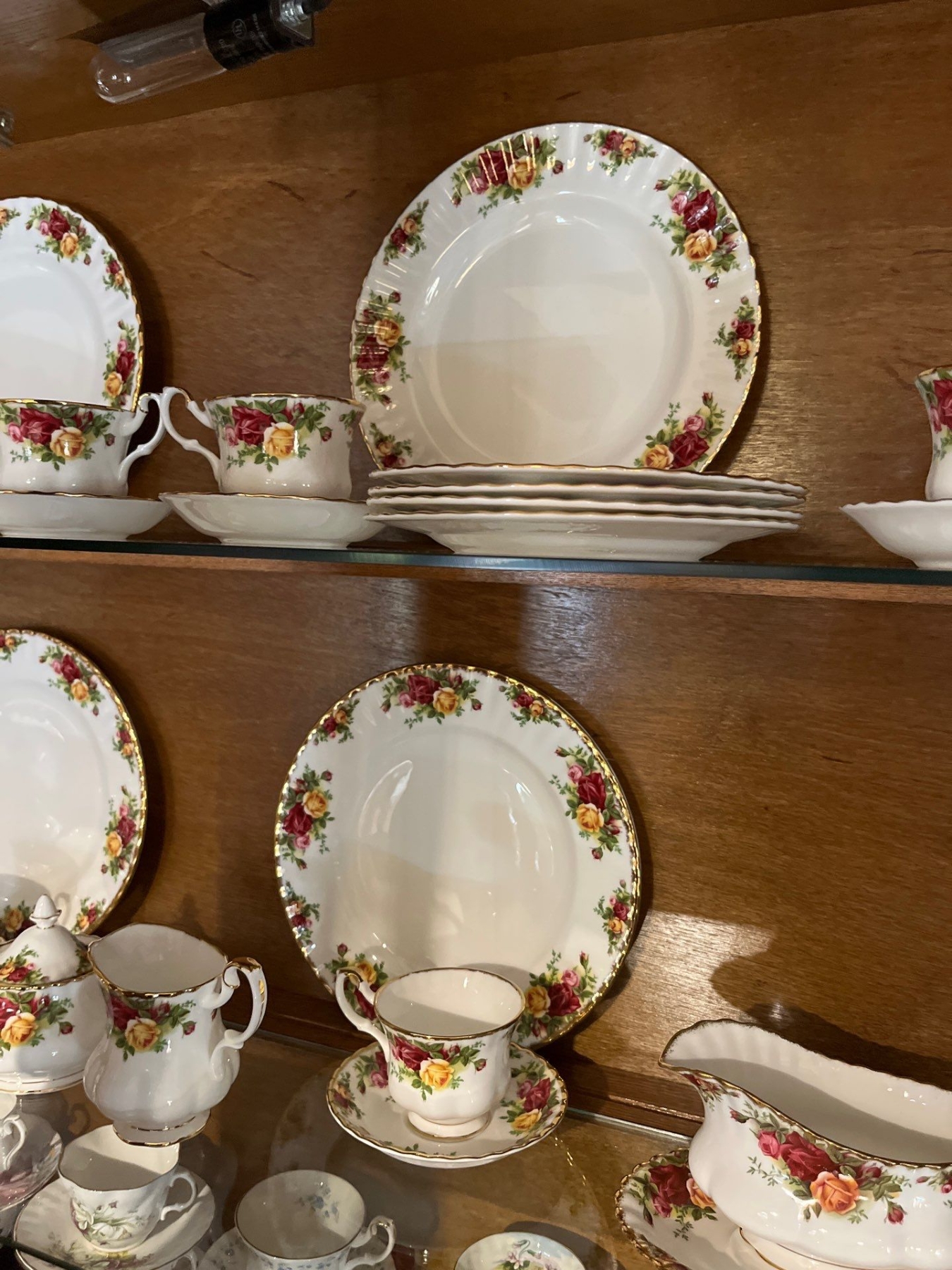 Royal Albert old Country Rose 8 place set large plates bread and butter plates soup bowls tea cup and saucers with Tea pot sugar bowl and creamer with a gravy boat . Beautiful collection.