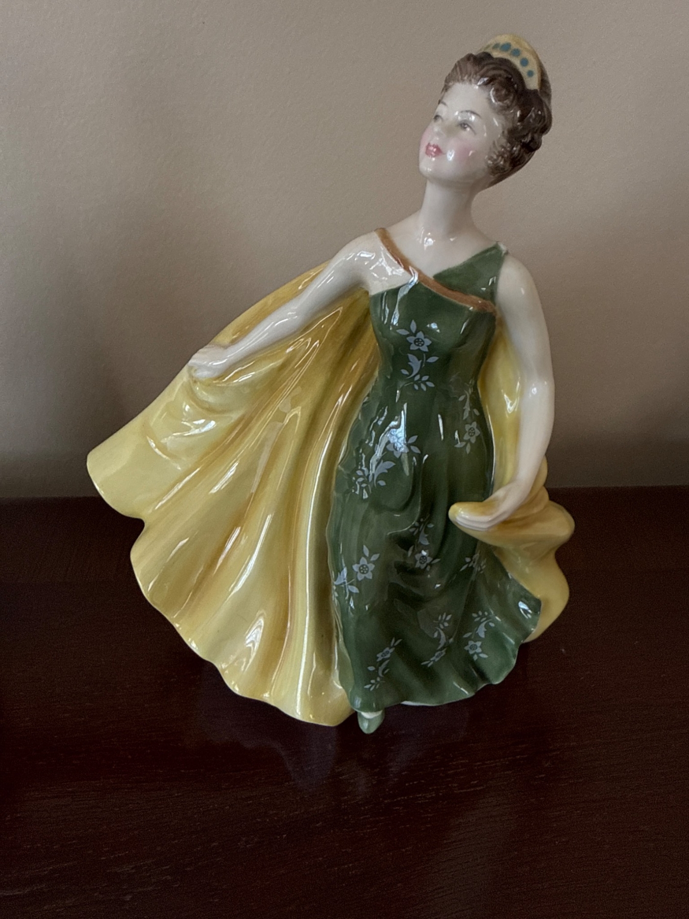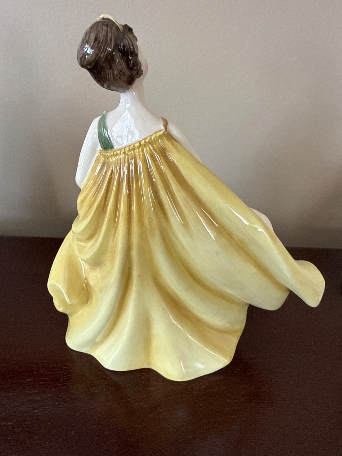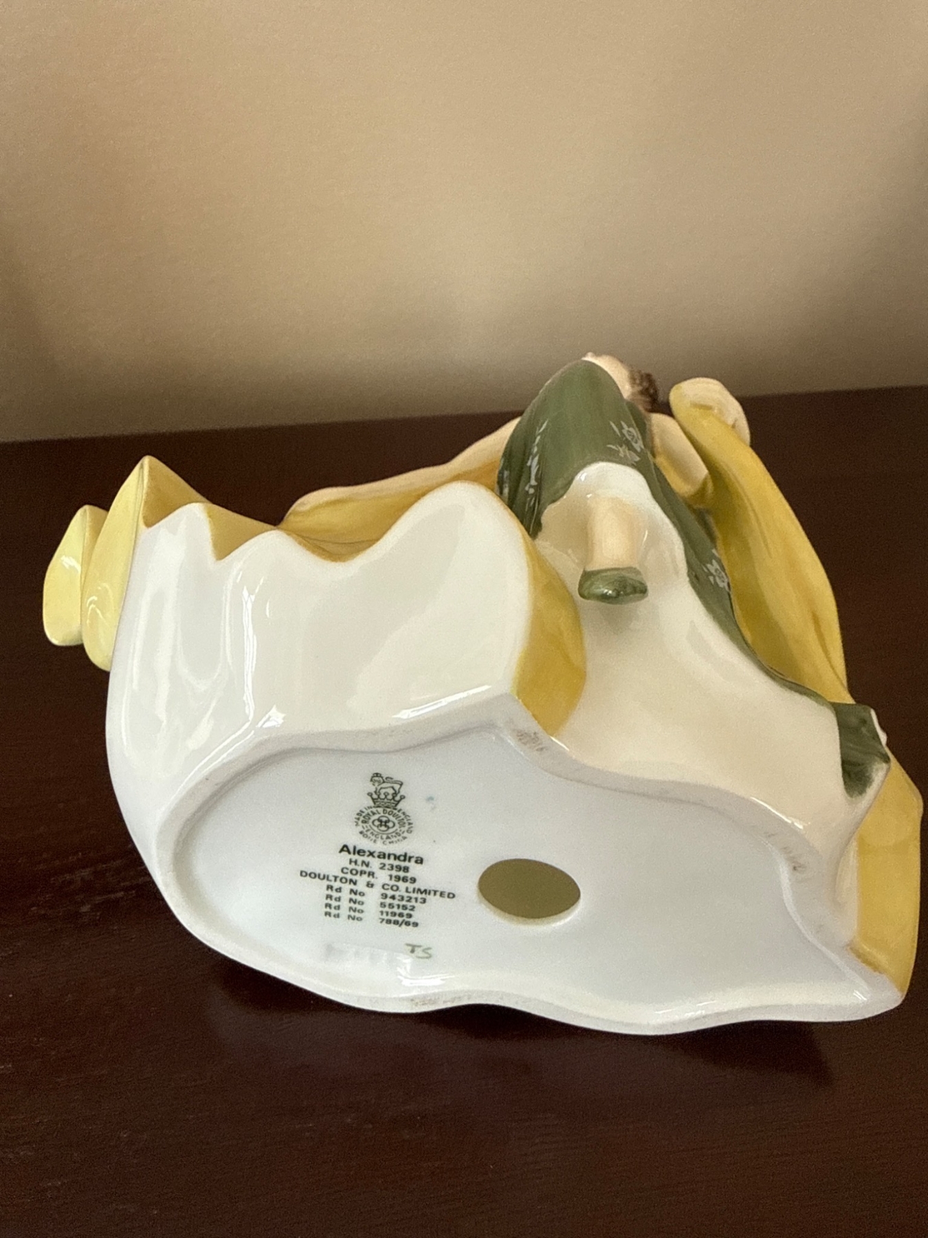 Royal Doulton bone china figurine titled 'Alexandra' (HN3286). The piece depicts a woman in a flowing green gown with a vibrant yellow cape. Crafted with fine detailing and a glossy finish, it carries the Royal Doulton hallmark and name on its base. Dimensions approximate at 7.5 inches in height. A charming addition to any porcelain collection.
