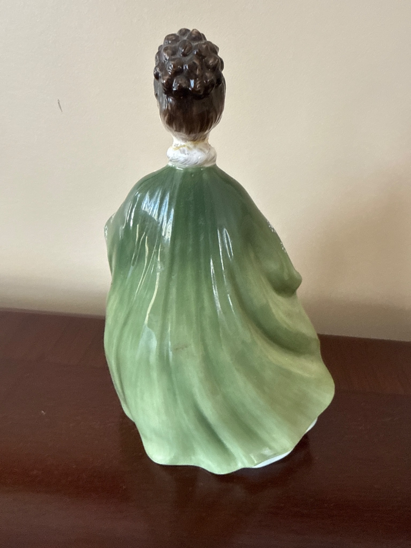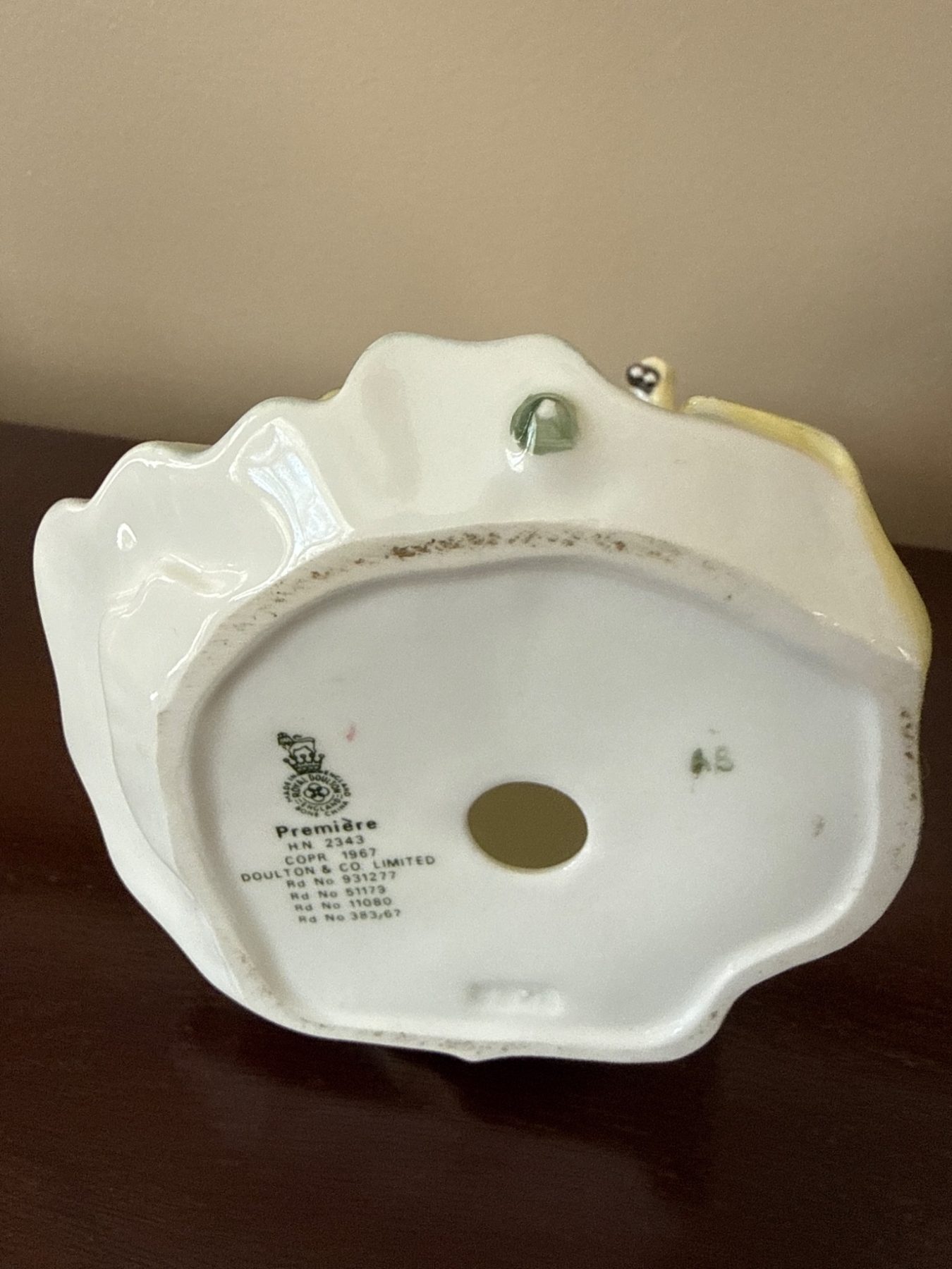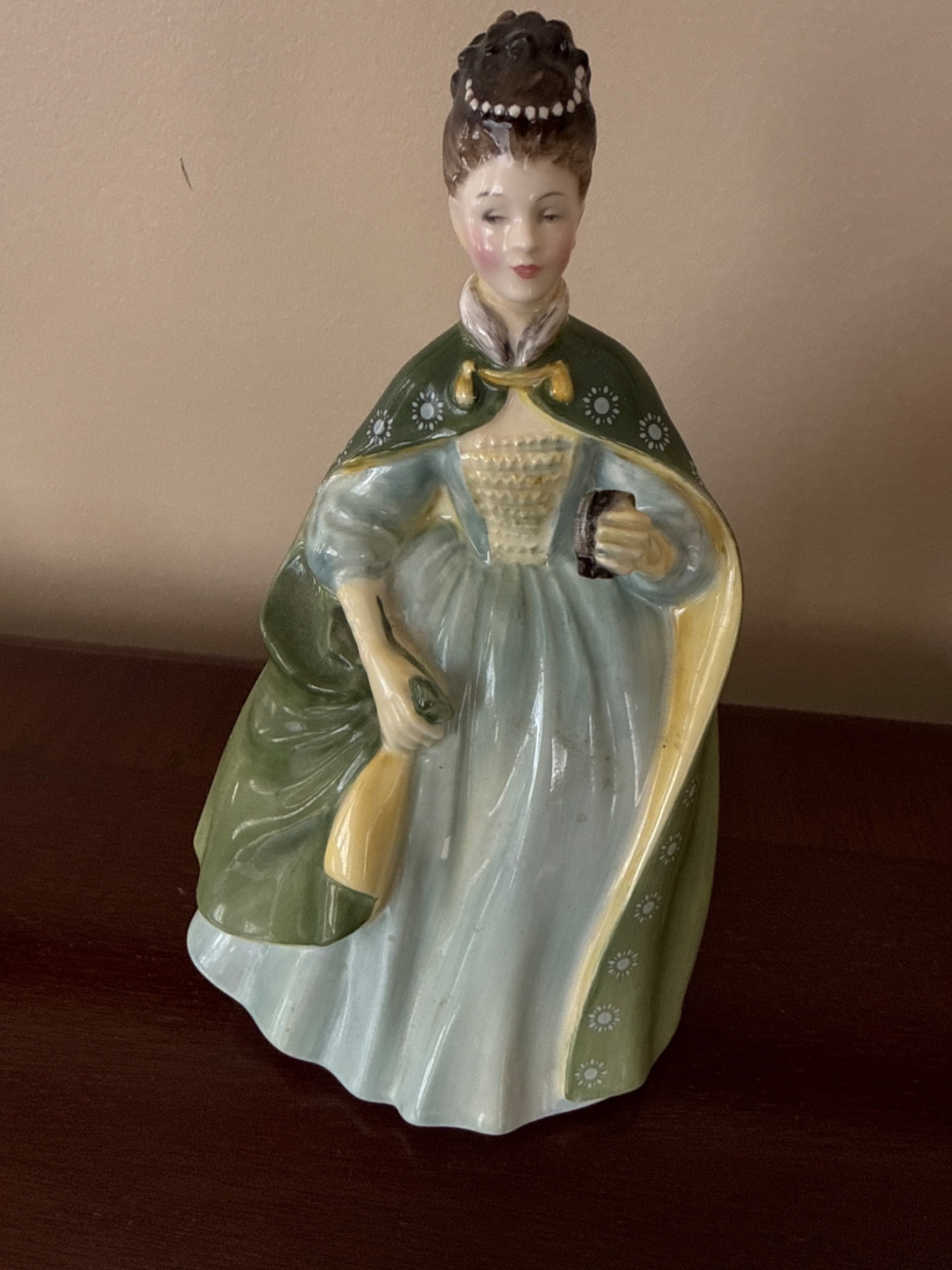 Royal Doulton porcelain figurine titled 'Premiere' (HN2343), featuring a young lady in a flowing green and yellow cloak over a pale blue dress. Crafted in fine bone china, this piece is marked on the base with maker information and production details. Stands approximately 8 inches (20 cm) tall, ideal for collectors or as a decorative display.