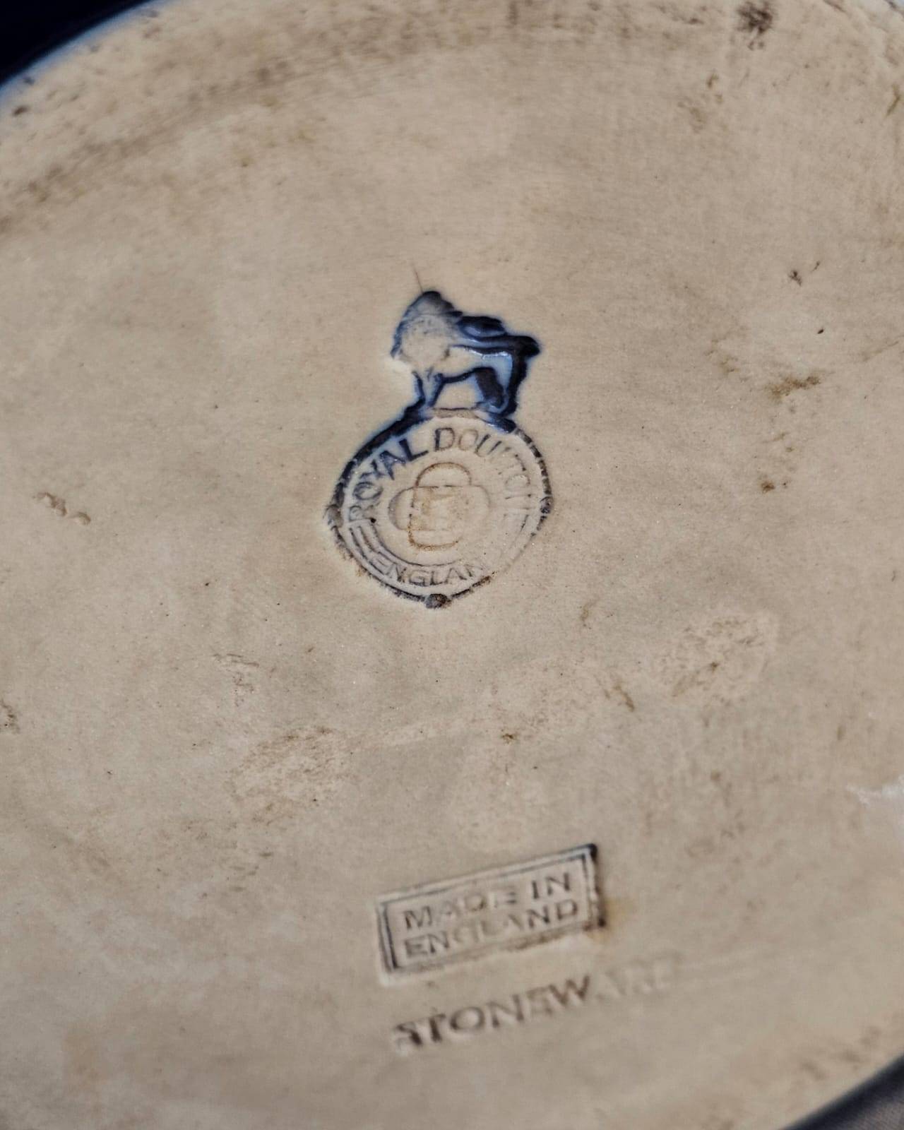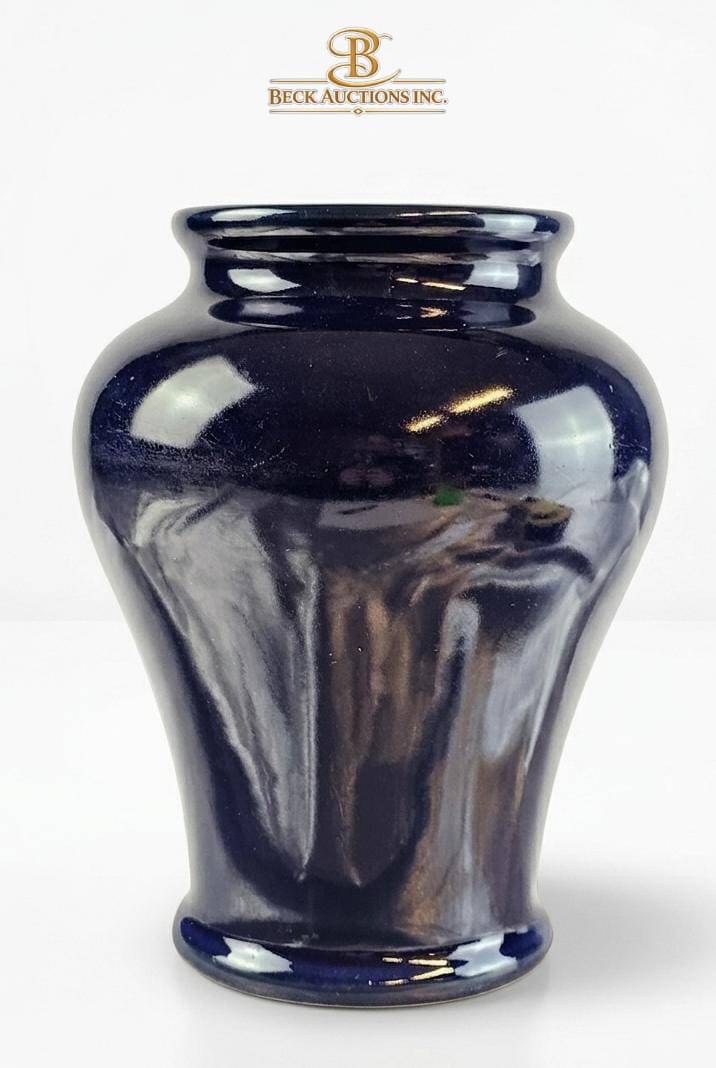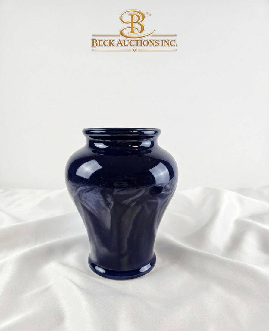 Royal Doulton stoneware vase featuring a deep cobalt blue glaze. Standing 9 inches tall, this piece showcases an elegant baluster form. Marked on the base with the Royal Doulton logo and ‘Made in England’ along with ‘Stoneware.’ A classic collectible for admirers of English pottery and refined decor.