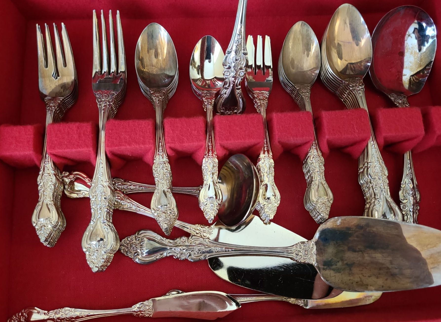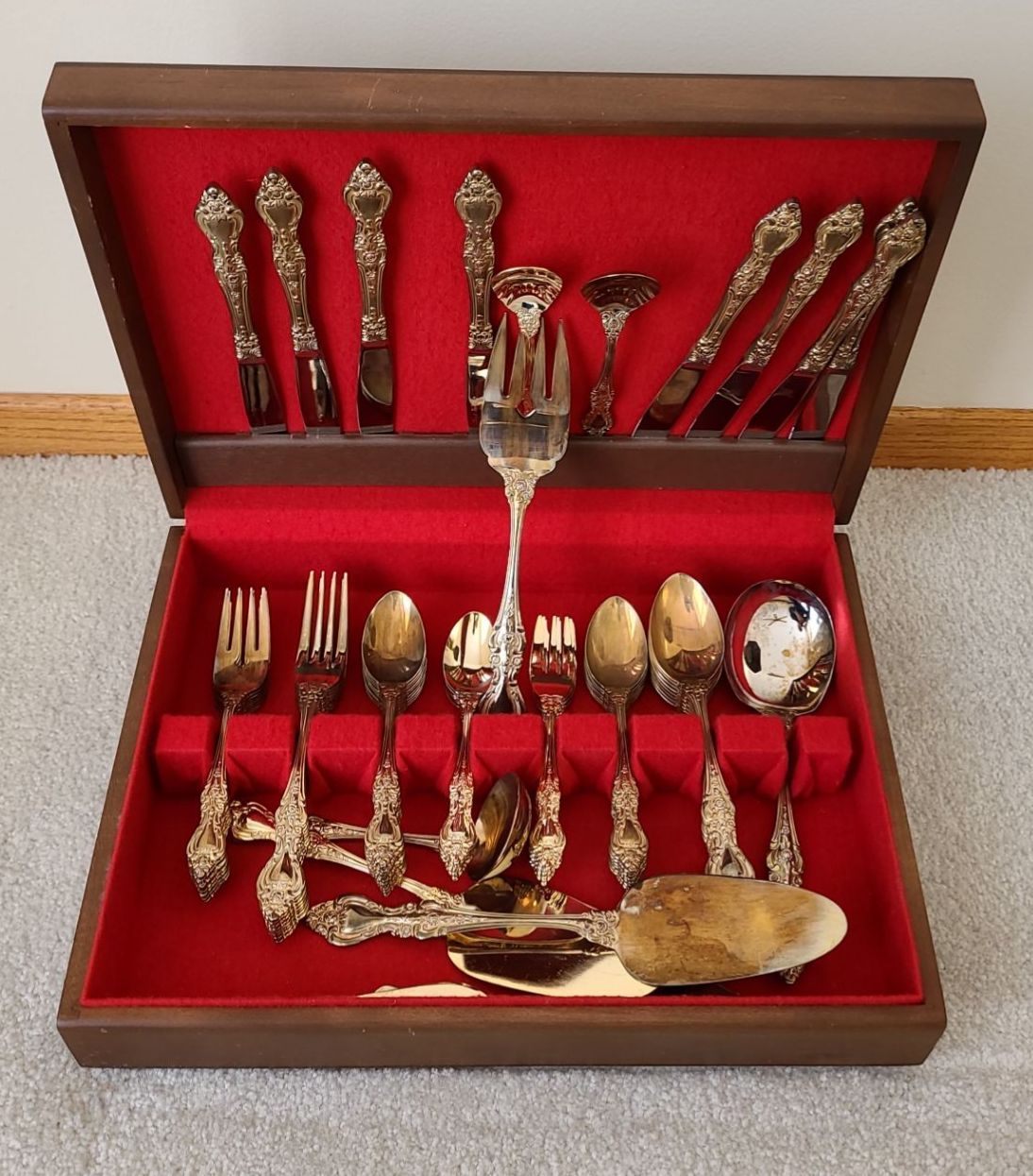 Royal Sealy 24k GP Stainless Steel Cutlery Set in Wooden Box w/ Red Velvet Trim
