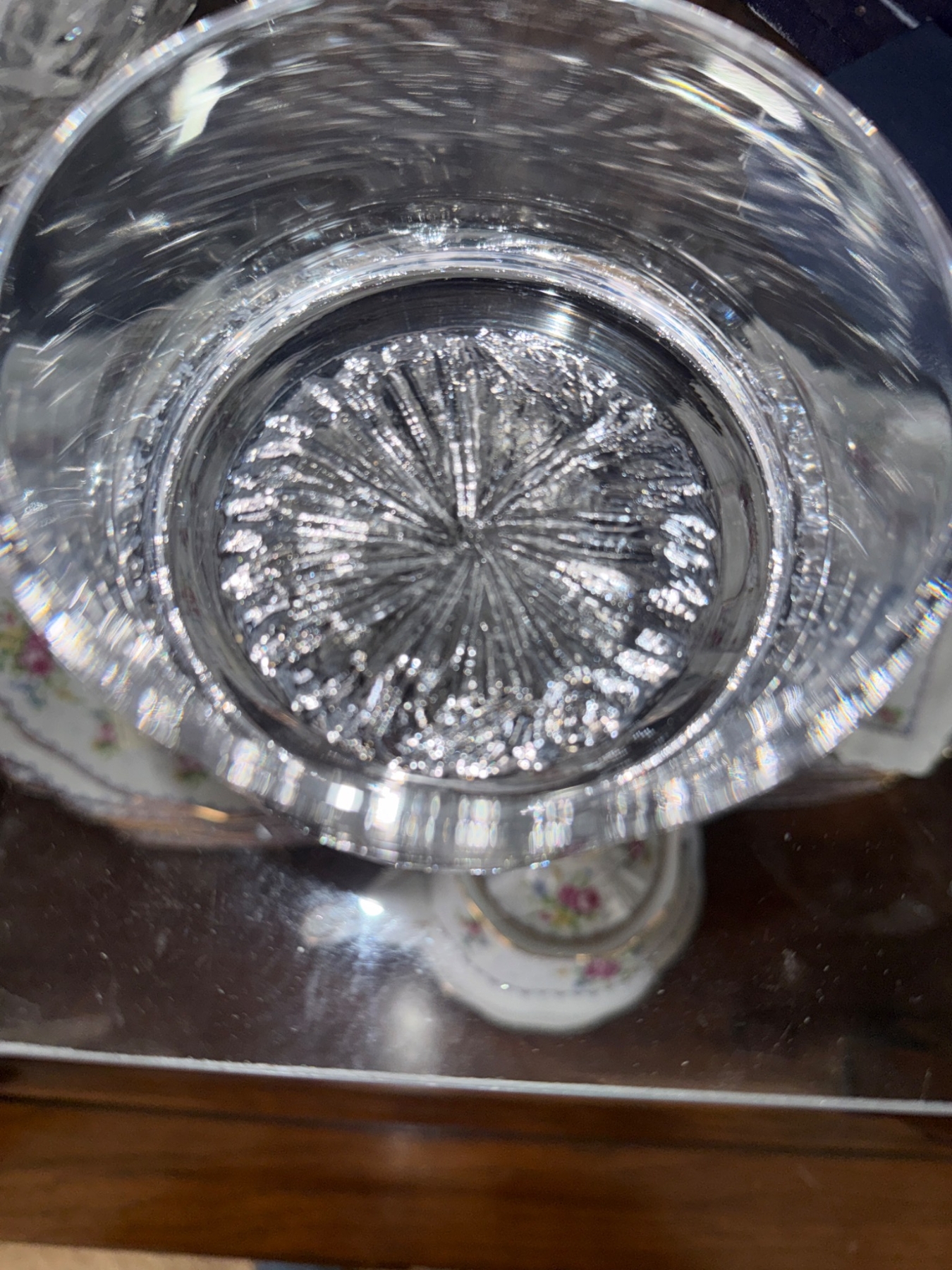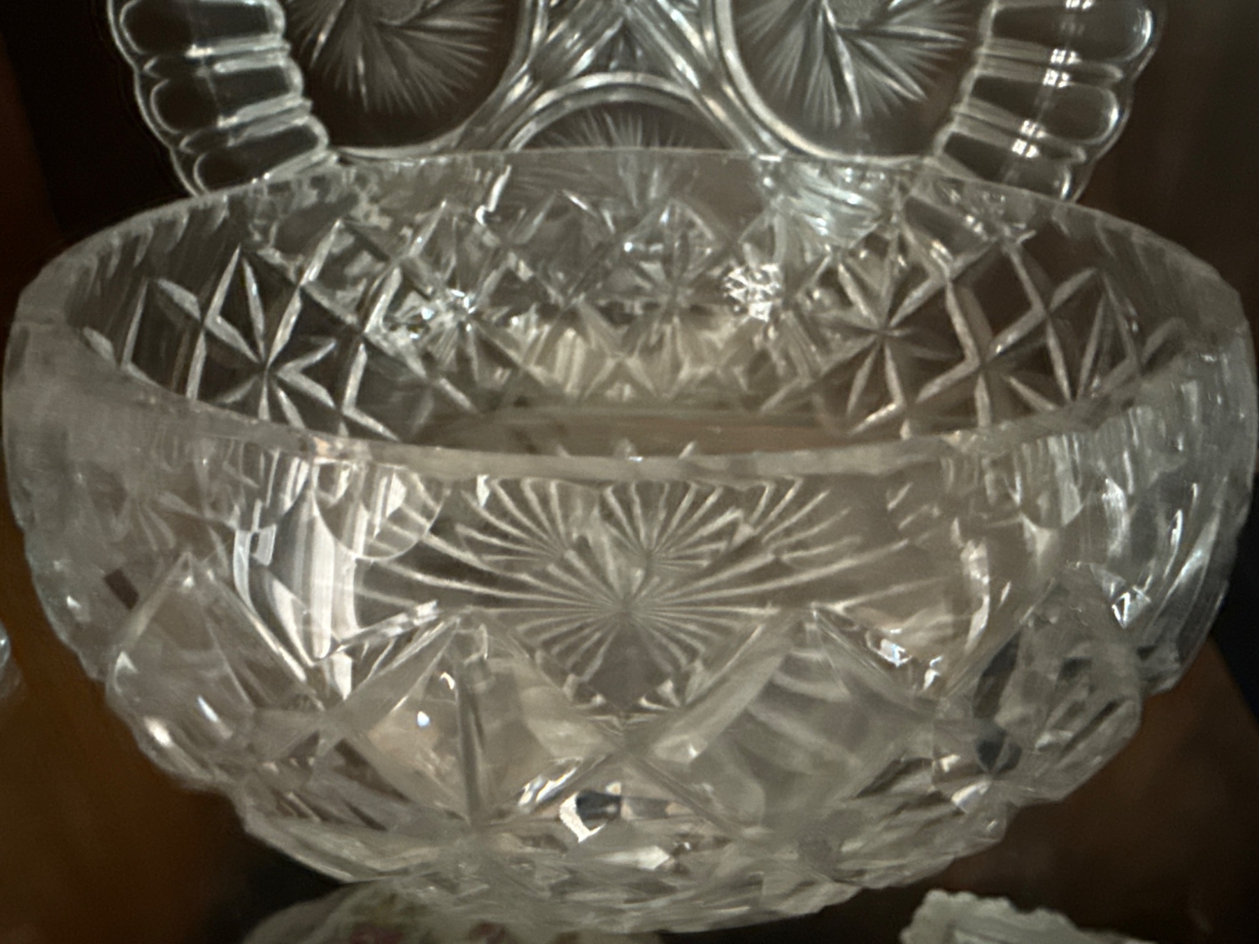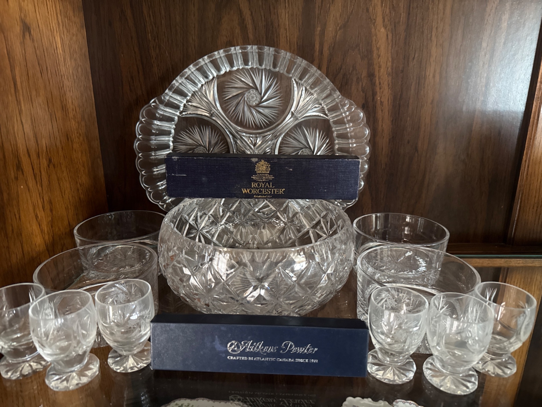 Elegant collection featuring a Royal Worcester crystal bowl, divided serving plate, six footed glasses, and four tumblers, all with intricate cut patterns that enhance their brilliance. Includes two serving utensils: one with a porcelain grapevine handle and the other with an ornate metal design. Ideal for entertaining or collectors of fine crystal and tabletop decor.