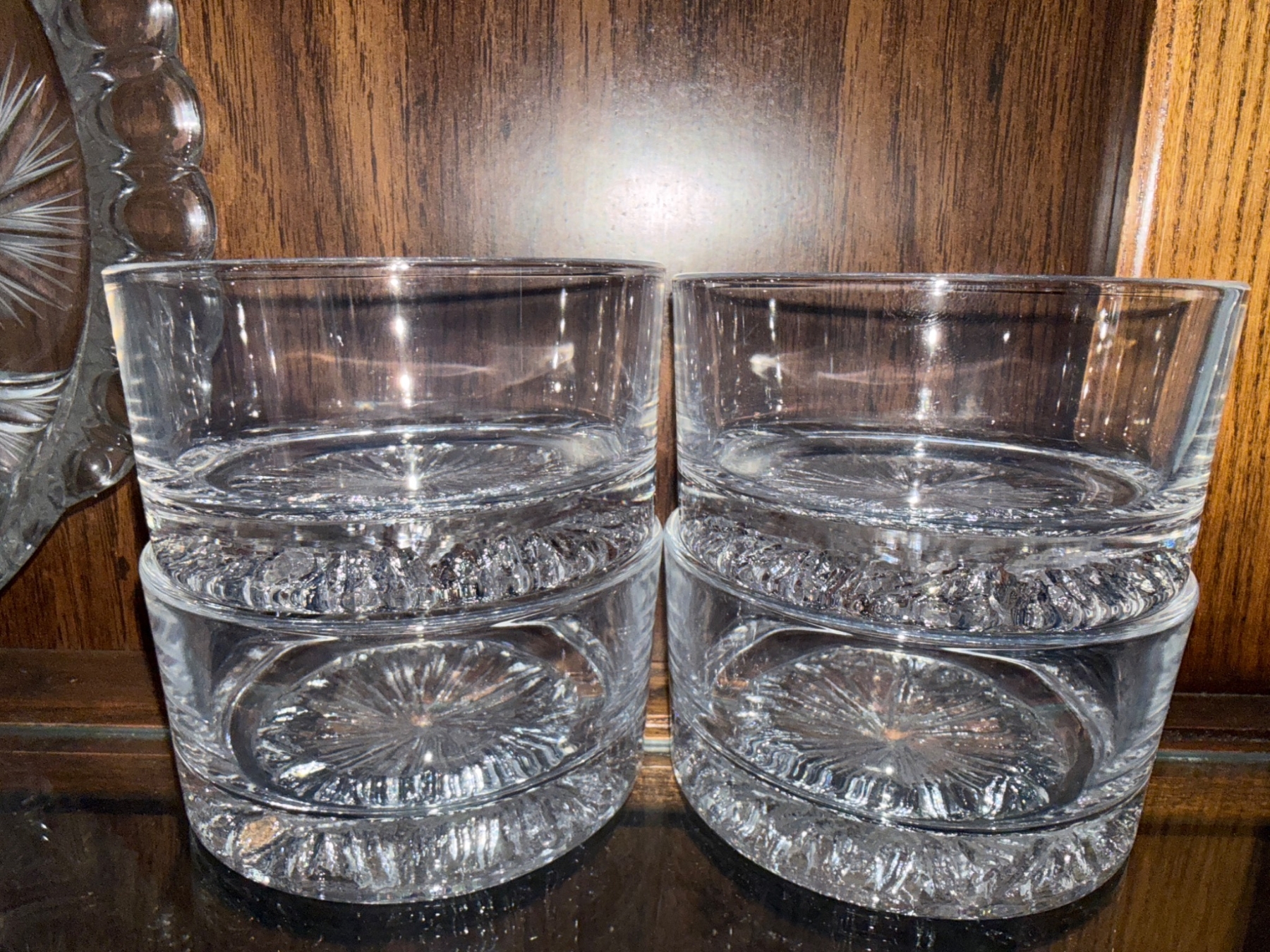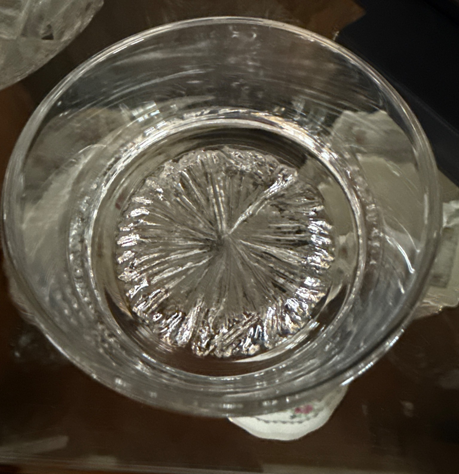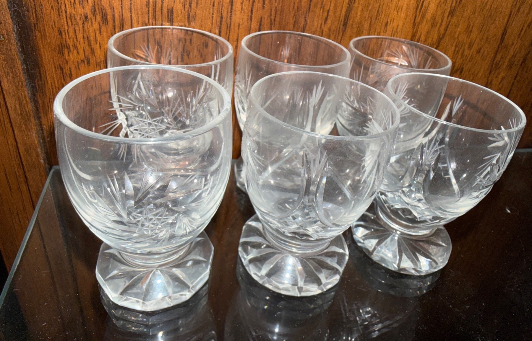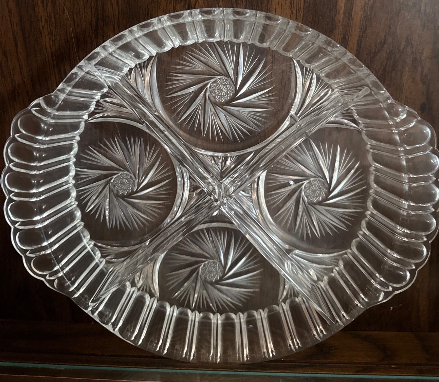 Elegant collection featuring a Royal Worcester crystal bowl, divided serving plate, six footed glasses, and four tumblers, all with intricate cut patterns that enhance their brilliance. Includes two serving utensils: one with a porcelain grapevine handle and the other with an ornate metal design. Ideal for entertaining or collectors of fine crystal and tabletop decor.