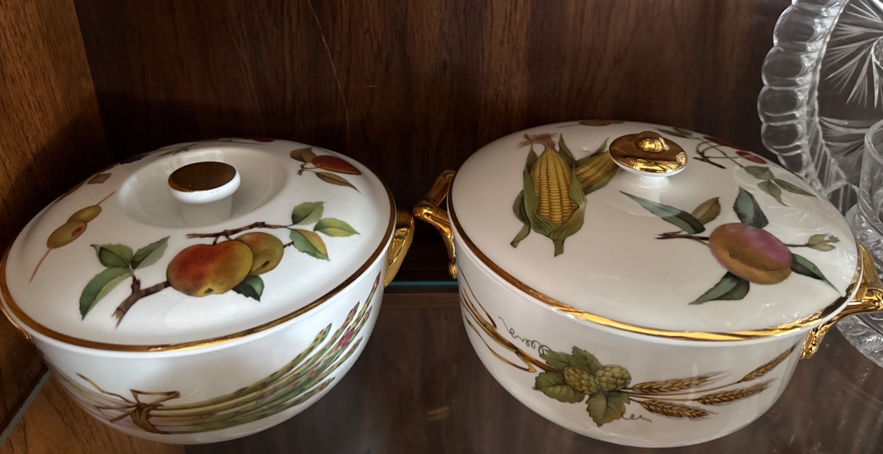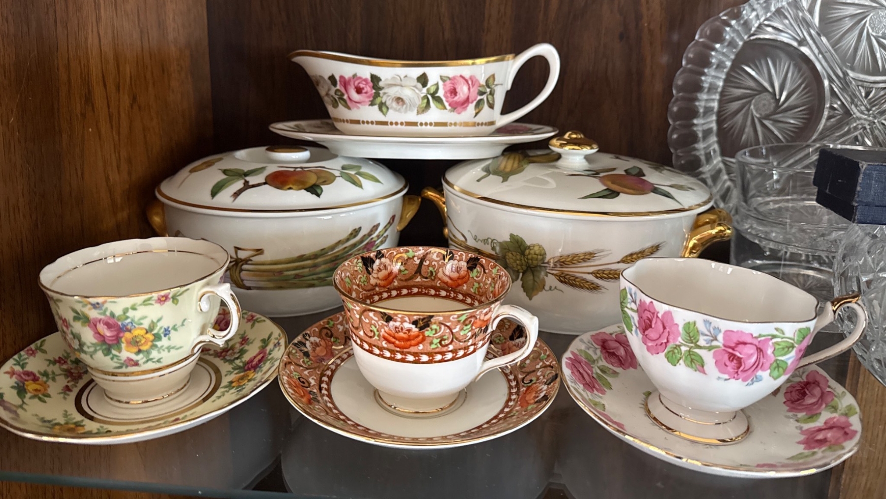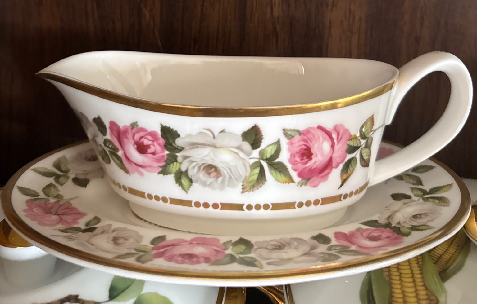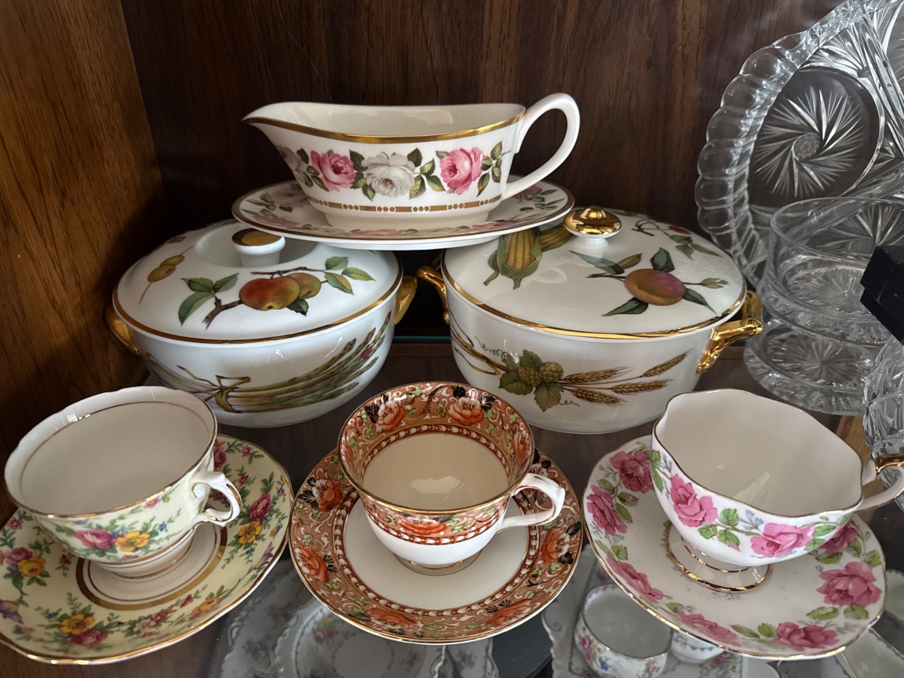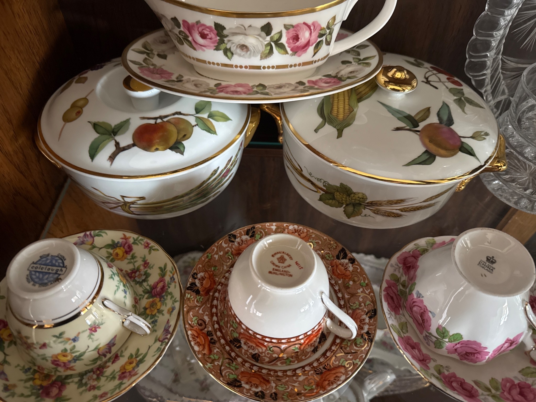 Fine bone china set by Royal Worcester, England, featuring a teacup and saucer trio and two lidded dishes. Includes Burlington Cocolo pattern on the orange teacup and floral motifs on the other pieces. The cream and sugar set showcases delicate pink and white rose designs. All items are accented with elegant gilt detailing, displaying exceptional craftsmanship. Measurements not provided.