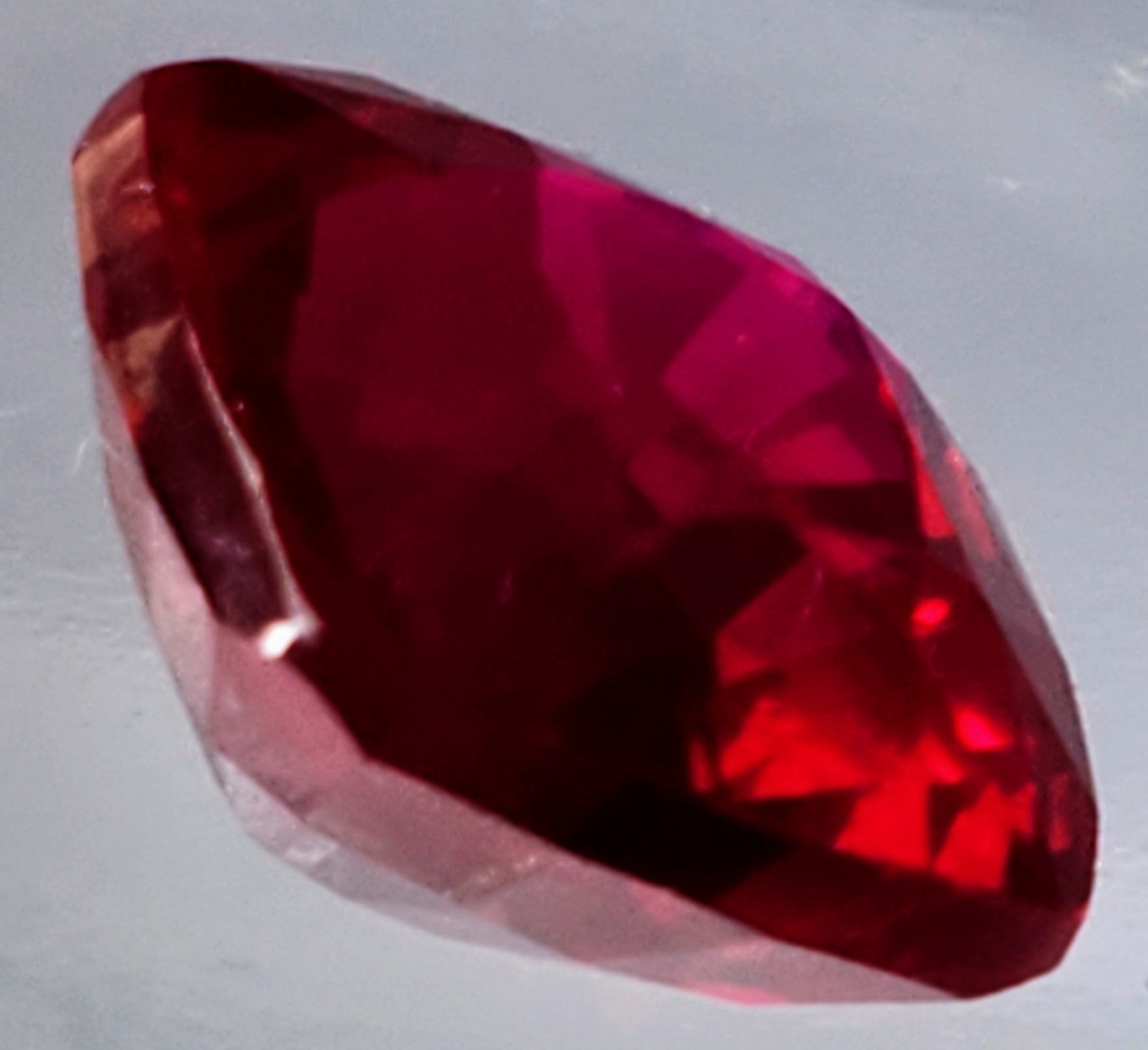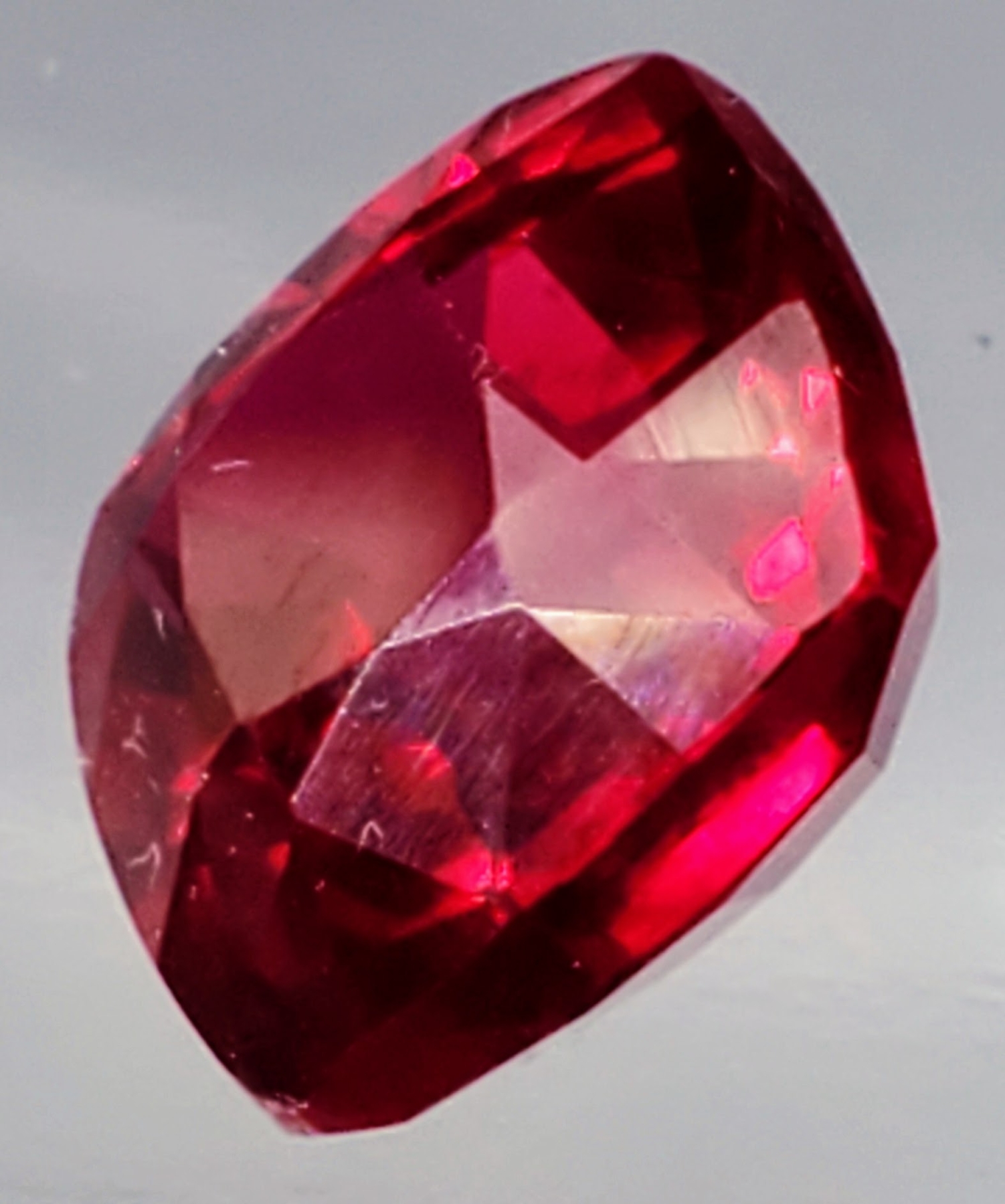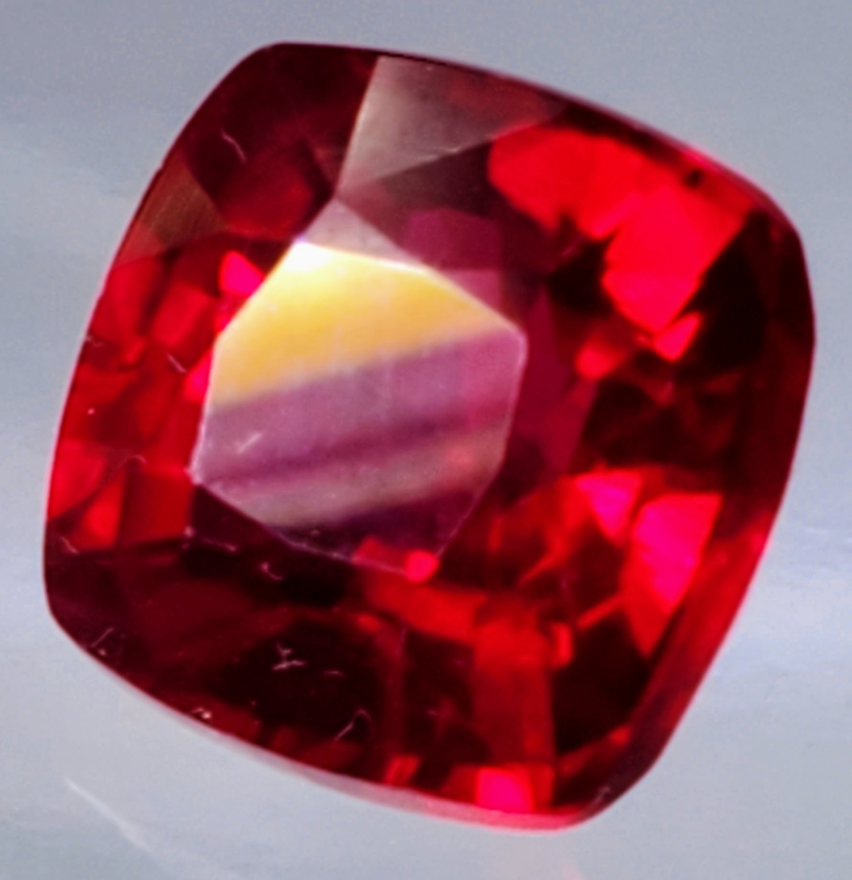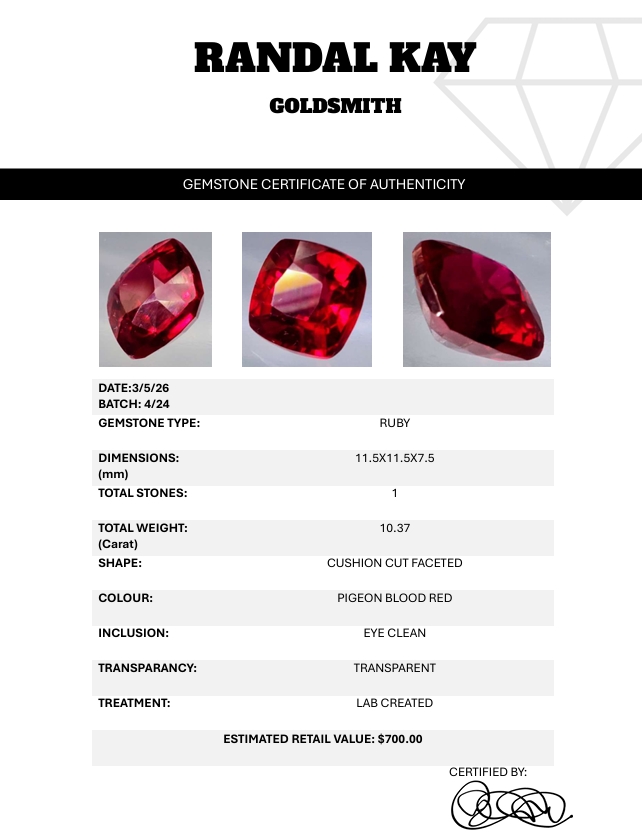 This 10.37-carat lab-created ruby features rich pigeon-blood red color, eye-clean clarity, and cushion faceting, offering bold brilliance and symmetry. Estimated retail price is $700.