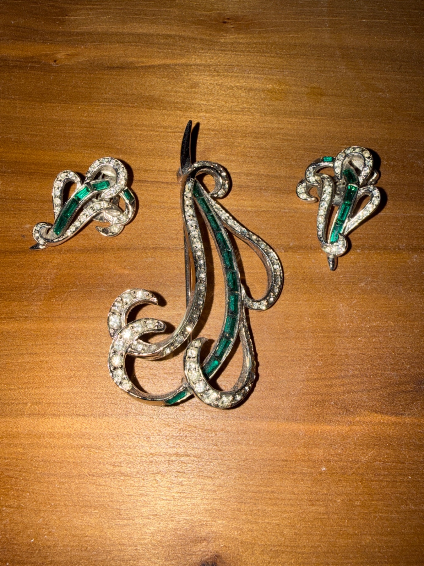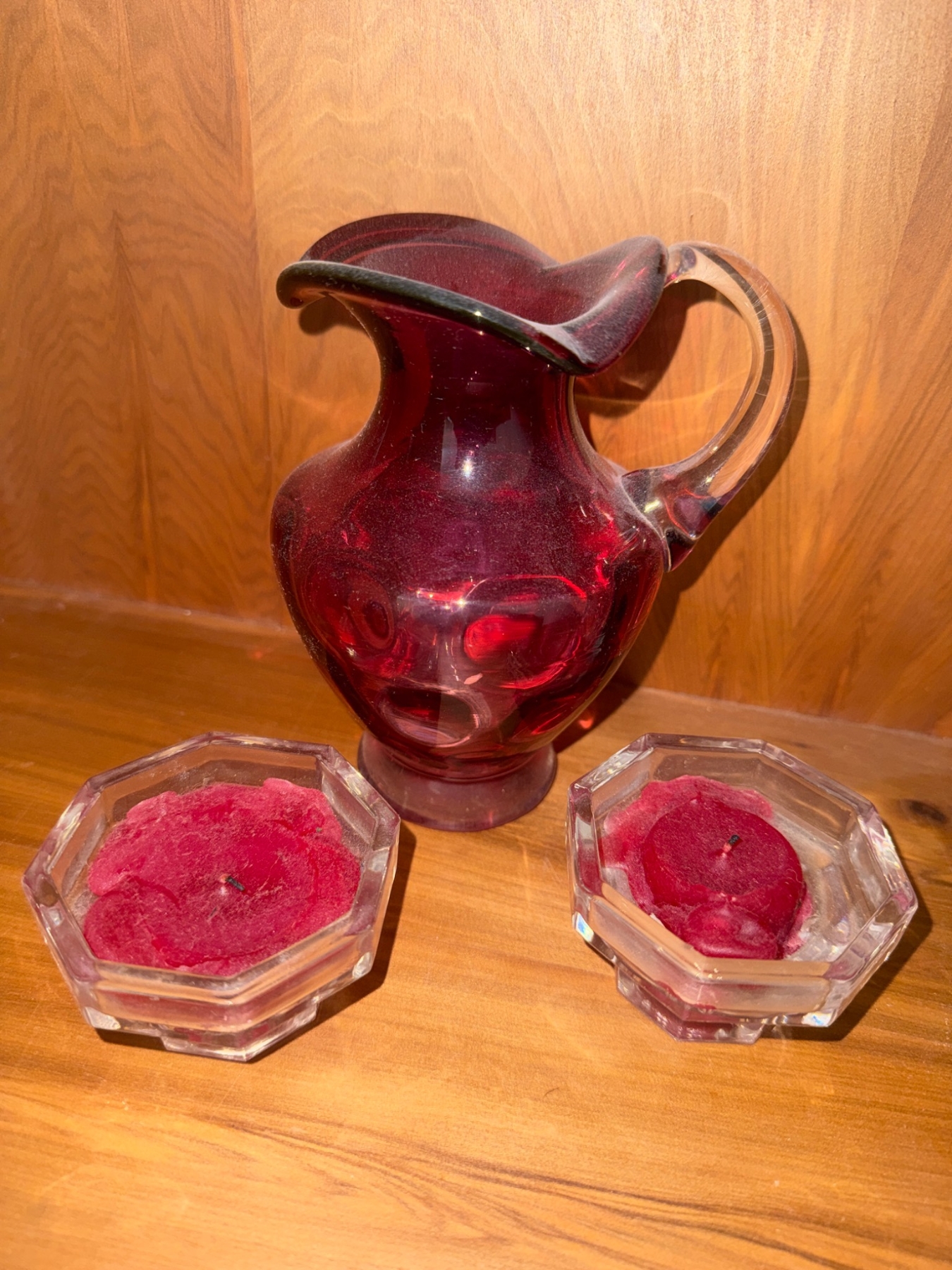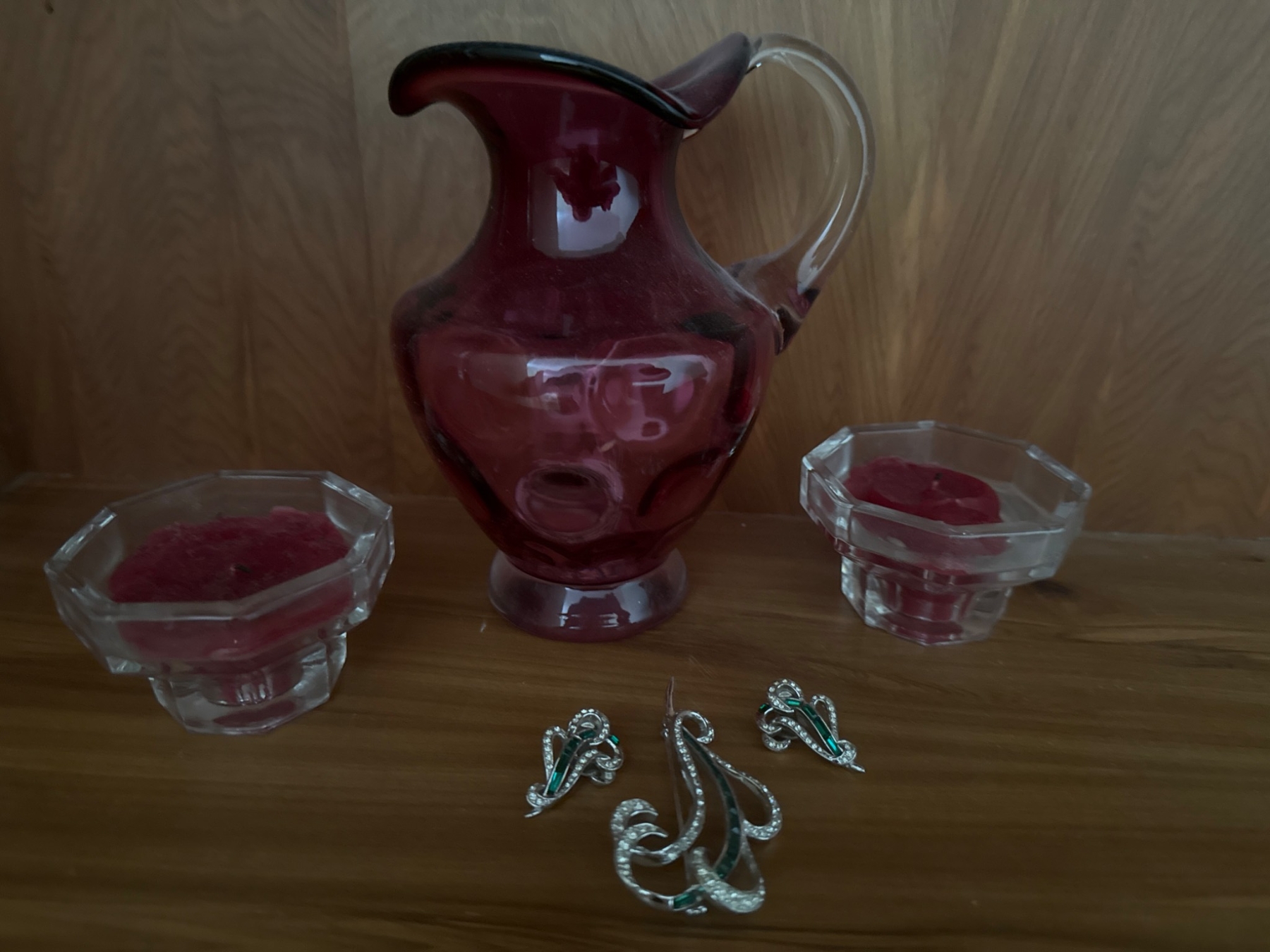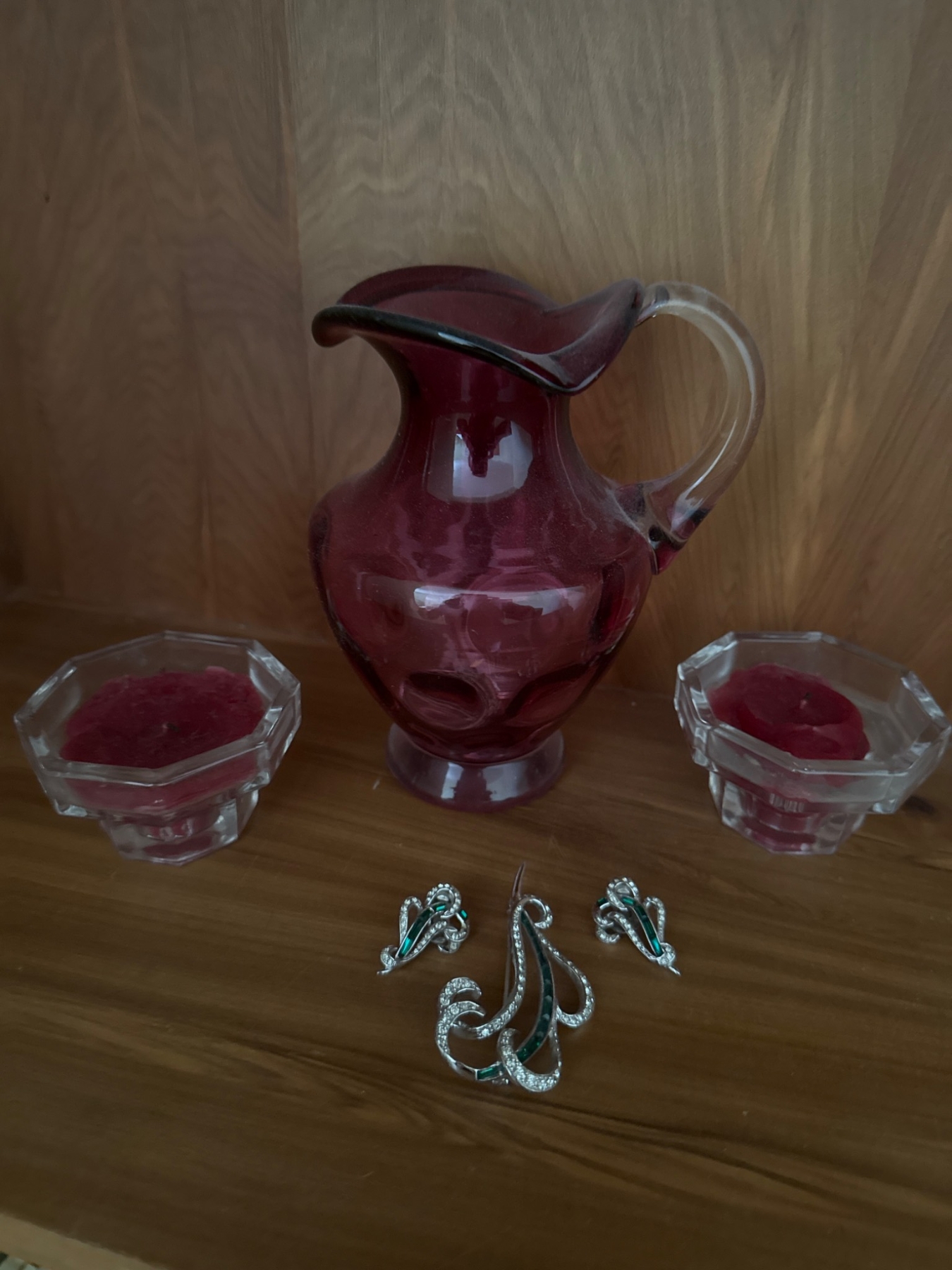- Includes a ruby red glass pitcher with a clear handle. | - Dimensions of the pitcher: approximately 9.5 inches high and 6 inches wide at the widest point. | - Pair of crystal candle holders with octagonal bases, each holding red wax candles. | - Measurements of the candle holders: approximately 3 inches in height and 4 inches in diameter. | - Matching vintage jewelry set includes a large brooch and a pair of clip-on earrings. | - Jewelry features ornate metalwork with green and clear rhinestone embellishments.