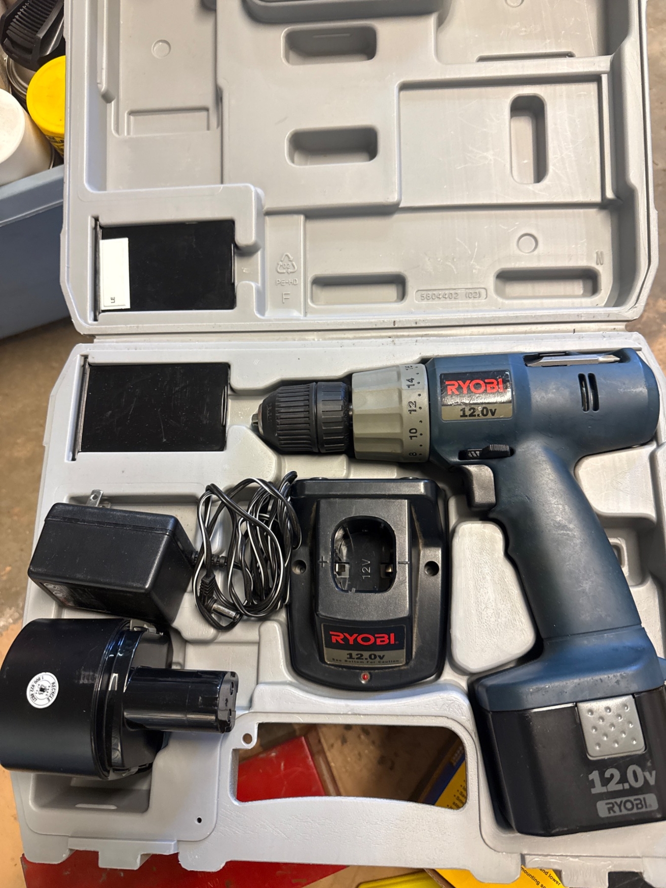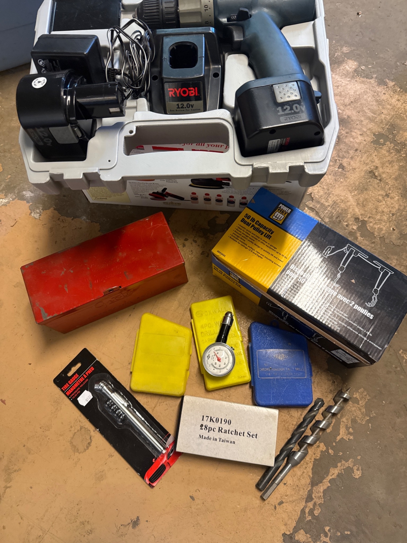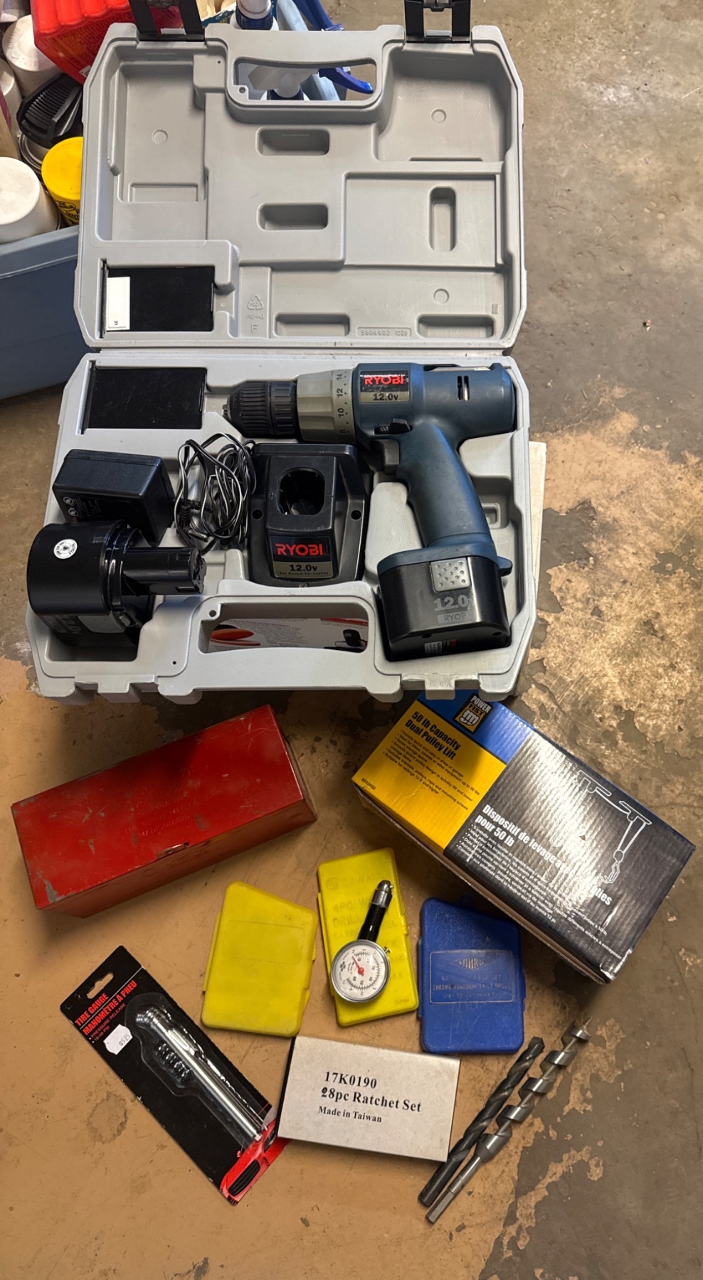 Includes a Ryobi 12V power drill with charger, two 12V batteries, and a hard carrying case. The lot also features a 50 lb capacity dual pulley kit, tire gauge, 28-piece ratchet set, and additional bits. Ideal for DIY enthusiasts or professionals. Case measures approximately 14in L x 12in W x 4in H. Drill and accessories show wear consistent with prior use.