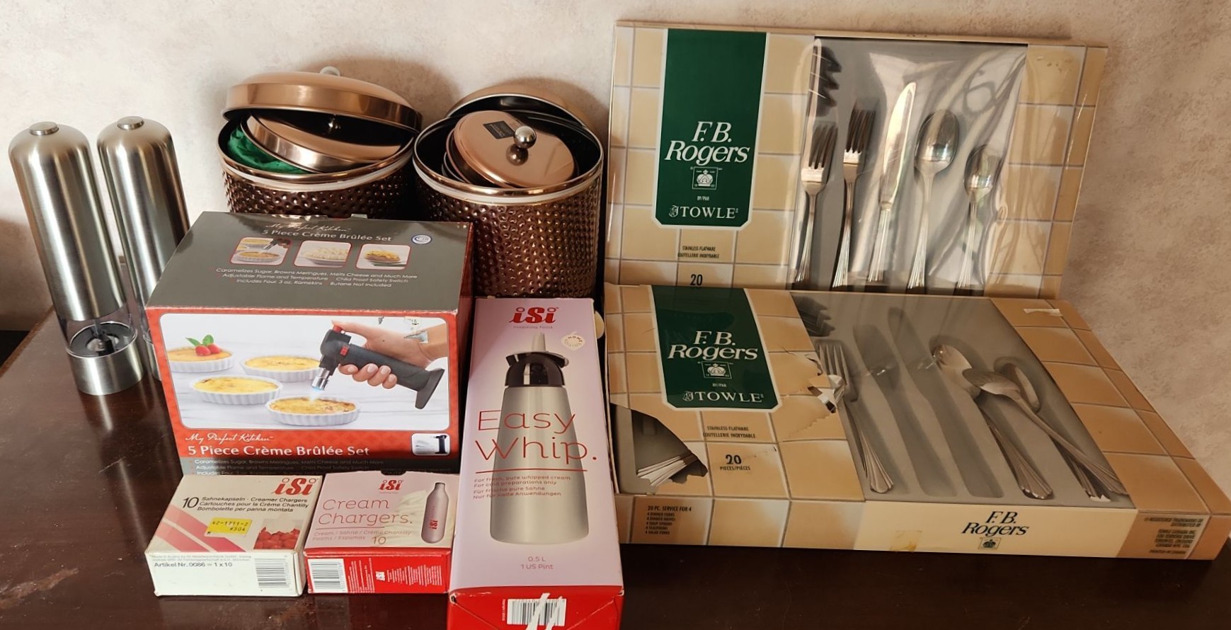 Salt/ Pepper Grinders, 4 Canisters, Flatware (Full and Partial Set), Creme Brulee Set, Isi Easy Whip