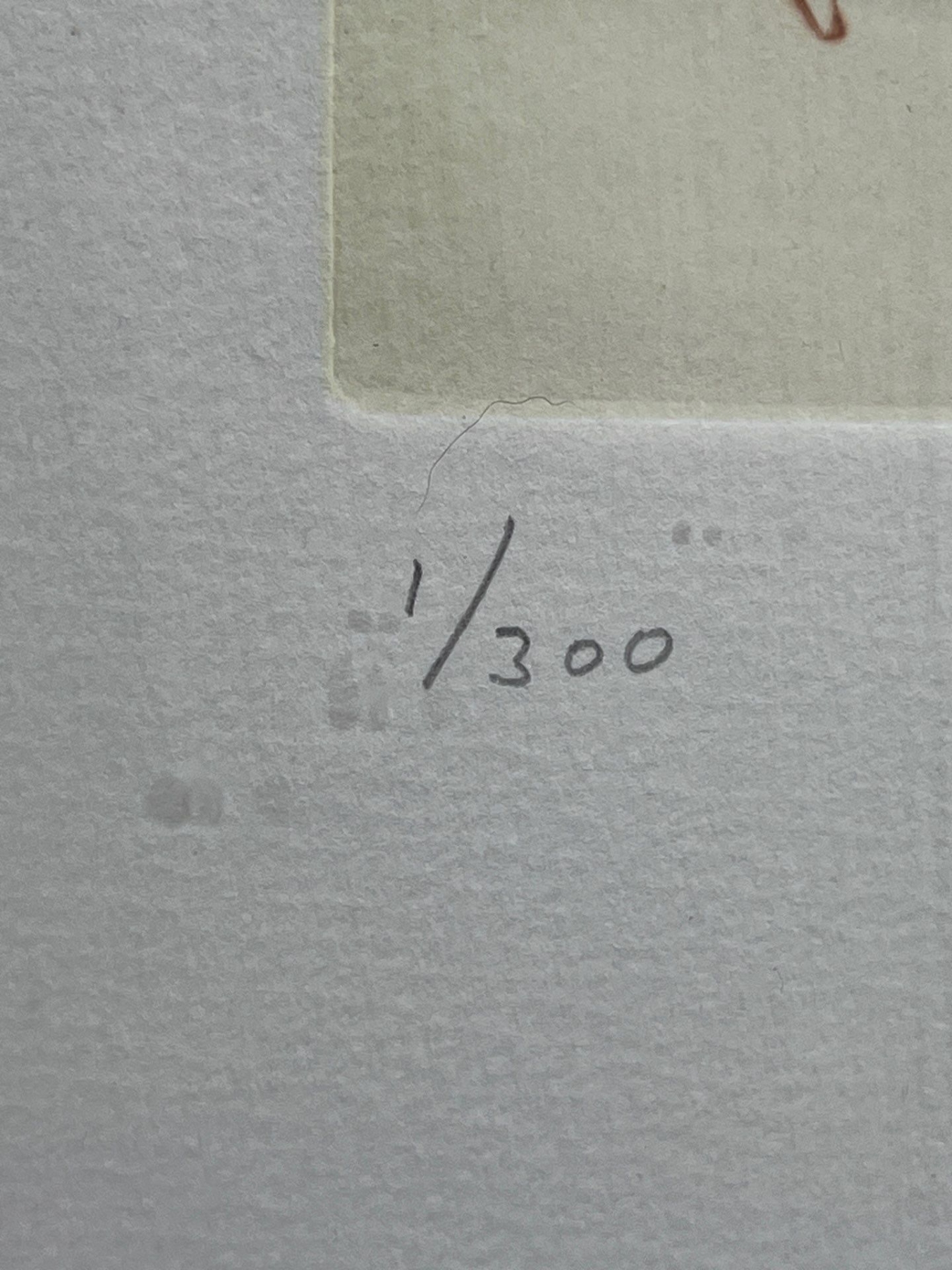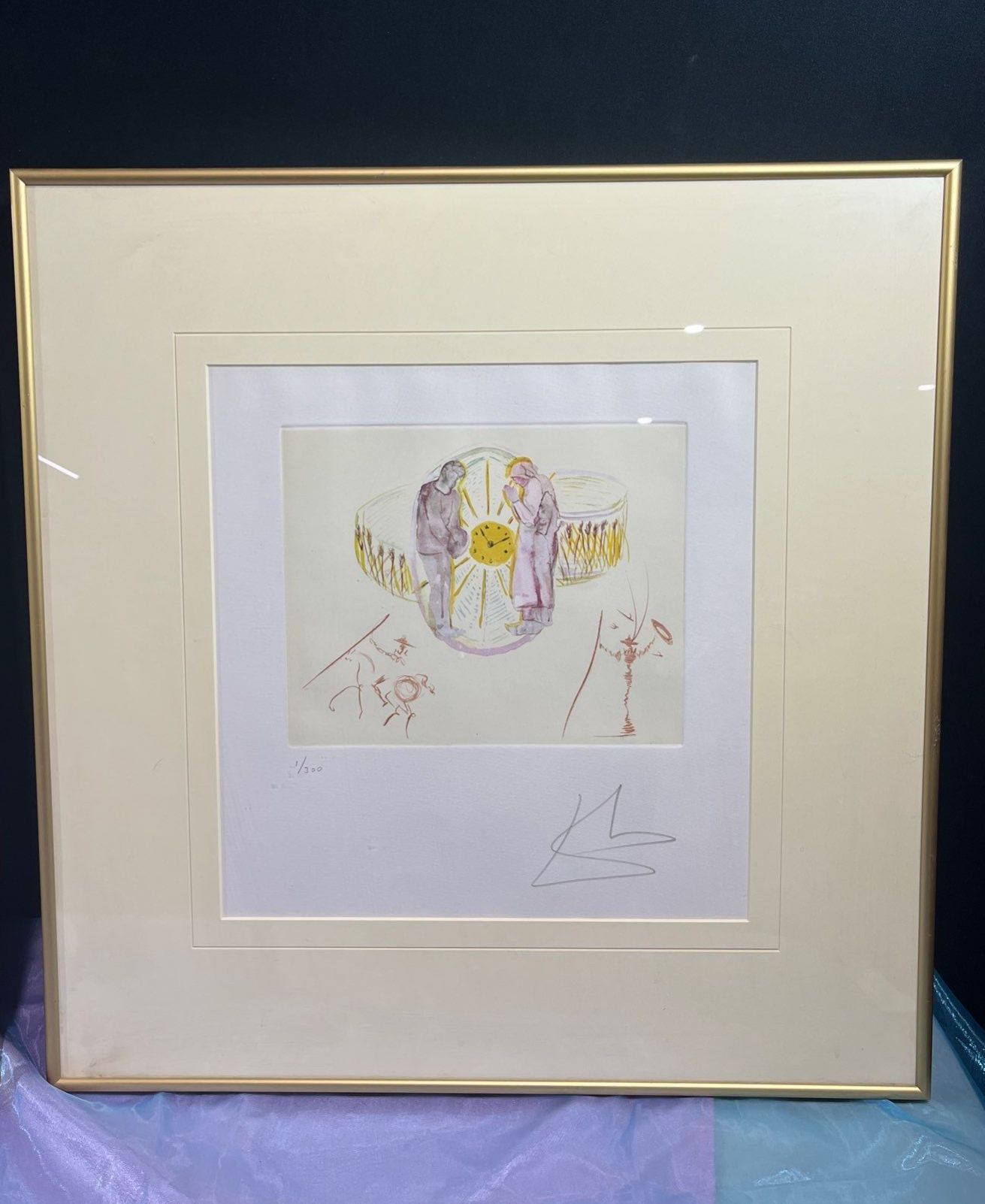 This is edition #1/300 - the very first impression of this limited edition suite - making it exceptionally rare and desirable to collectors. Each etching measures 14.75" × 22" and features Dali's authentic signature along with authentication from Albert Field, Dali's official archivist. The works are elegantly presented in gold-detailed wooden frames with complementary pink matting, enhancing the visual impact of these remarkable pieces. The complete framed set represents a significant collection opportunity, showcasing Dali's masterful technique and philosophical depth during his later creative period. Current market values for authenticated complete suites range from $7,800 to $9,250, with this #1 edition potentially commanding premium pricing.