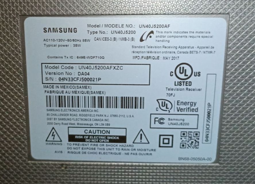 Samsung Television ModNo: UN40J5200AF