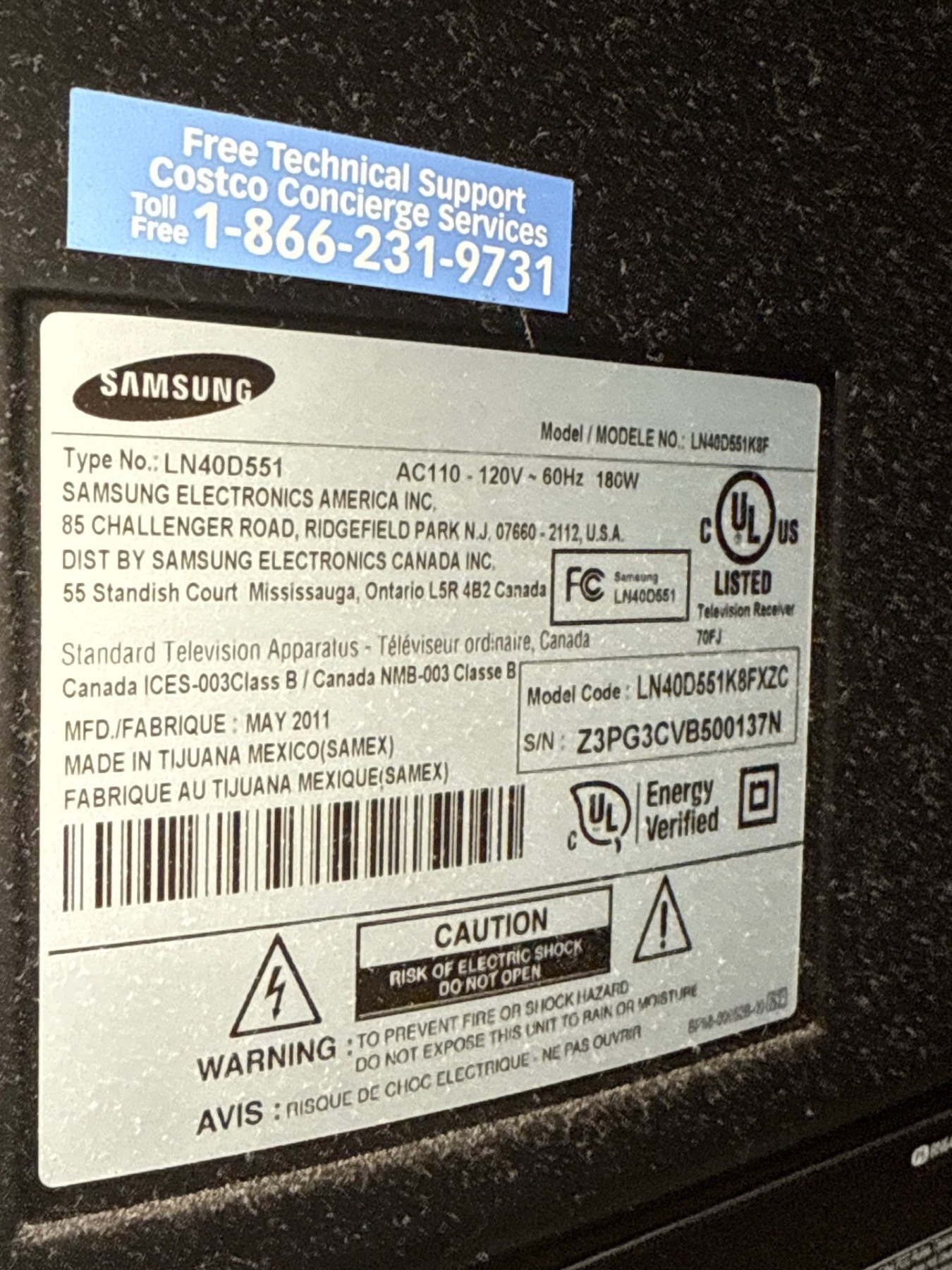 Samsung Television w/ Mount Model No. LN40D551K8F (35w)