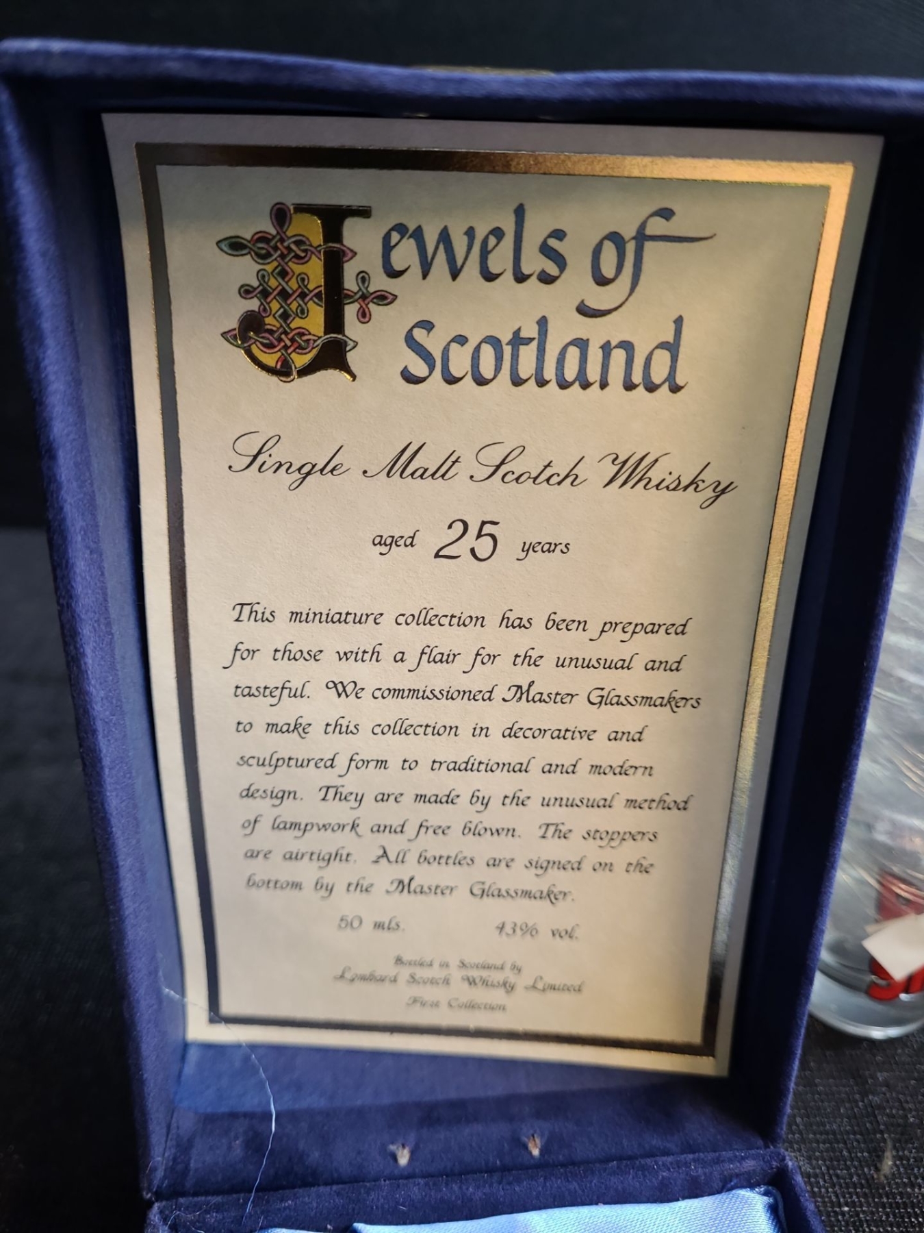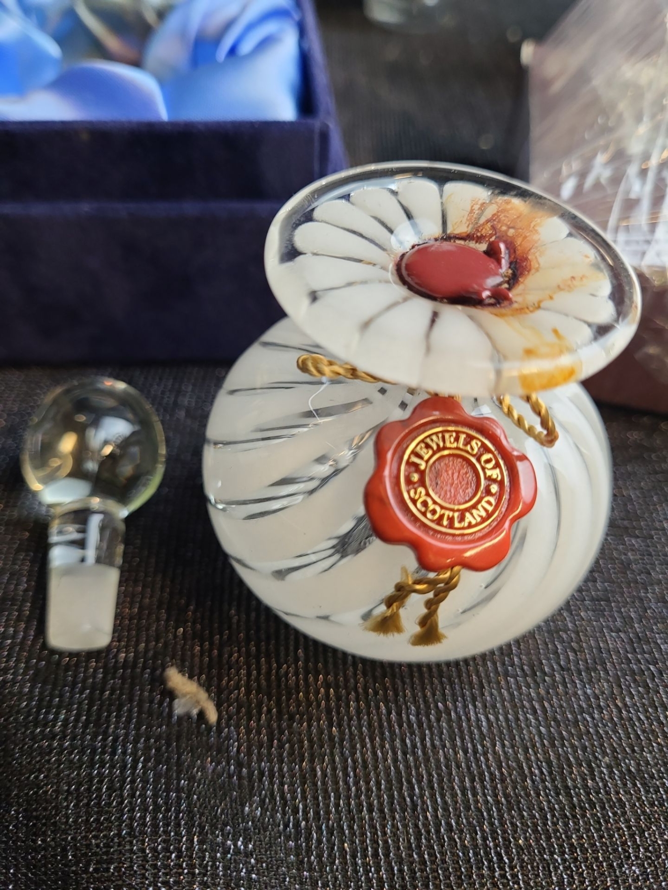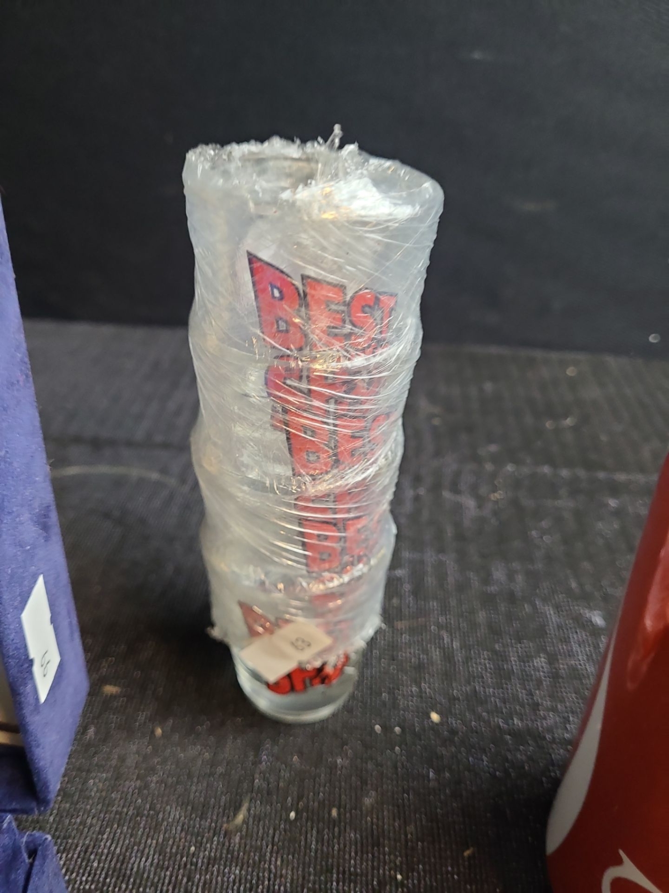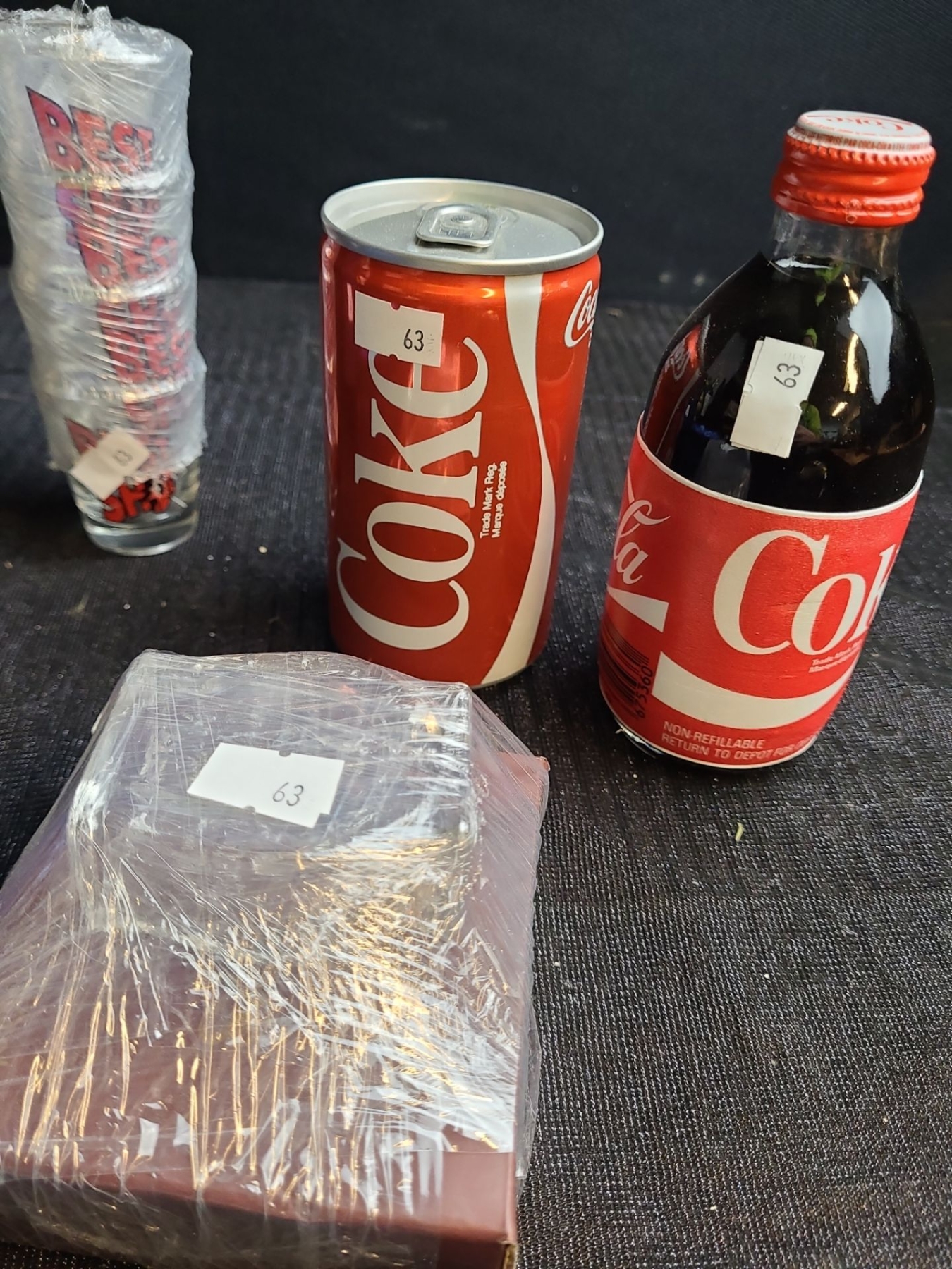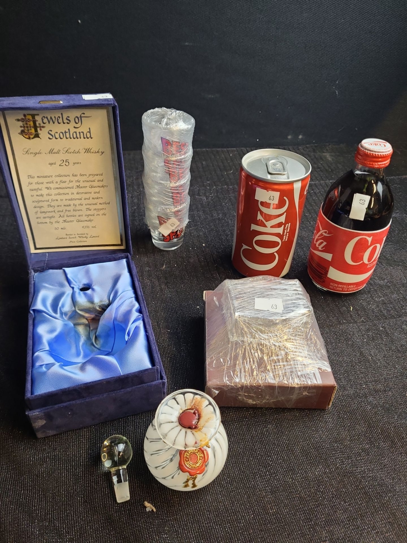 Mixed lot with beautiful scotch bottle and stopper with decorative box, a stack of graphic shot glasses, Older Coke bottles, sealed and ashstray