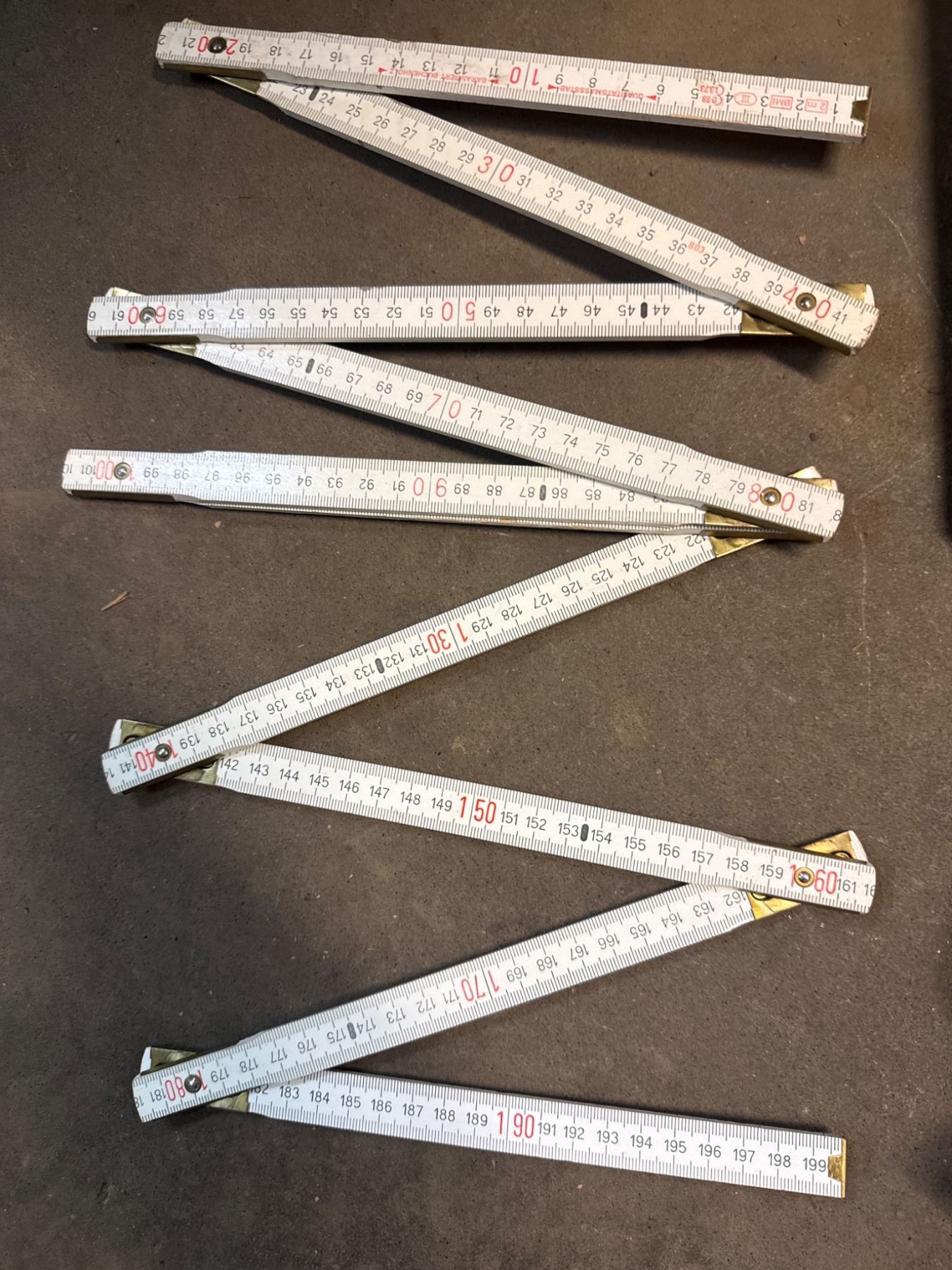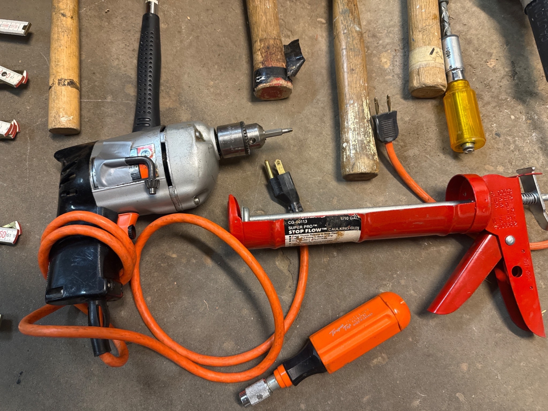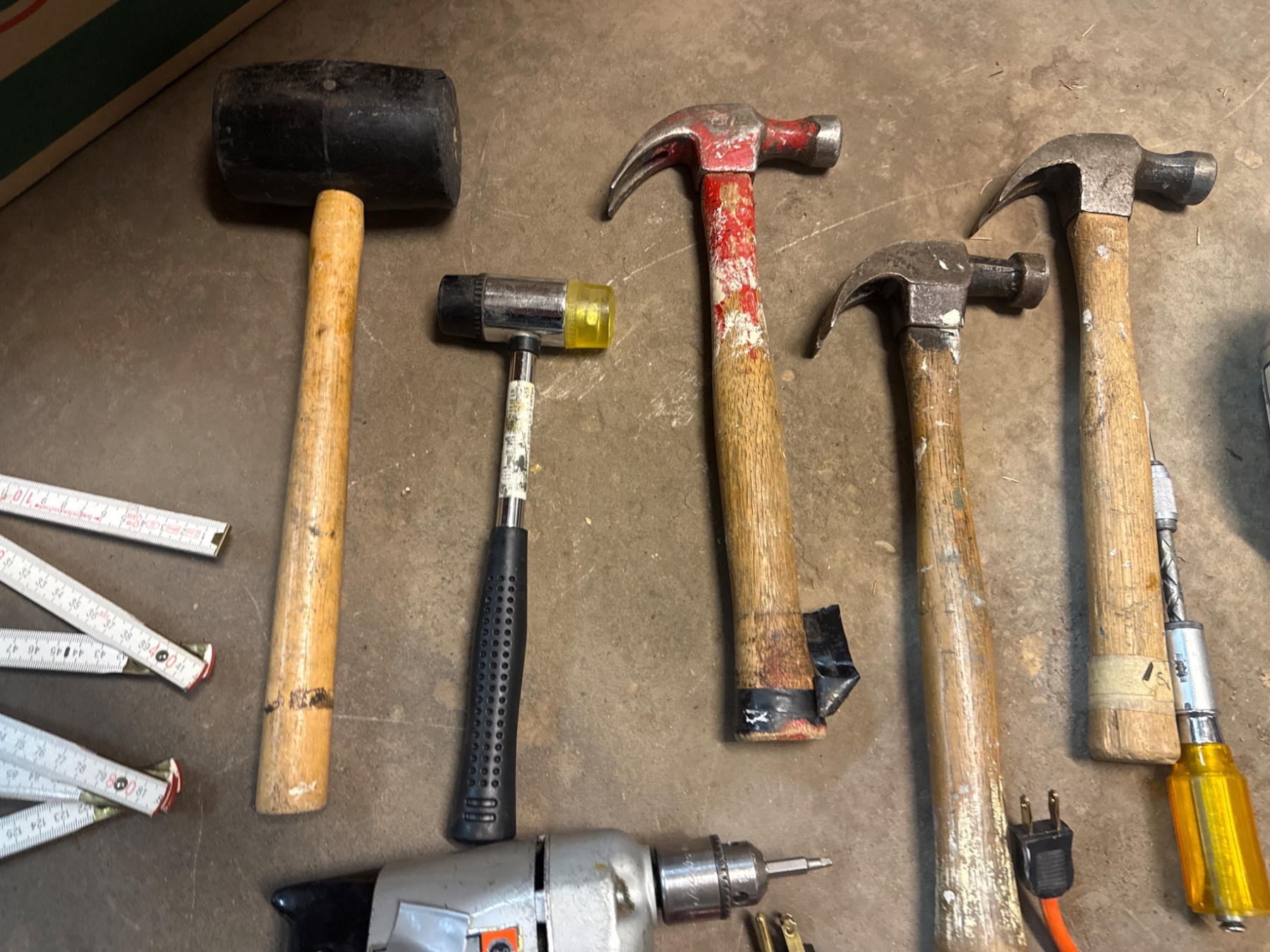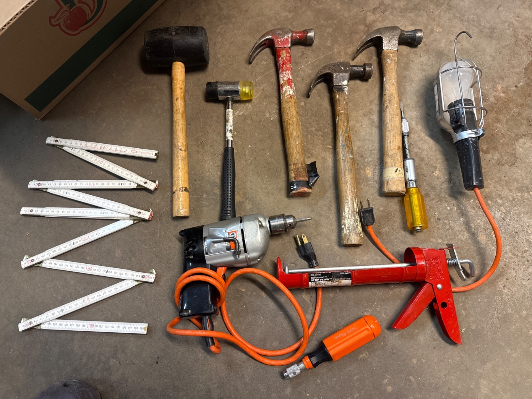An assortment of hand and power tools, featuring five hammers of various sizes (approx. 12 to 16 inches long), a rubber mallet, and a red caulking gun. Also included are a flexible-folding wooden ruler (extended length approx. 79 inches), an orange hand light with cord, an electric drill (corded), and screwdriver. Items show visible wear and rust consistent with use. Tools sold as-is.