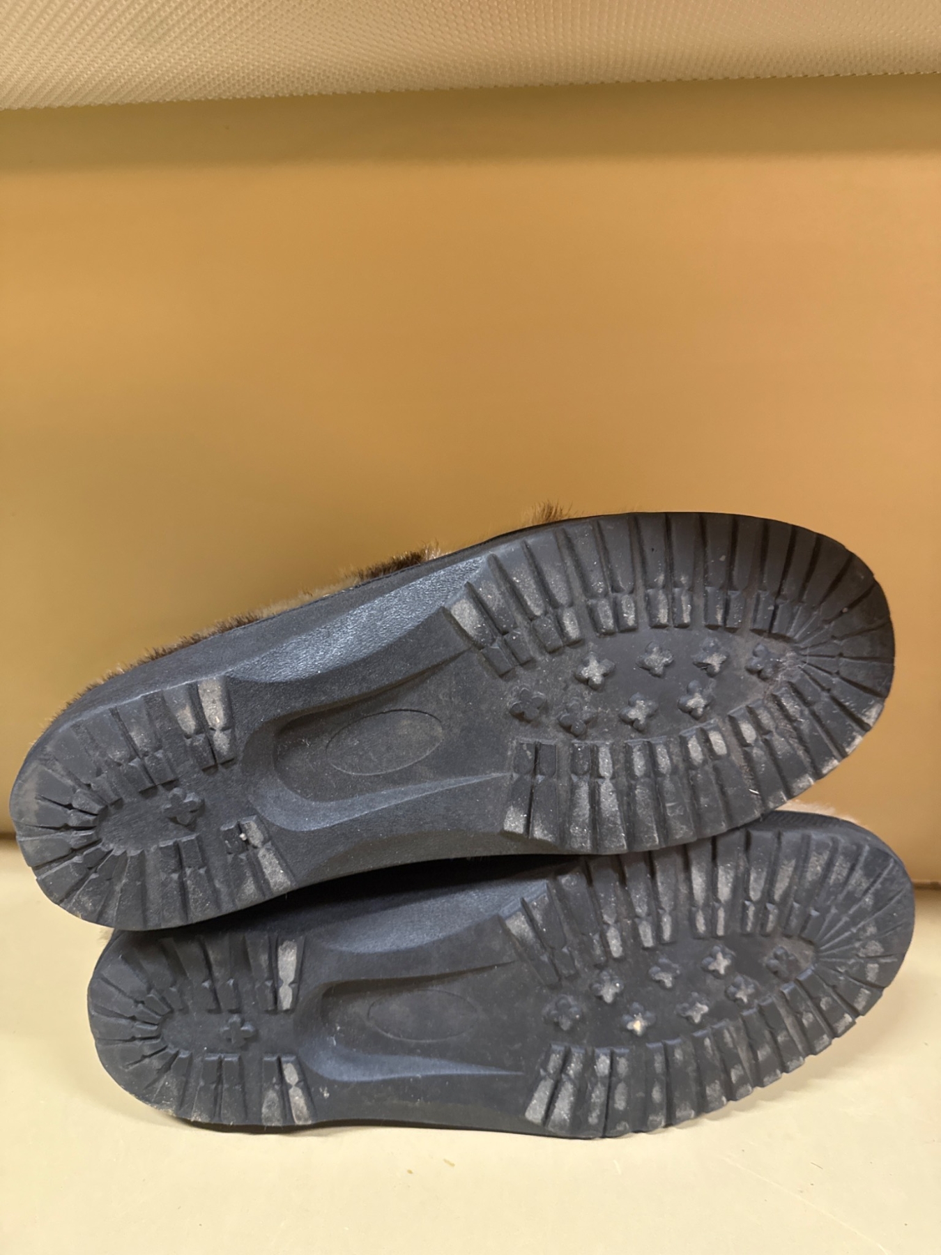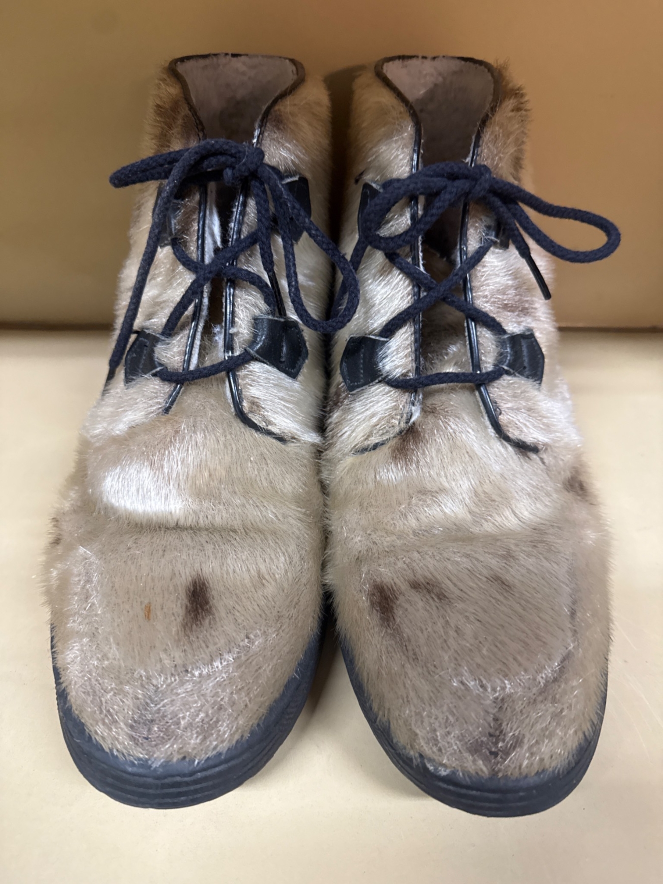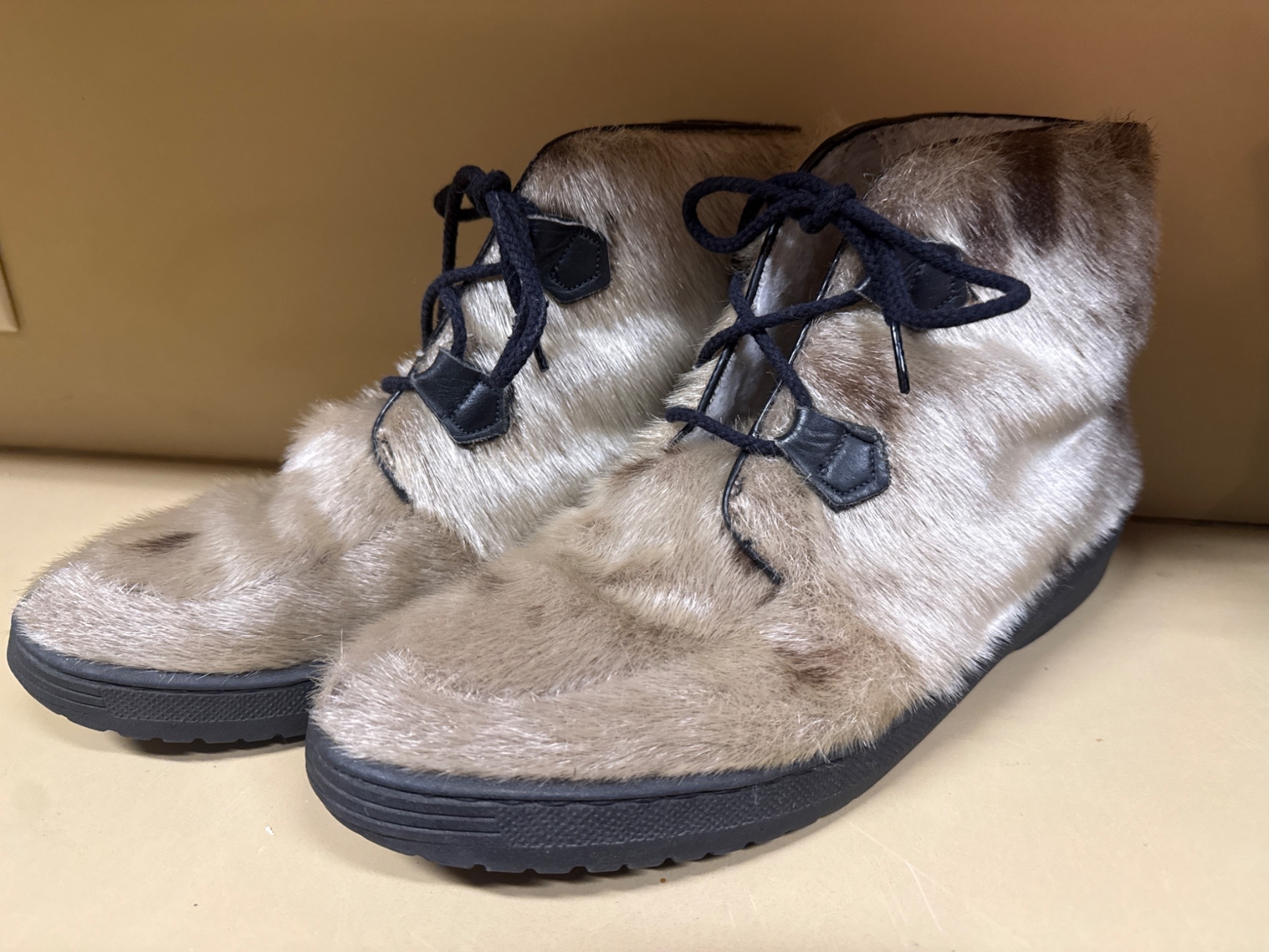 A unique pair of lace-up boots constructed with a fur exterior and sturdy rubber soles. These boots feature a natural fur texture and black laces for a snug fit. The soles provide excellent traction, making them practical for various terrains. Exact size and measurements are unspecified. The condition is good, with visible wear consistent with prior use.