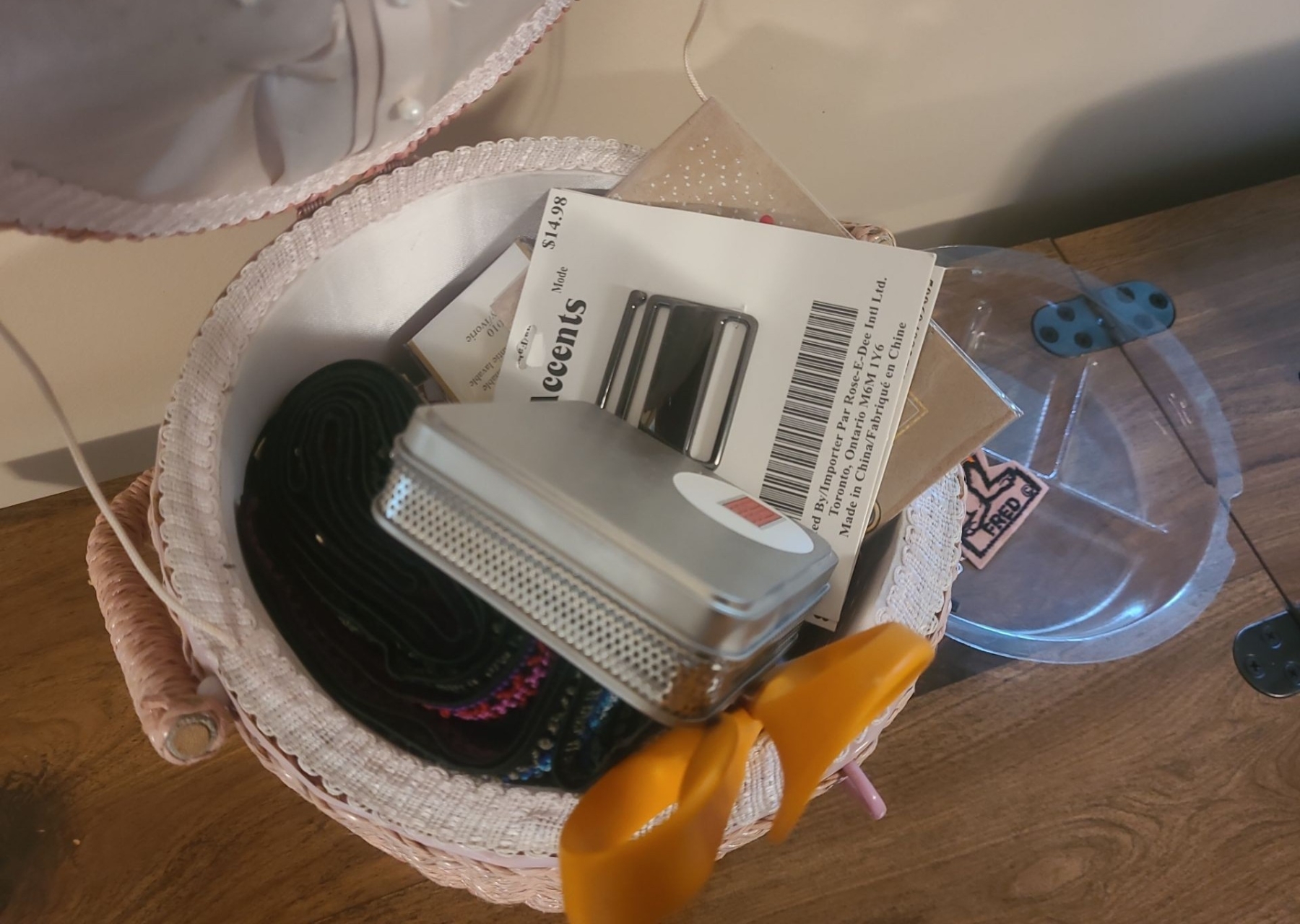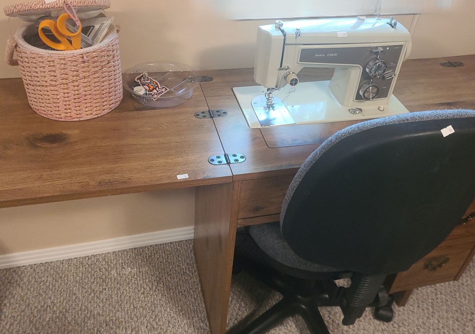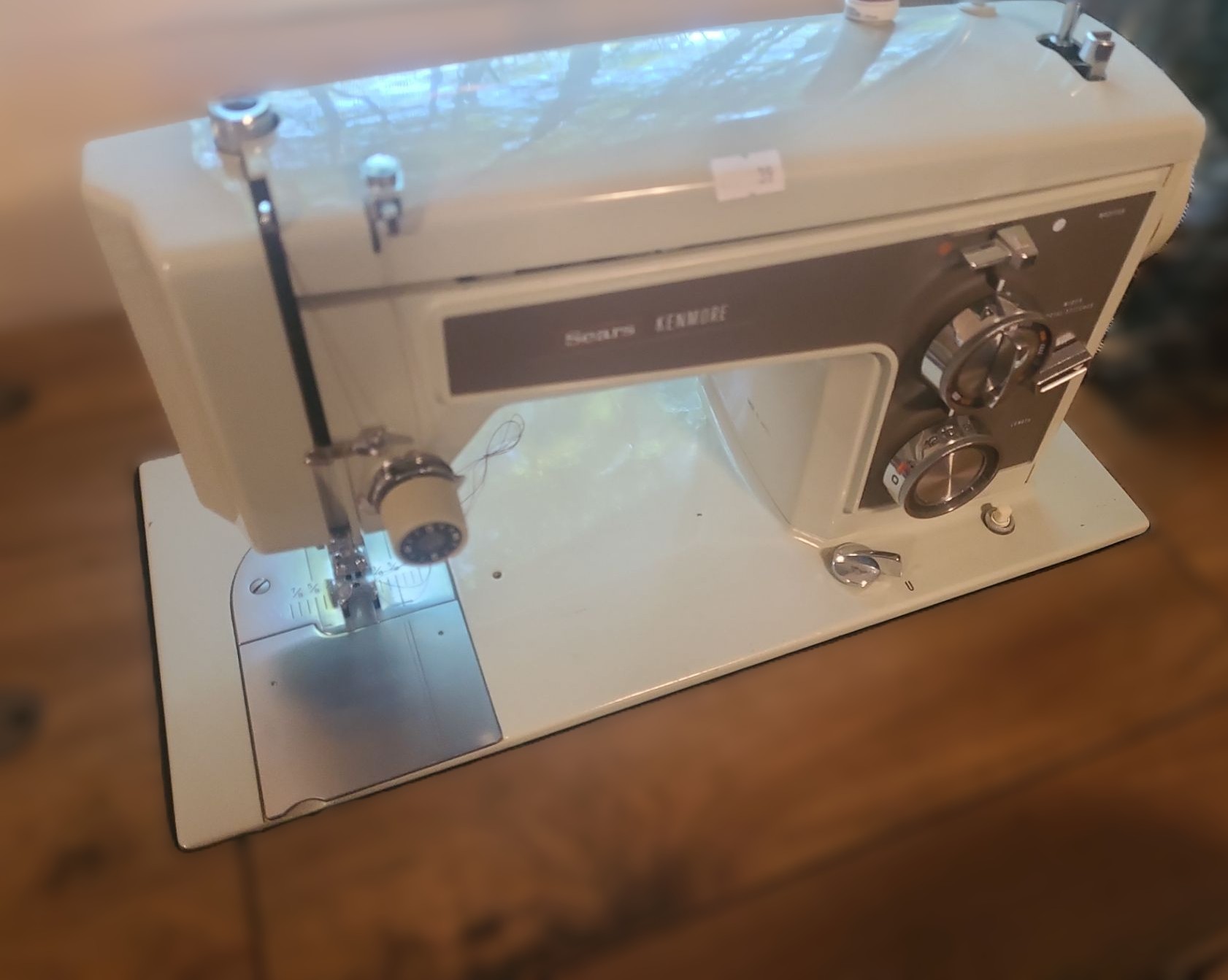 Sears Kenmore Sewing Machine 15814301, Table 63 W Open, 32 Closed, 18 D, 29 T, Basket and Contents