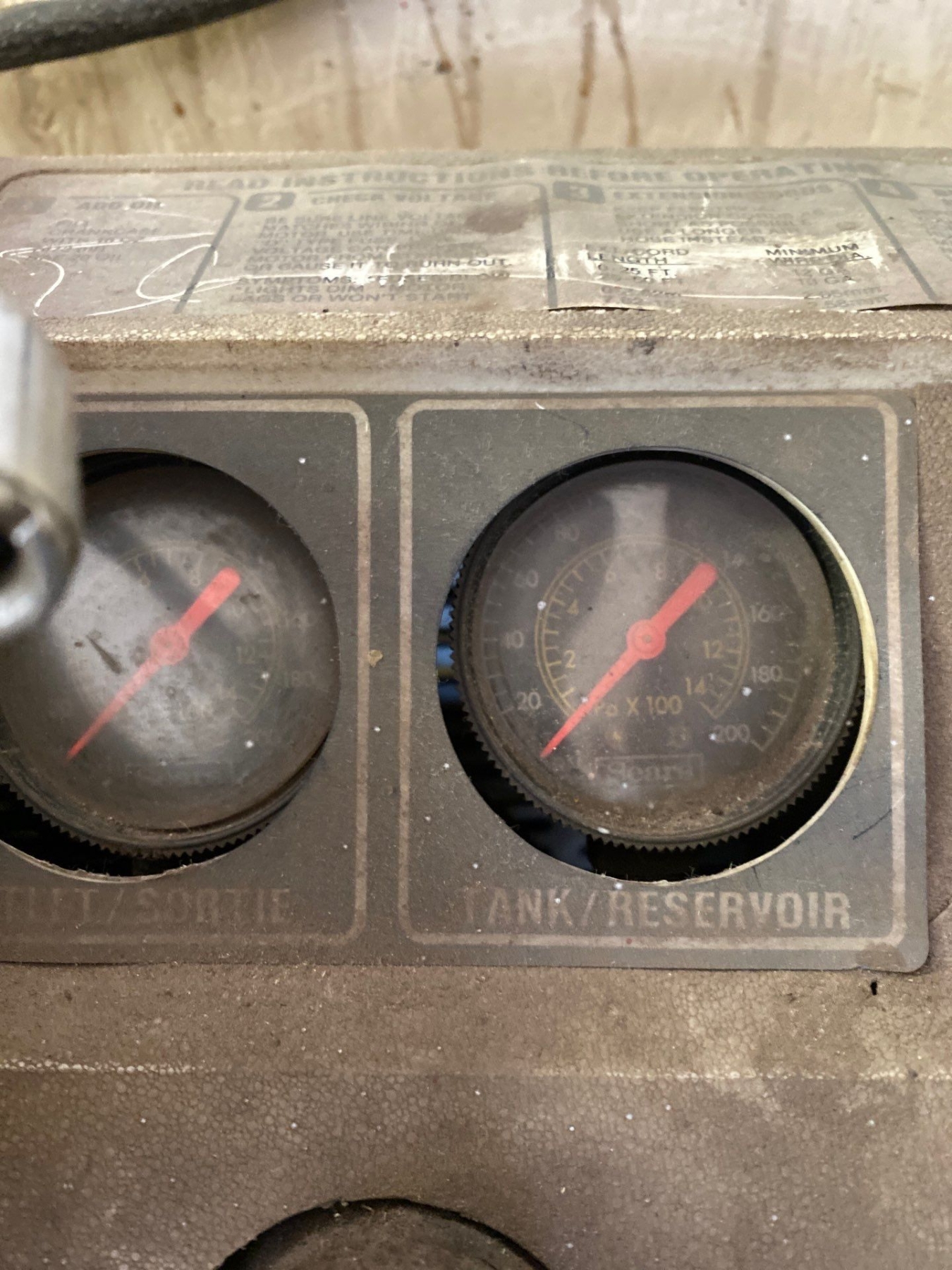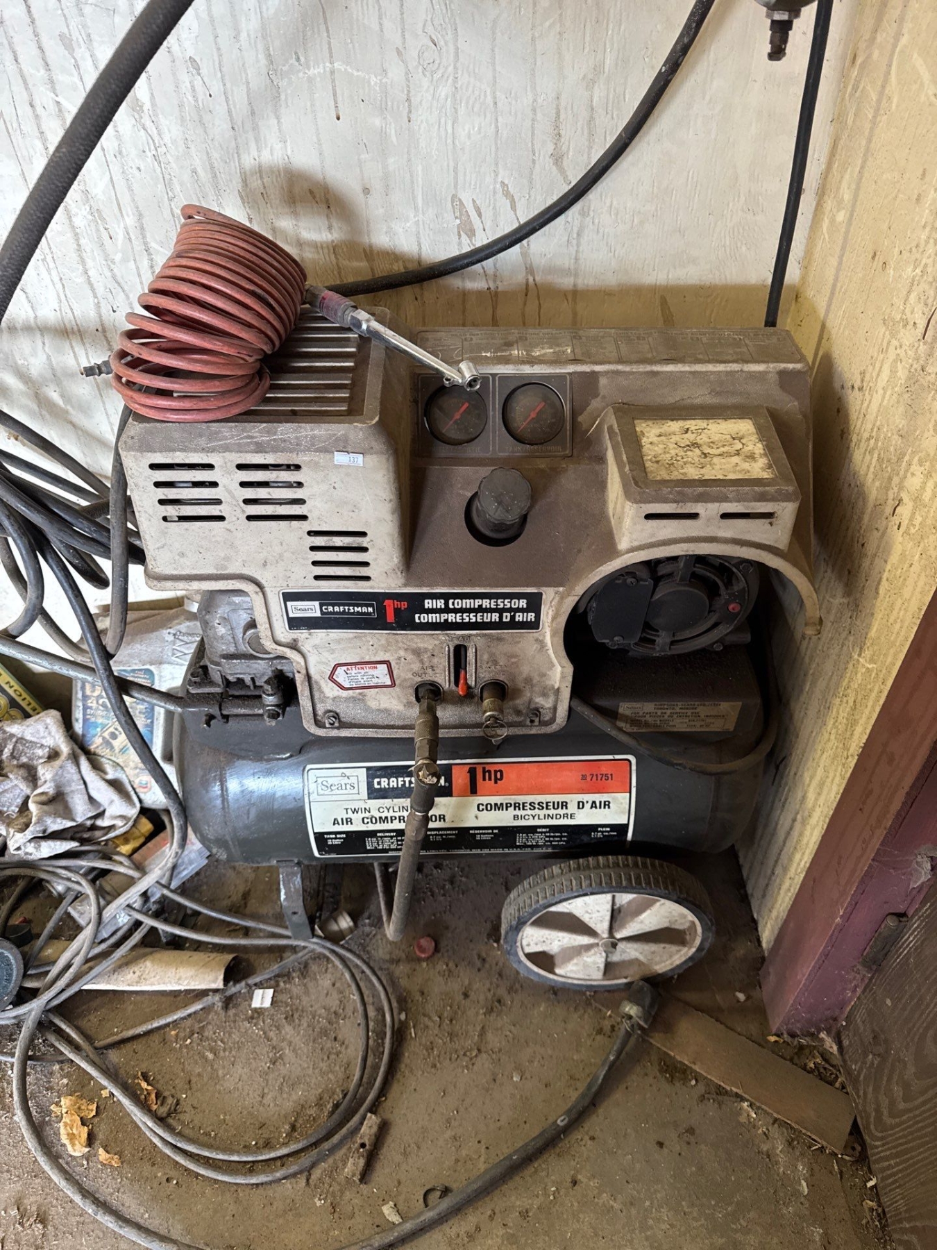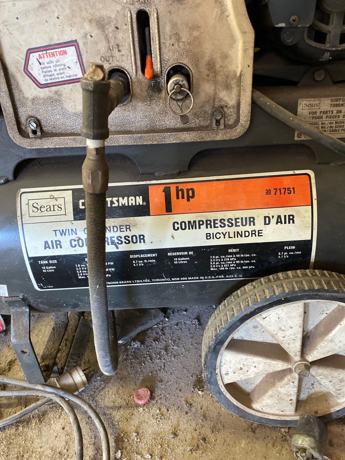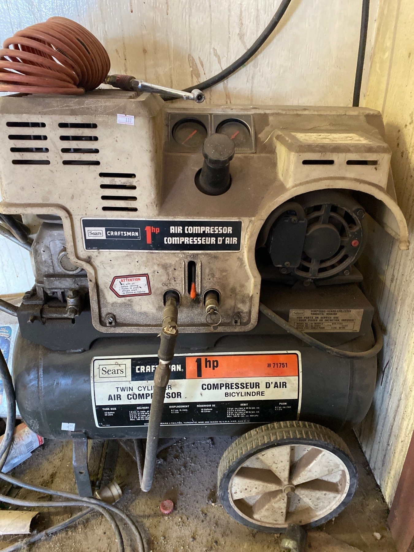 Sears craftsman one horsepower air compressor twin cylinder with wheels gauges attachments works great and all contents in corner included