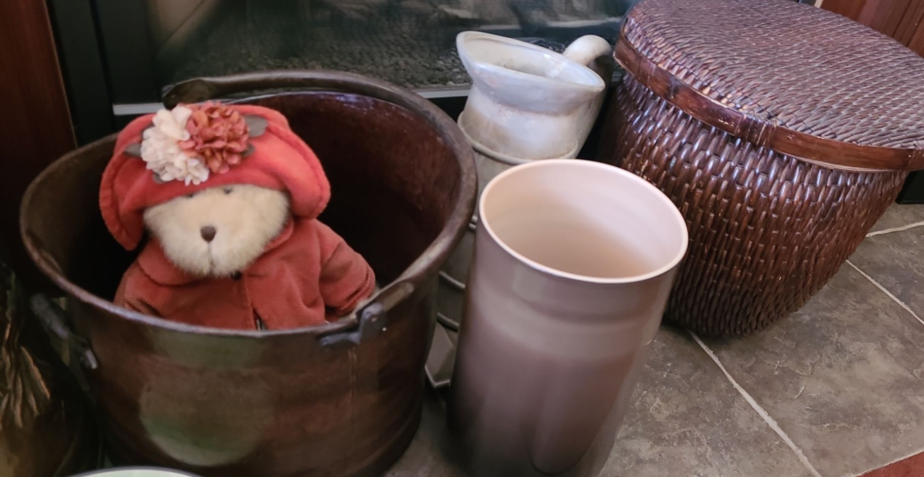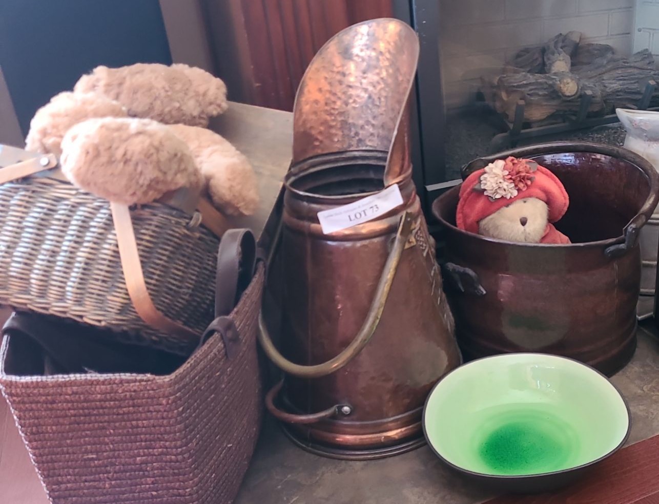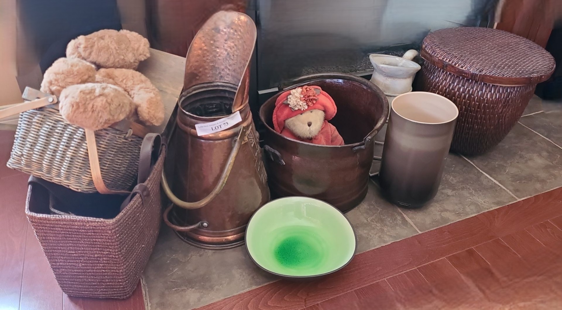 Selection of Baskets, Tallest 14 dia 13 h, Vases, Copperware Tallest 20 h, Teddy Bears & more