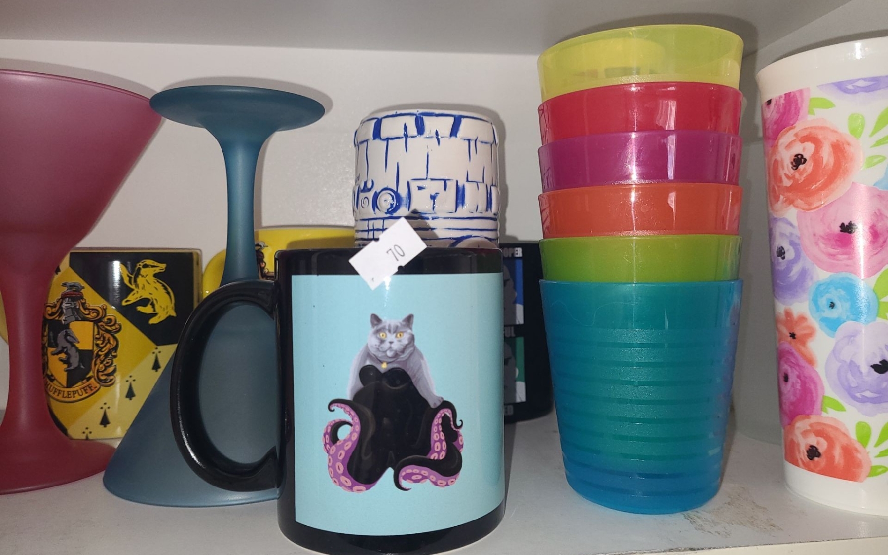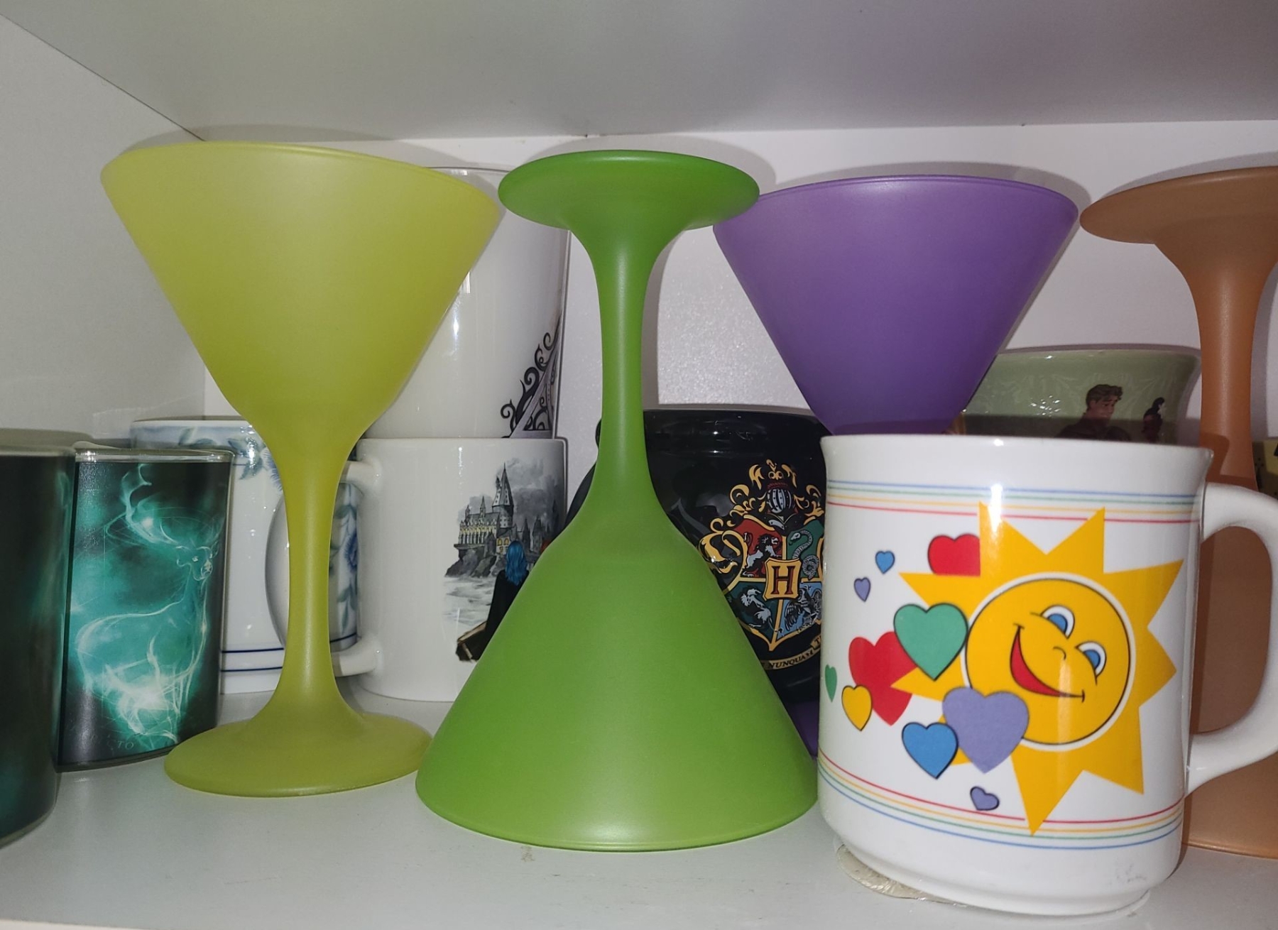 Selection of Drinkware Including: Colorful Martini Glasses, Mugs, and Tumblers