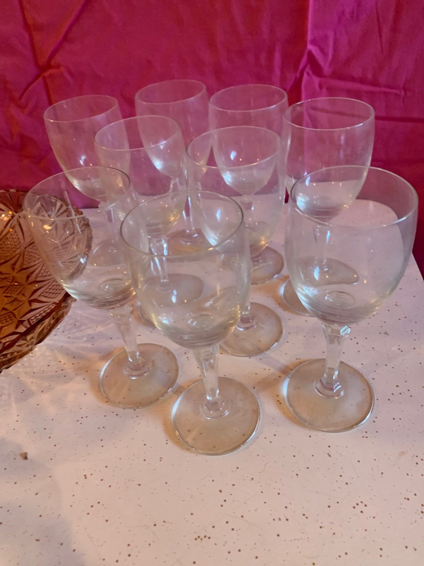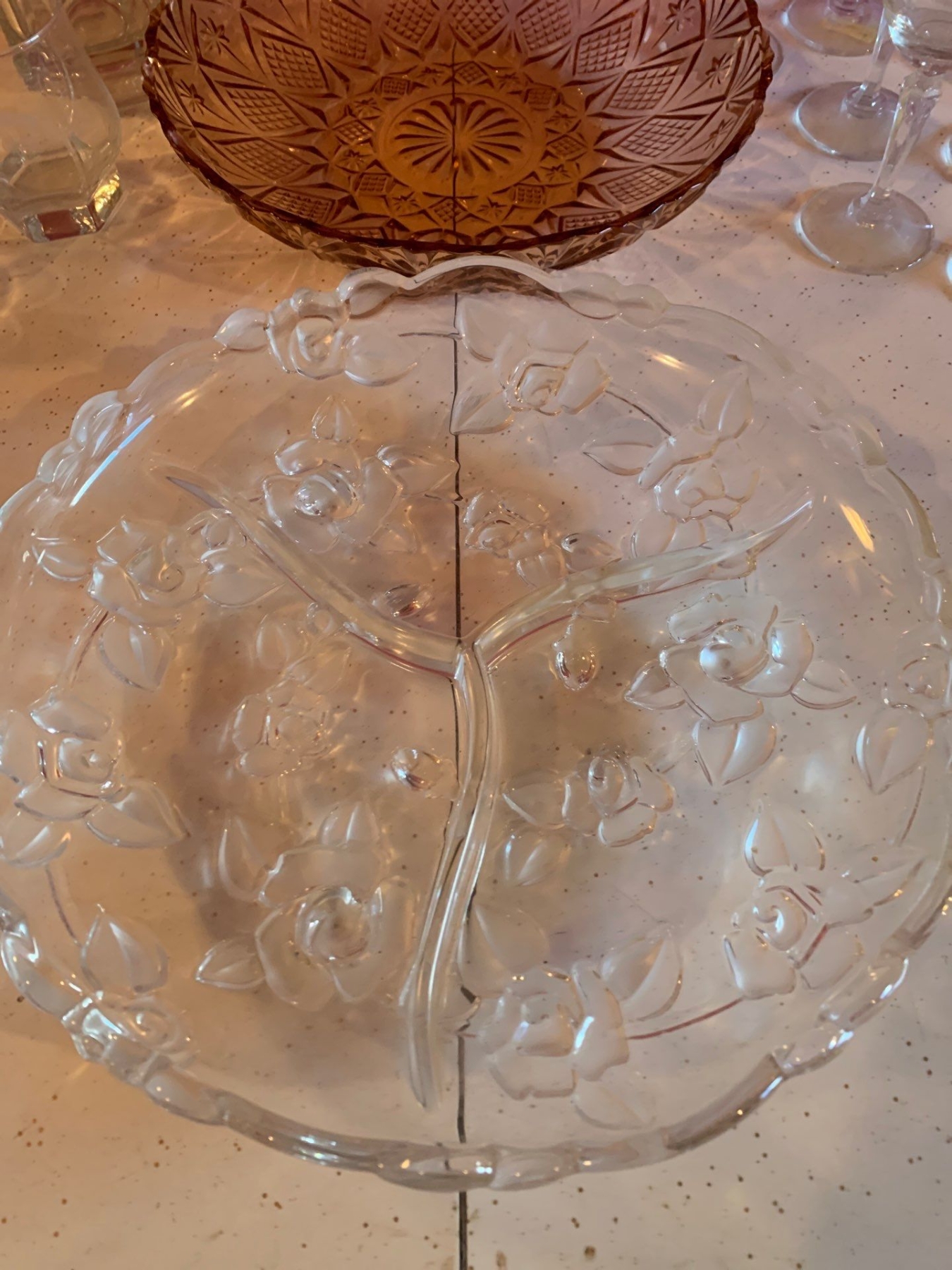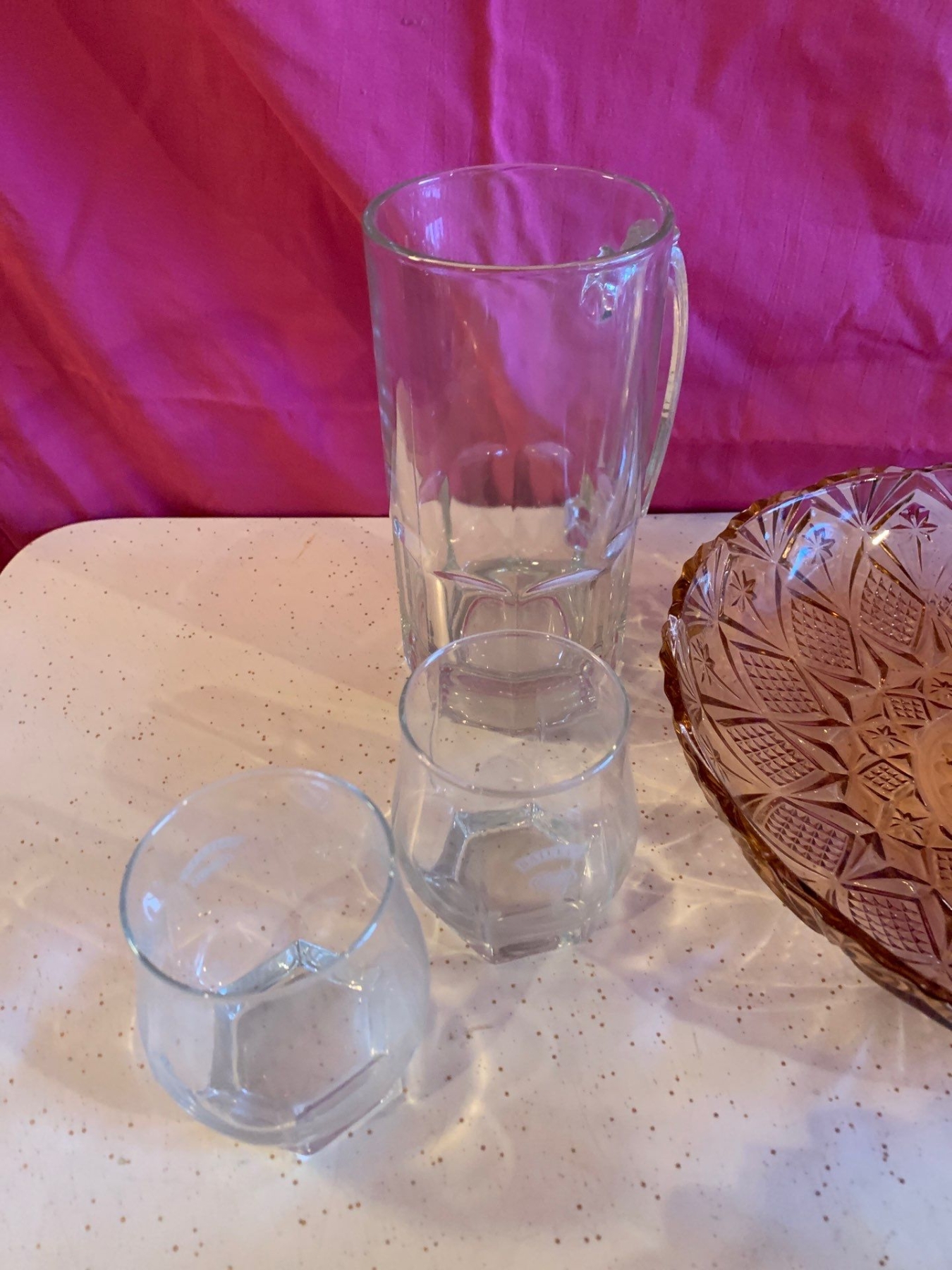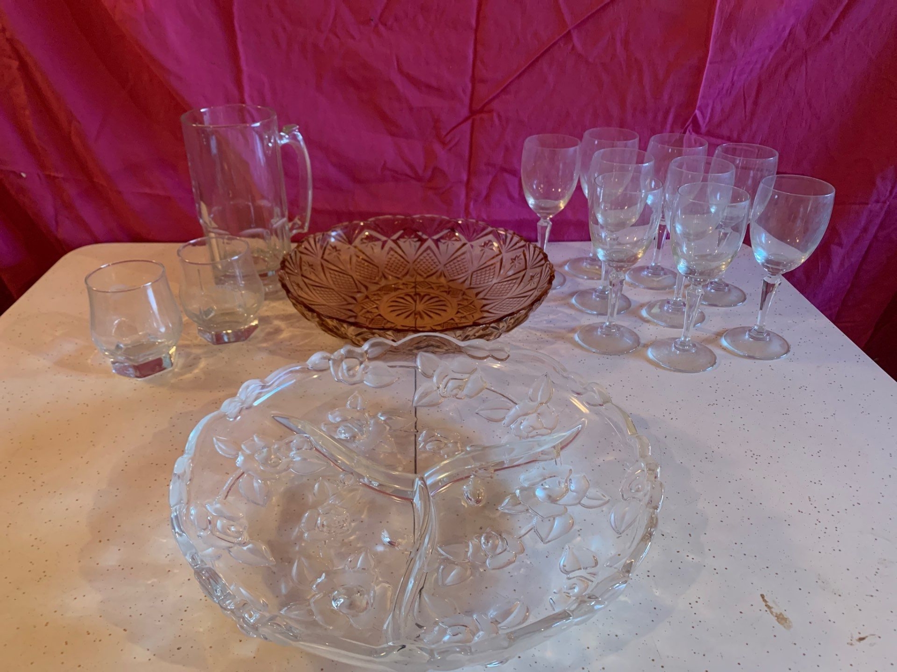 Serving Wear Lot, two crystal serving dishes, wine glasses and mugs