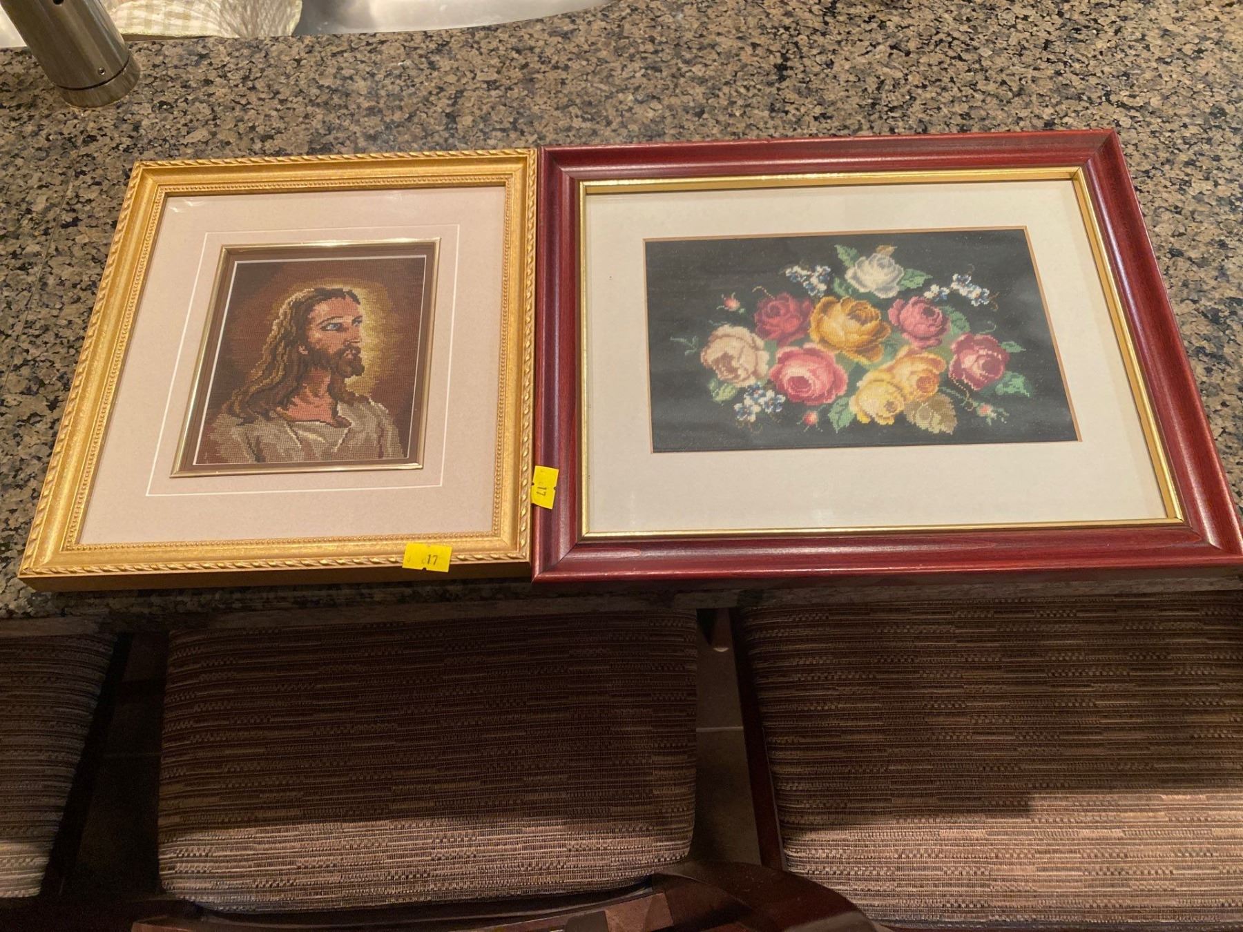 Set Of Framed Embroidery Jesus 9.5 x 10.5 And Floral Arrangment 13.5 x 12