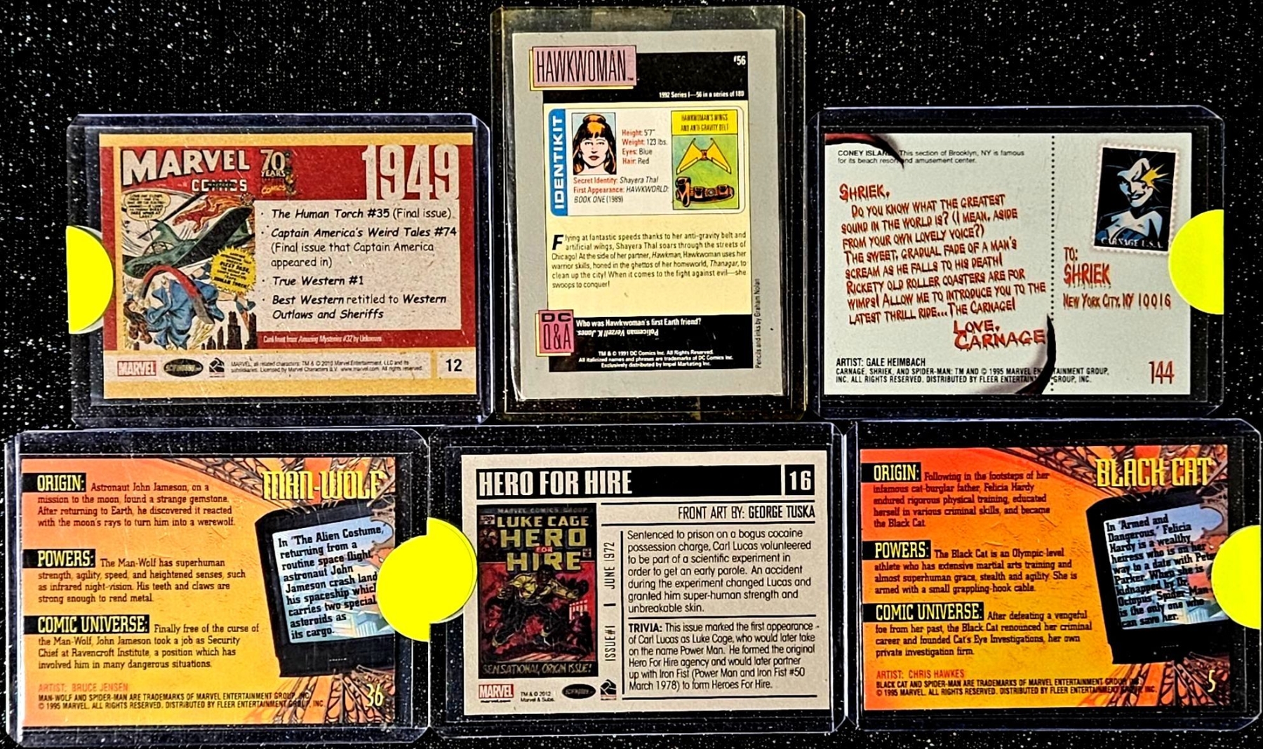 Features 5 Character Cards in plastic protective cases. Includes Marvel's Venom, Spider-Man, Black Cat, Man-Wolf, and DC's Hawkwoman.