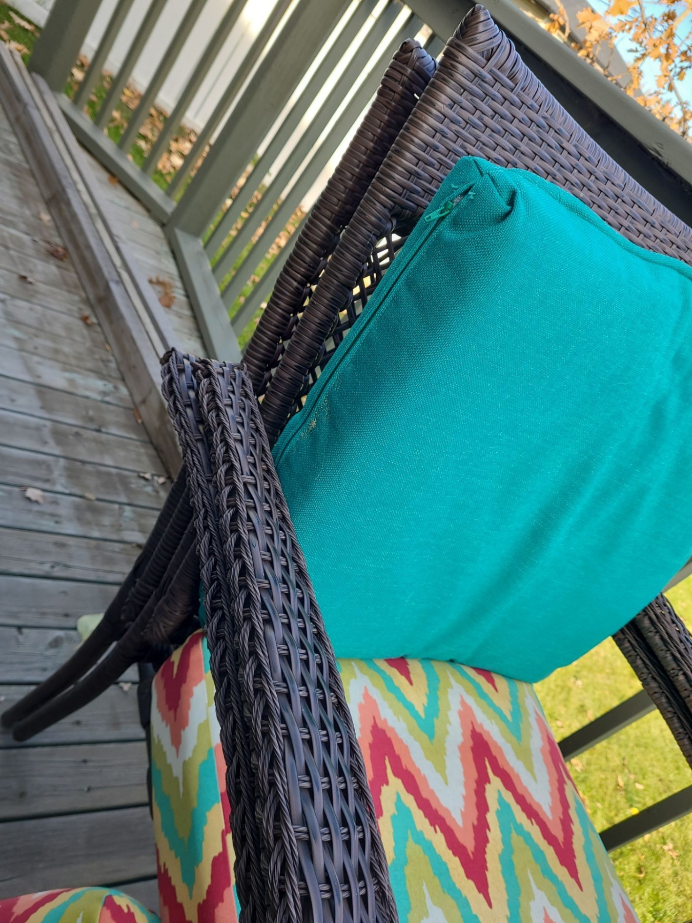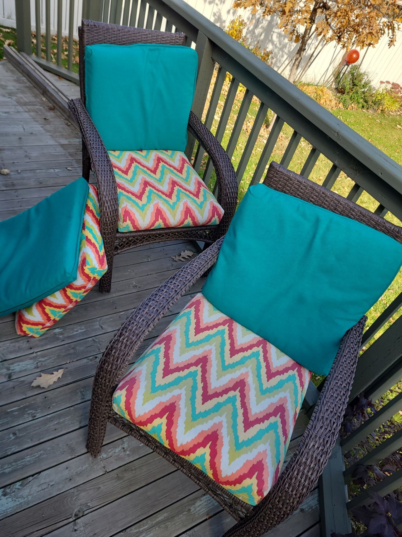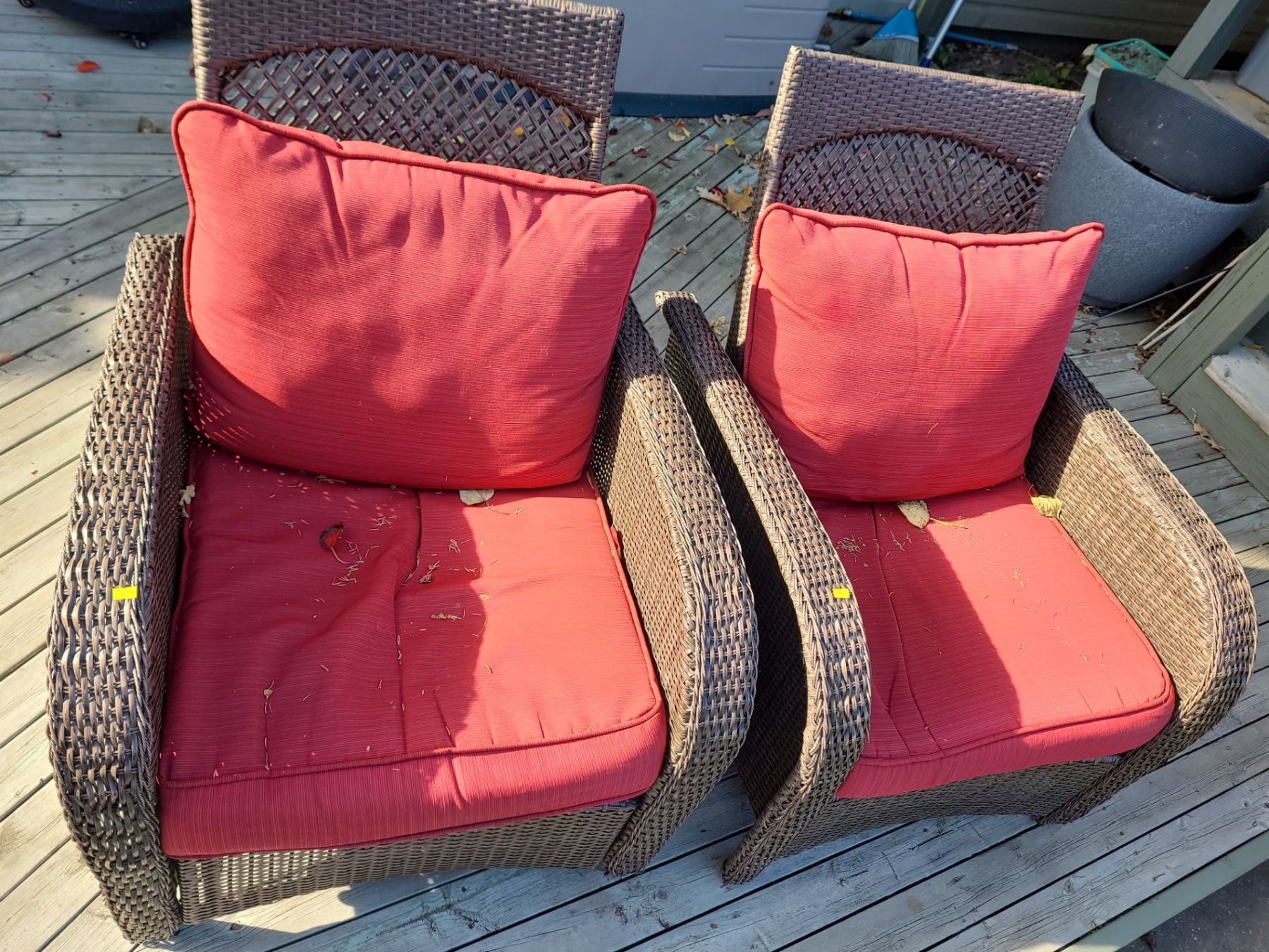 Set of 6 Patio Chairs with Mismatched Cushions (2X Armchair 38"T, 31"W, 26"D) and 4 Side Chairs