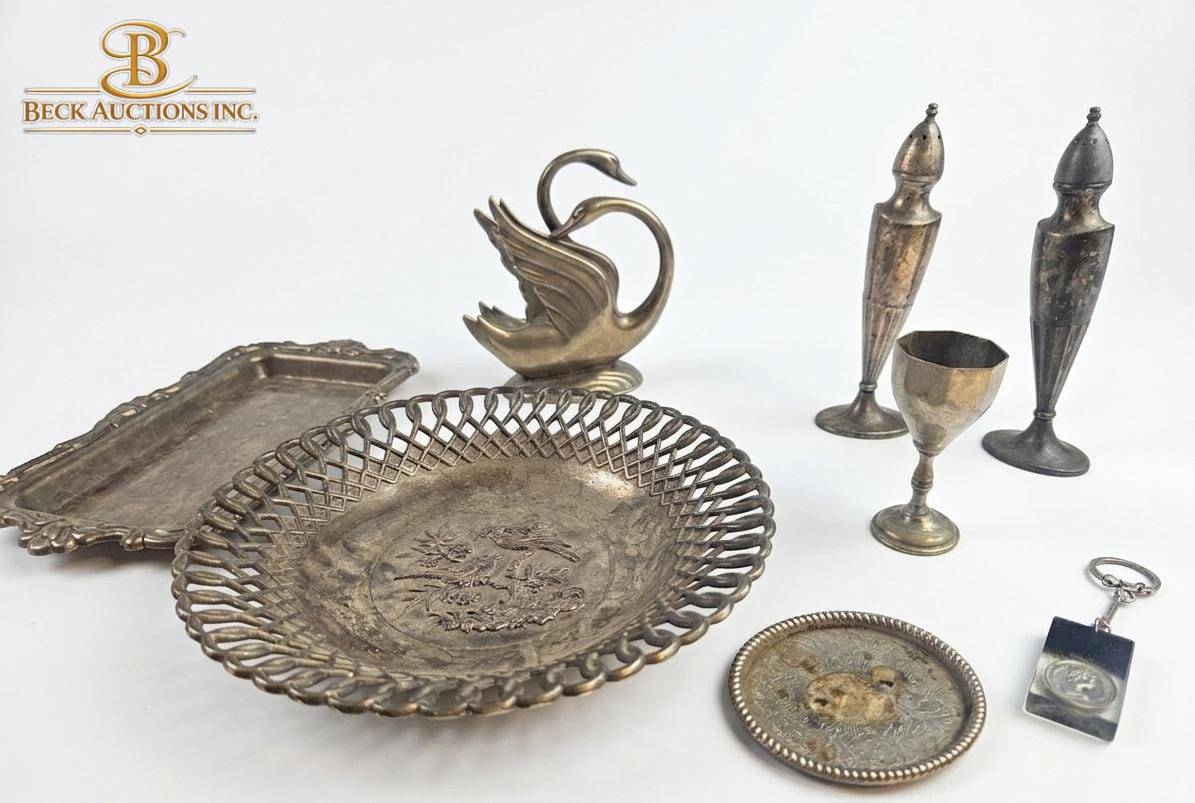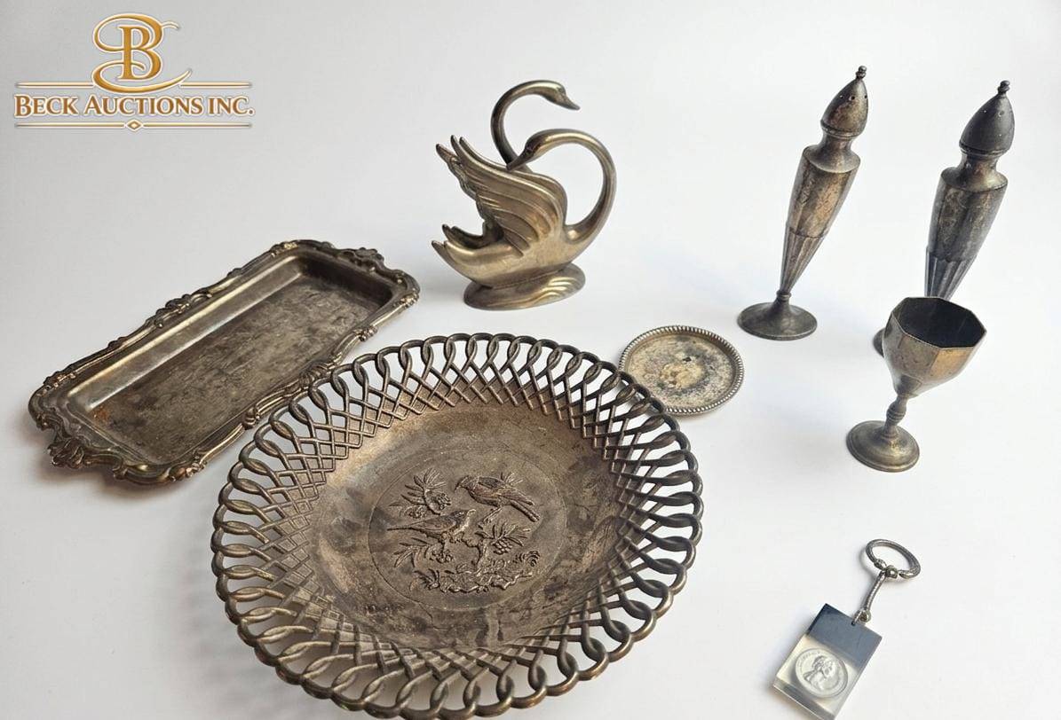 This assorted collection includes an array of silver-plated decorative items, perfect for adding a touch of charm to any display. The set features a swan-shaped vessel (approximately 5 x 4 in), a filigree-designed plate (10 in diameter), two slender goblet-shaped salt and pepper shakers (7 in tall), a miniature chalice (3 in tall), a small tray (7 x 4 in), and a compact circular mirrored piece (3 in diameter). This collection showcases versatile designs, ideal for collectors or as statement pieces.