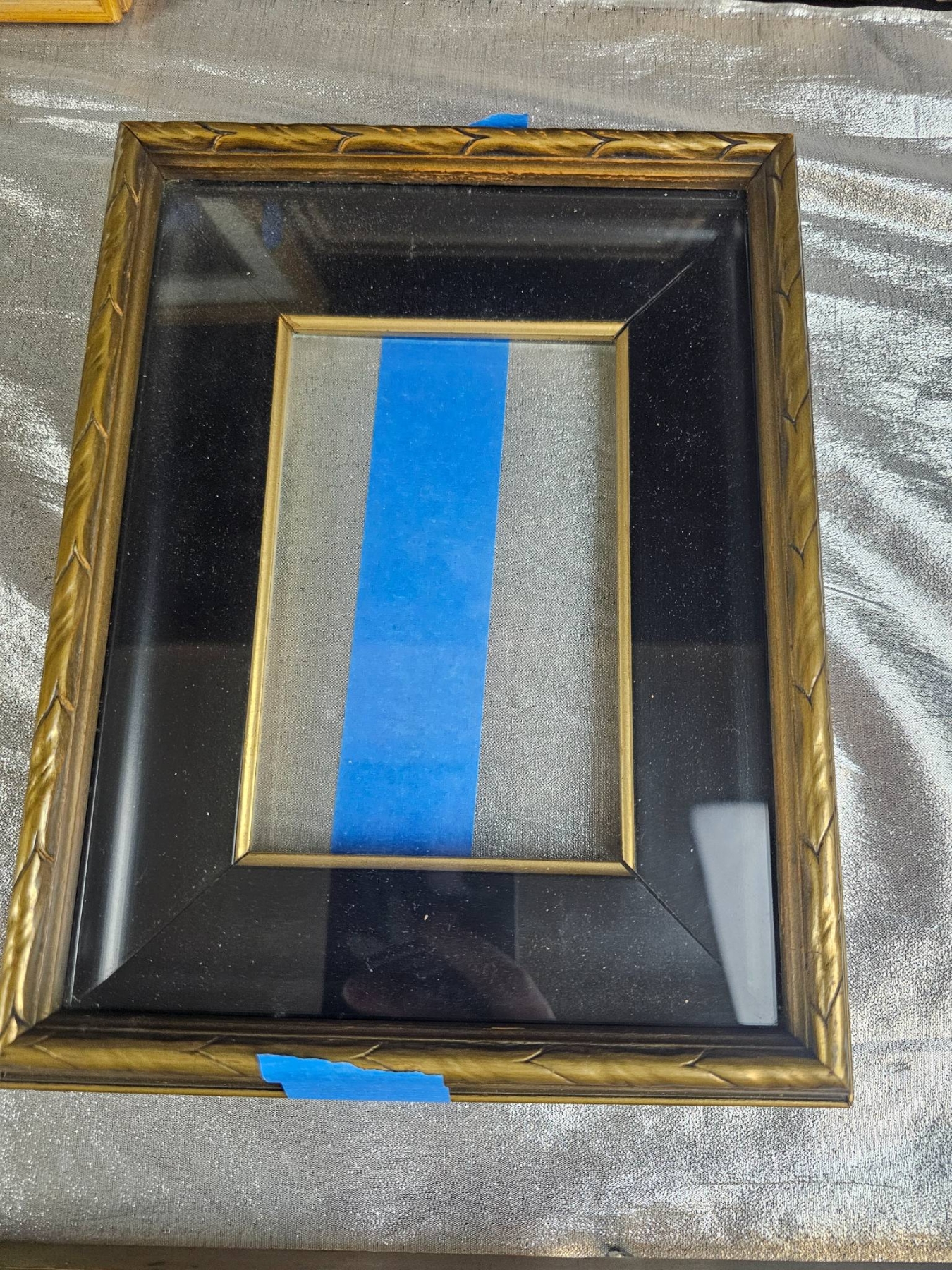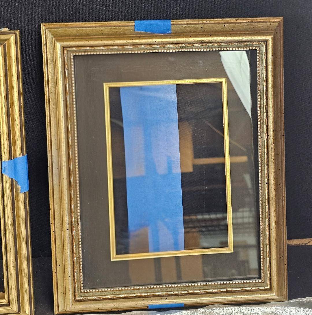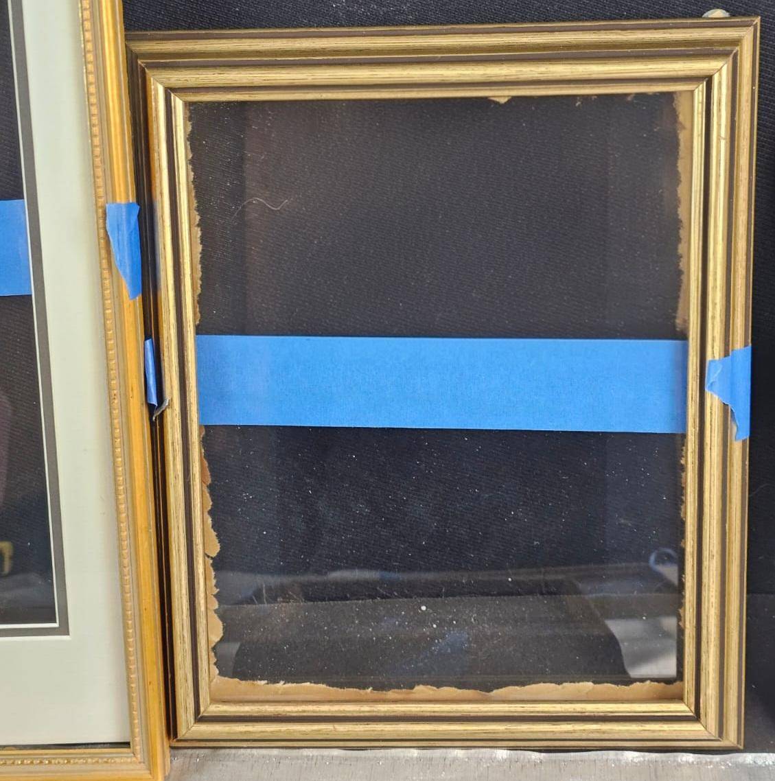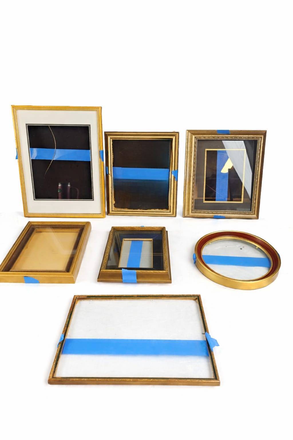 Seven picture frames featuring a mix of gold, wood, and metal finishes with diverse profiles and designs. The collection includes rectangular and circular forms, with most frames showcasing intricate detailing. Some frames include mats and glass, while others are open. Minor wear visible, and one frame has a cracked glass panel. Varied sizes to accommodate different artwork or photographs. 9 to 14 inches height