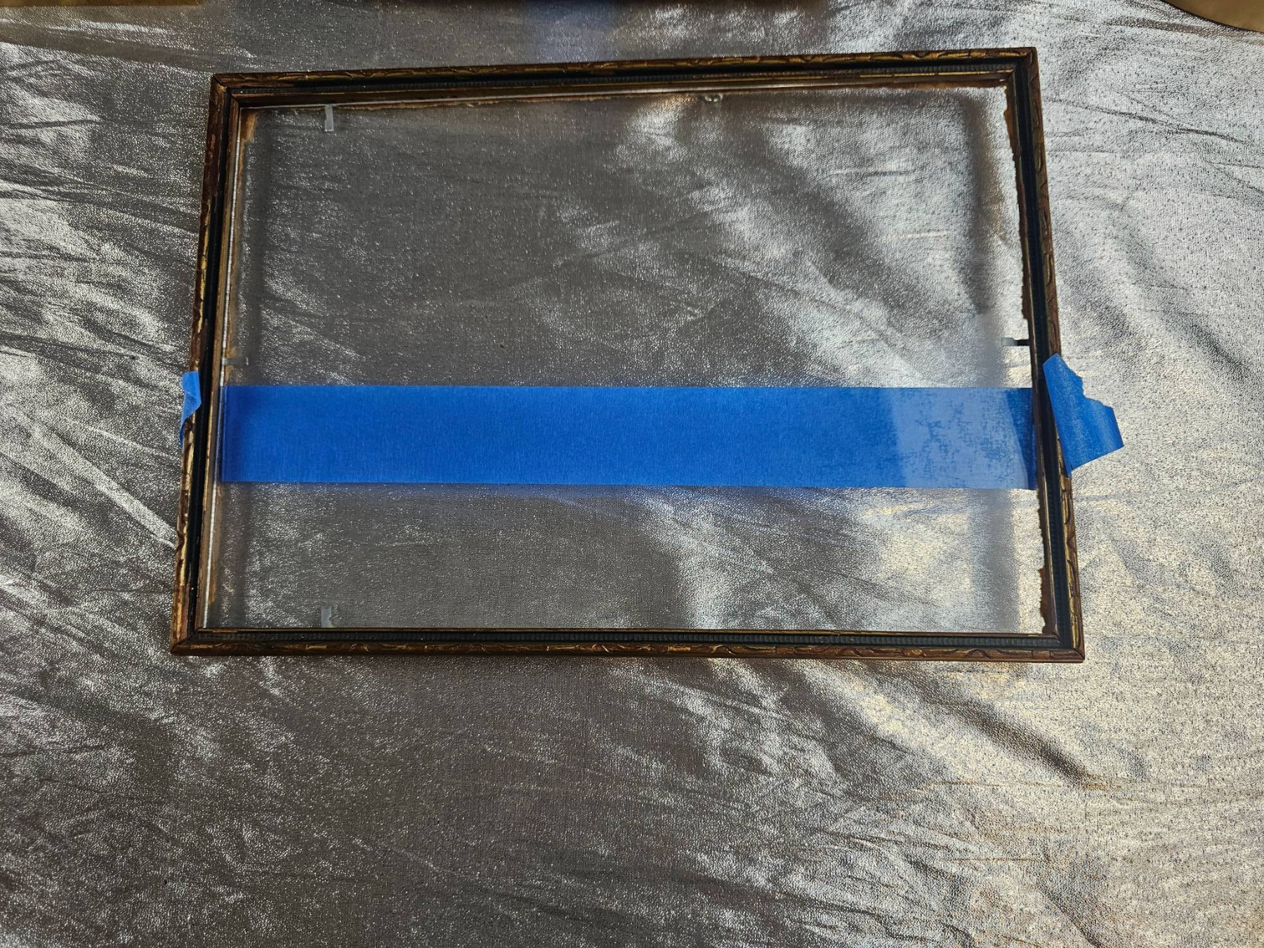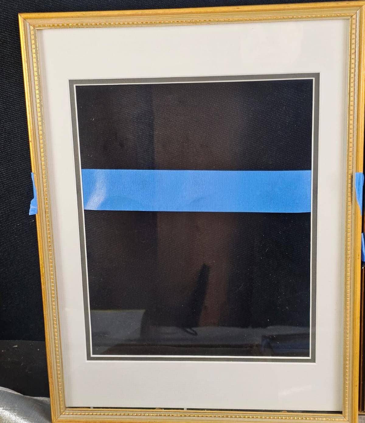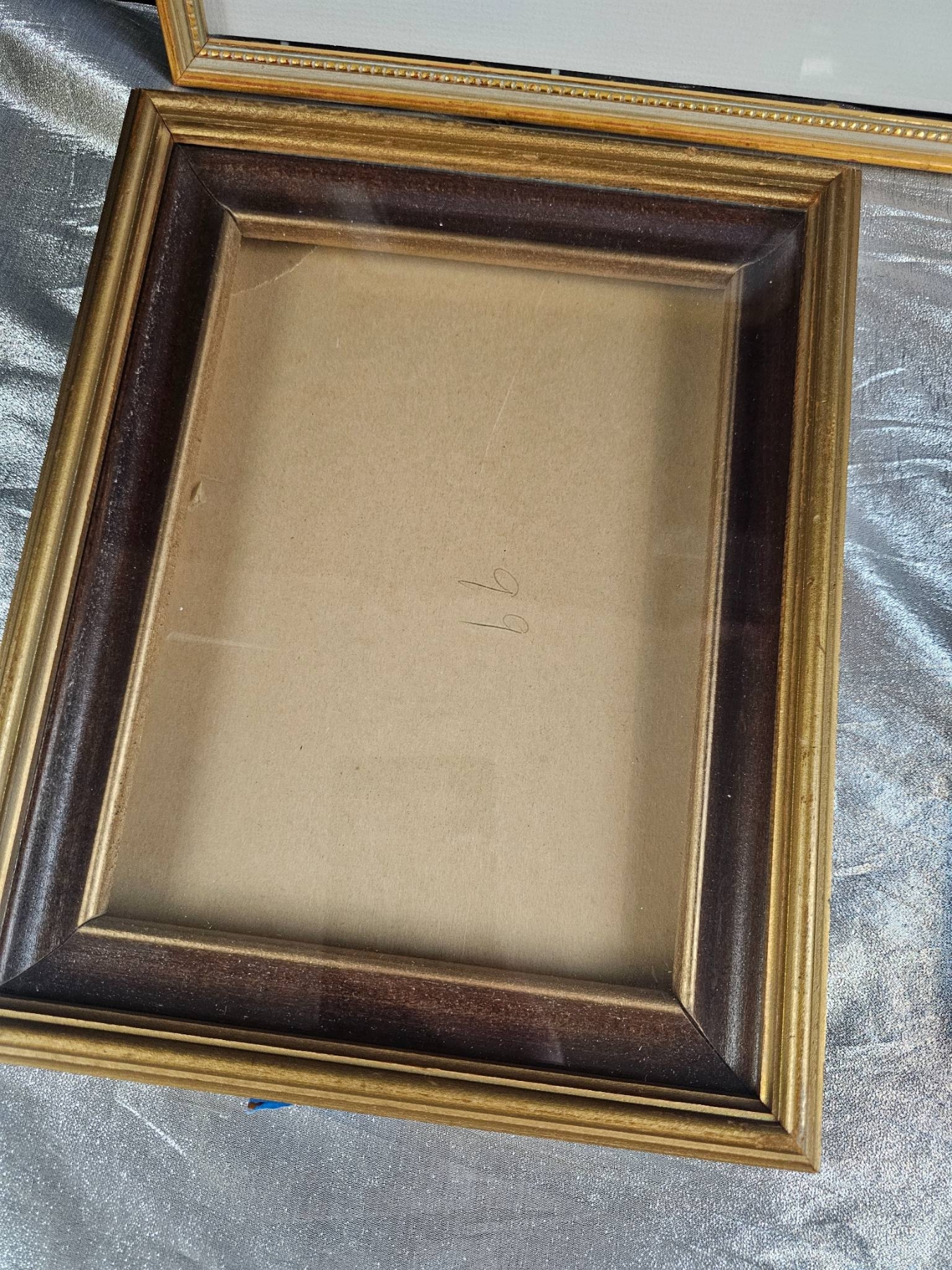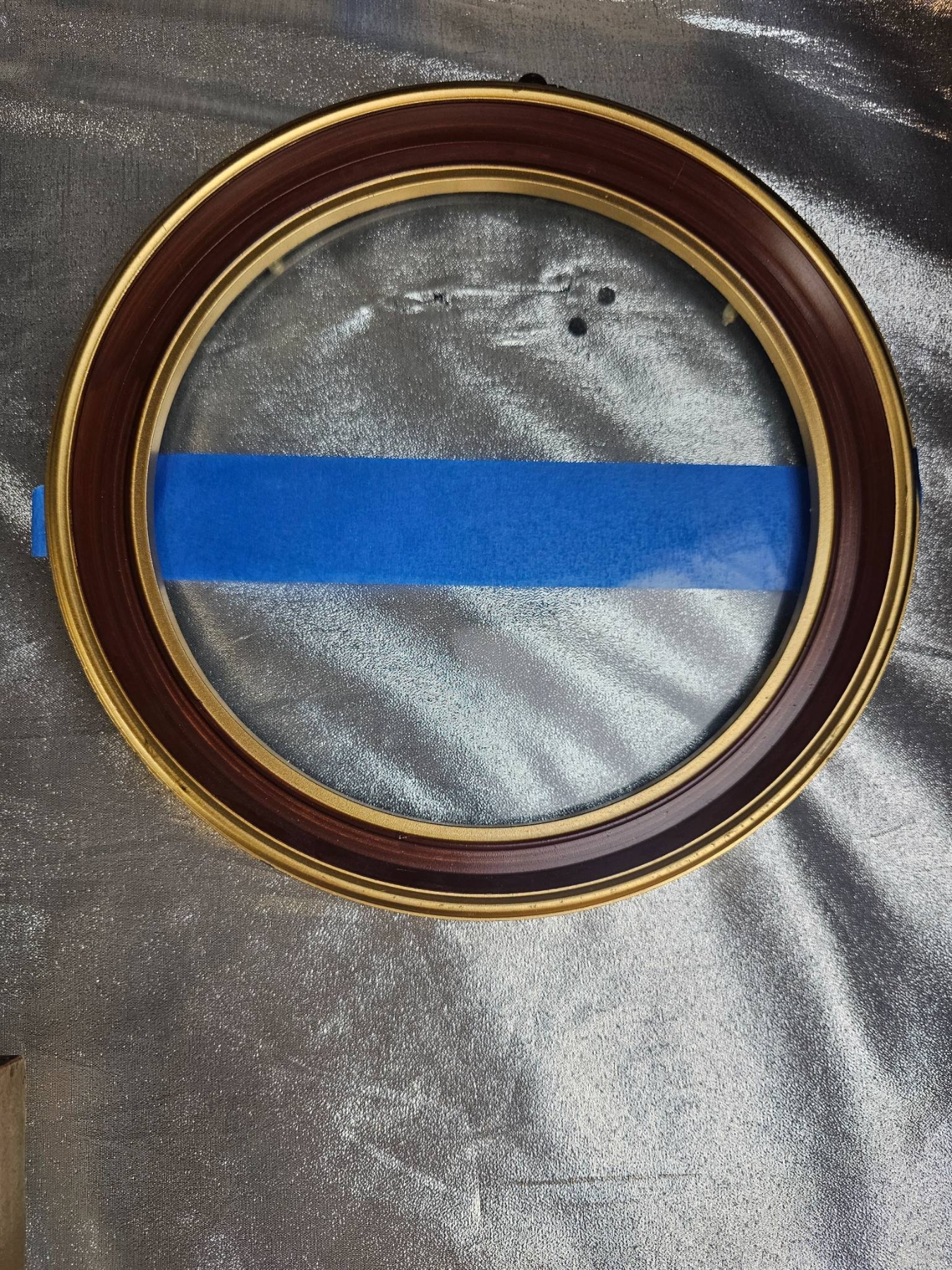 Seven picture frames featuring a mix of gold, wood, and metal finishes with diverse profiles and designs. The collection includes rectangular and circular forms, with most frames showcasing intricate detailing. Some frames include mats and glass, while others are open. Minor wear visible, and one frame has a cracked glass panel. Varied sizes to accommodate different artwork or photographs. 9 to 14 inches height